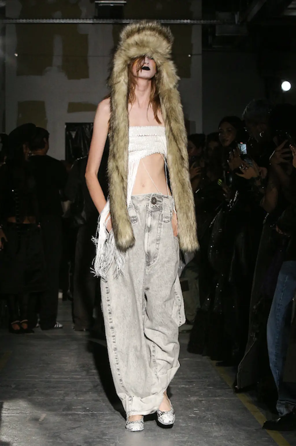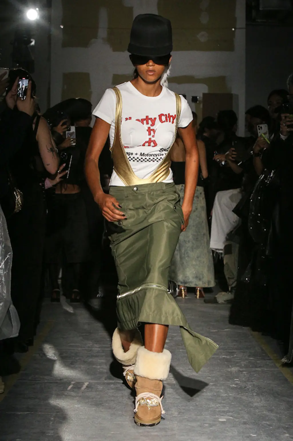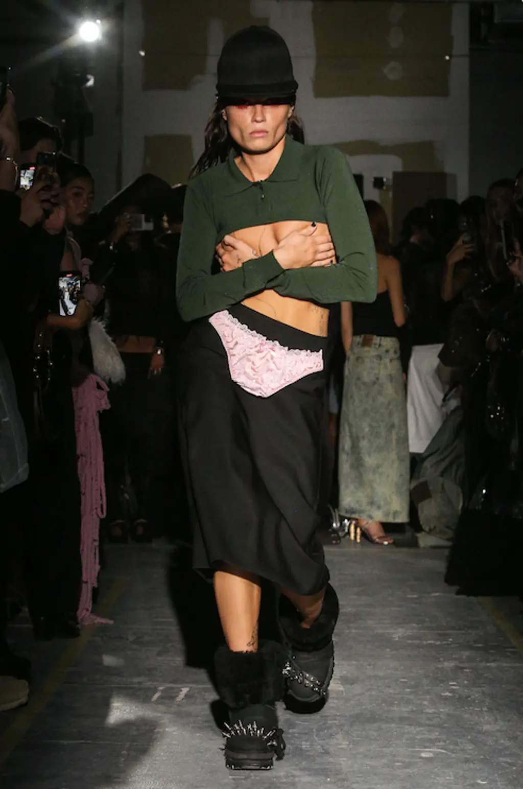Big sunglasses. Fur stoles. Fishnet bodysuits. Clothes for celebrities who complain about fame but really they love it. Styled by THE FACE’s US Fashion Director-at-Large Emma Wyman, the collection took inspiration from the problematic heyday of ‘90s and ‘00s paparazzi culture, with models stomping down the runway, clutching bags across their bodies with their gaze hidden by their hair, baseball caps or those shades we mentioned earlier. Editors stood at the side of the runway, holding iPhone cameras in the air like fans crowding a red carpet event. A trench coat and a comically oversized shirt and tie seemed to riff on burnt out businessmen barging their way to the office. There were sailor hats, school ties and a skirt made from sunglasses, too. These are audacious clothes made for living conspicuously, whether the camera’s turned on or not.