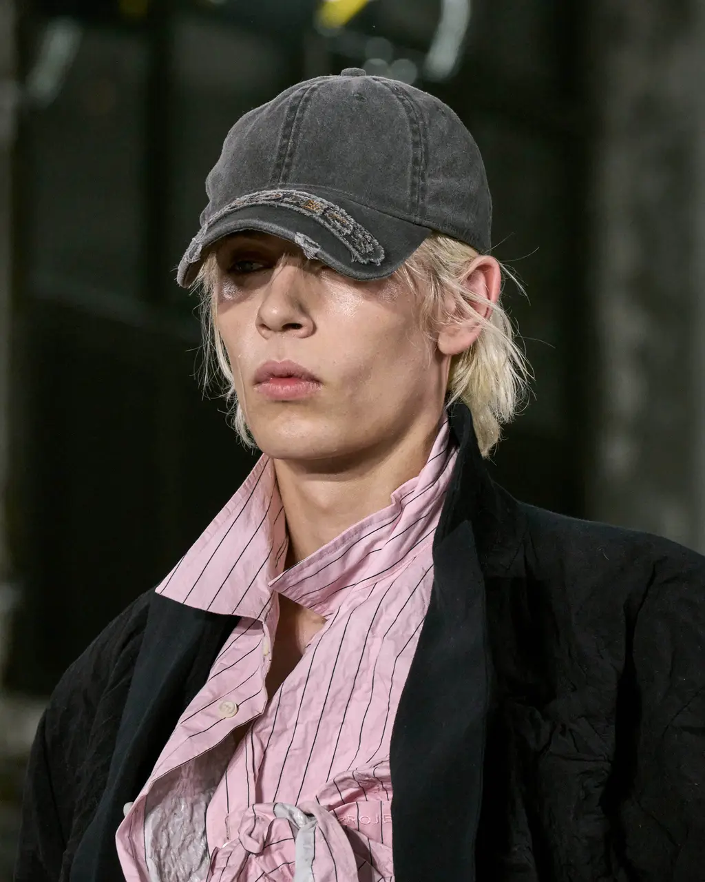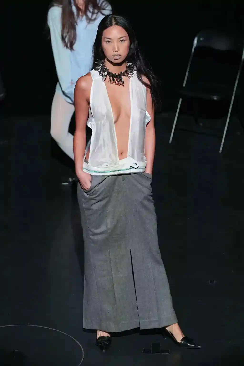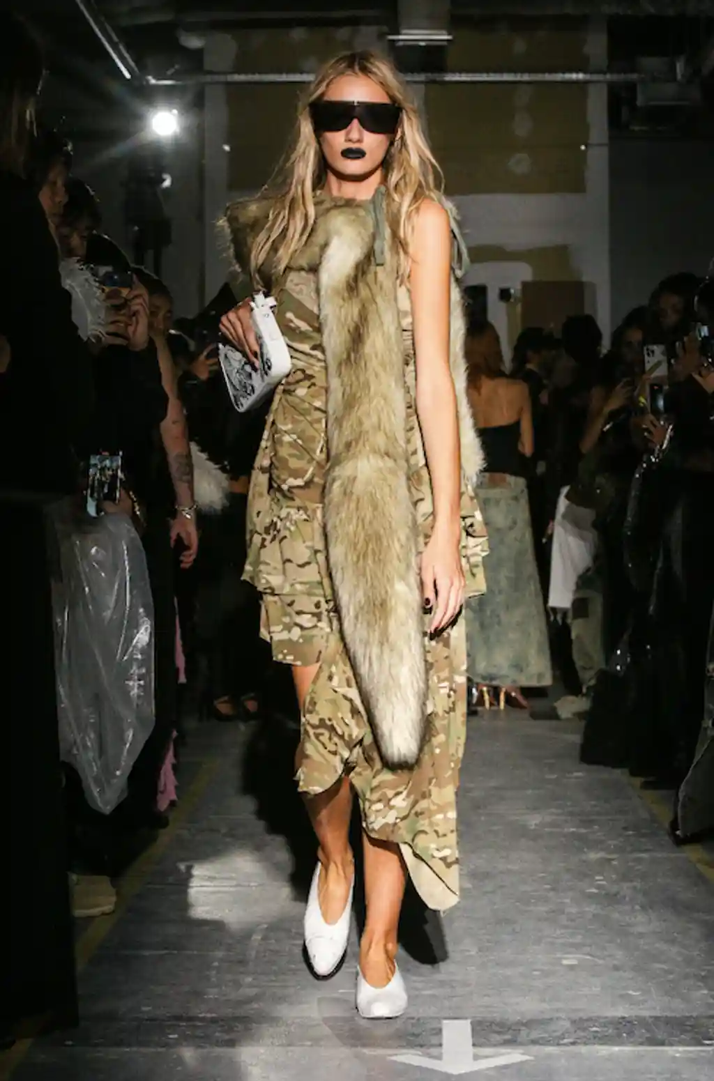 Big sunglasses. Fur stoles. Fishnet bodysuits. Clothes for celebrities who complain about fame but really they love it. Styled by THE FACE’s US Fashion Director-at-Large Emma Wyman, the collection took inspiration from the problematic heyday of ‘90s and ‘00s paparazzi culture, with models stomping down the runway, clutching bags across their bodies with their gaze hidden by their hair, baseball caps or those shades we mentioned earlier. Editors stood at the side of the runway, holding iPhone cameras in the air like fans crowding a red carpet event. A trench coat and a comically oversized shirt and tie seemed to riff on burnt out businessmen barging their way to the office. There were sailor hats, school ties and a skirt made from sunglasses, too. These are audacious clothes made for living conspicuously, whether the camera’s turned on or not.