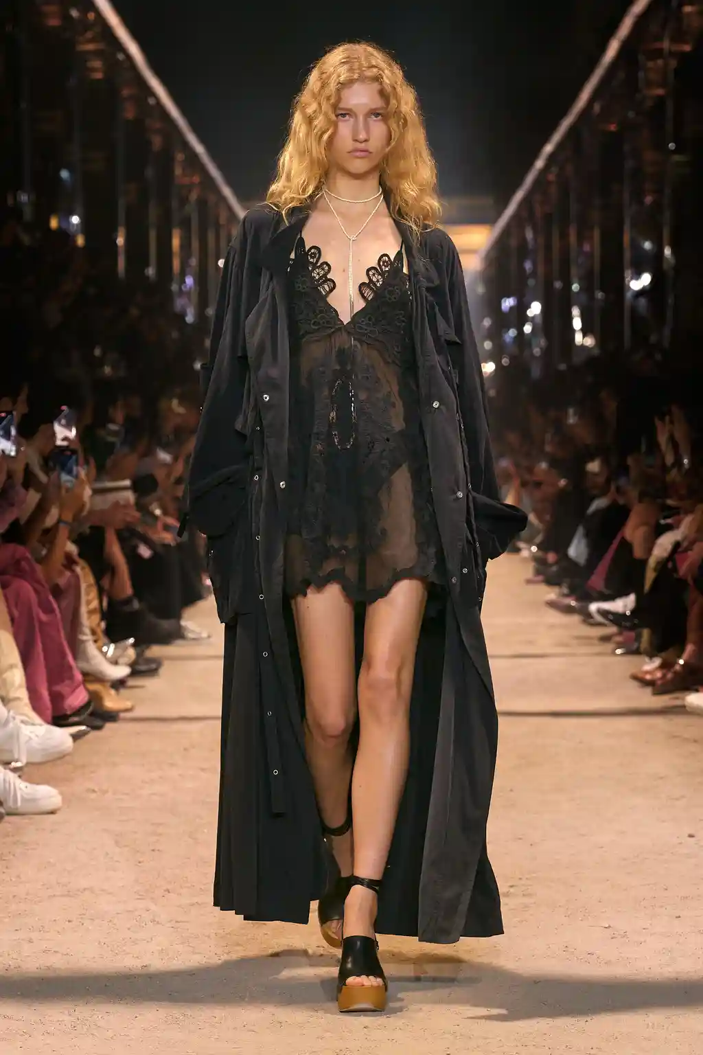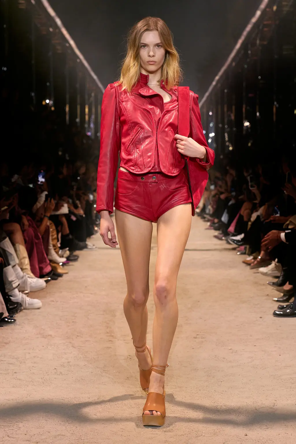 The collection took on a lightness, ushering in night time slip dresses with intricate lace collars while bringing back last season’s practically-minded focus on outerwear. Fluid parachute parkas and low-rise pocketed cargo pants brought a gorpcore element to the more ethereal femme moments. The leather pieces were equally multifaceted, with art nouveau curves configured in cropped jackets and matching hot-pants in fiery red or tan. Denim shirts and jeans were embroidered with gold thread constellations, while disco pants and skin tight jumpsuits were made for an indie sleaze night on the town. Meanwhile, wedge clogs grounded proceedings, giving way to lace-up boots for the boys. All this was drenched in a nightclub blue glow, tempting guests with the promise of Paris by night.