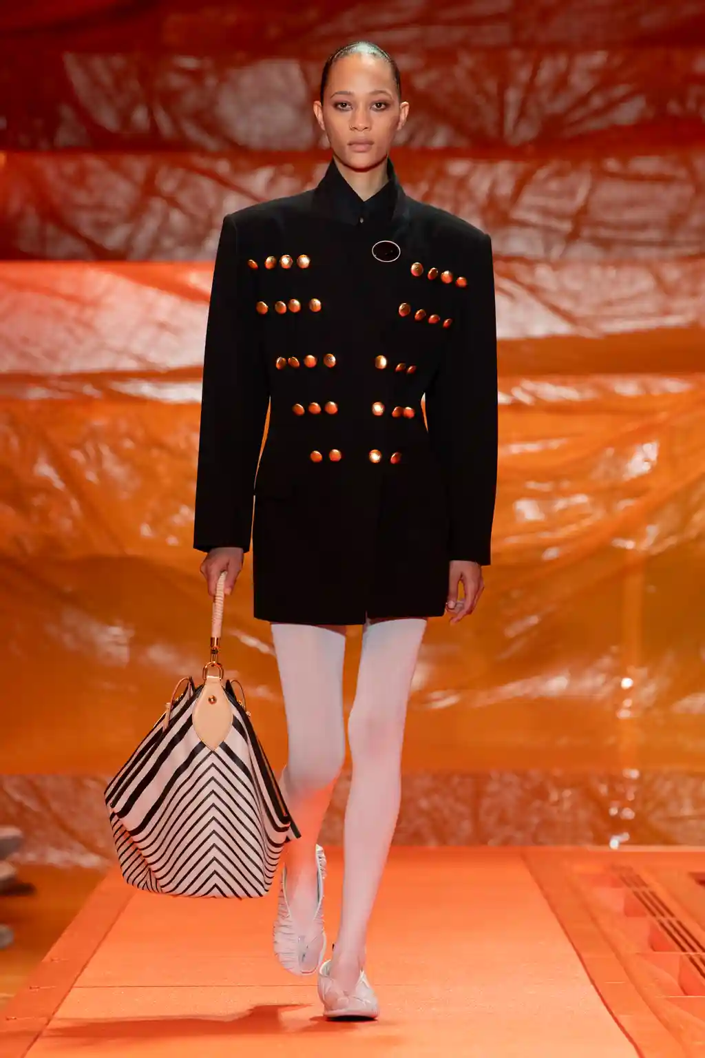 At 103 Avenue de Champs-Élysées, a building still under construction that’s set to become Paris’ new Louis Vuitton space. For the show, it was covered in orange forensic-style recycled polyethylene and the runway was custom-built by American designer James Chinlund to look like the inside of a hot air balloon. This building itself was originally constructed as a hotel to welcome international guests visiting the 1900 world’s fair.