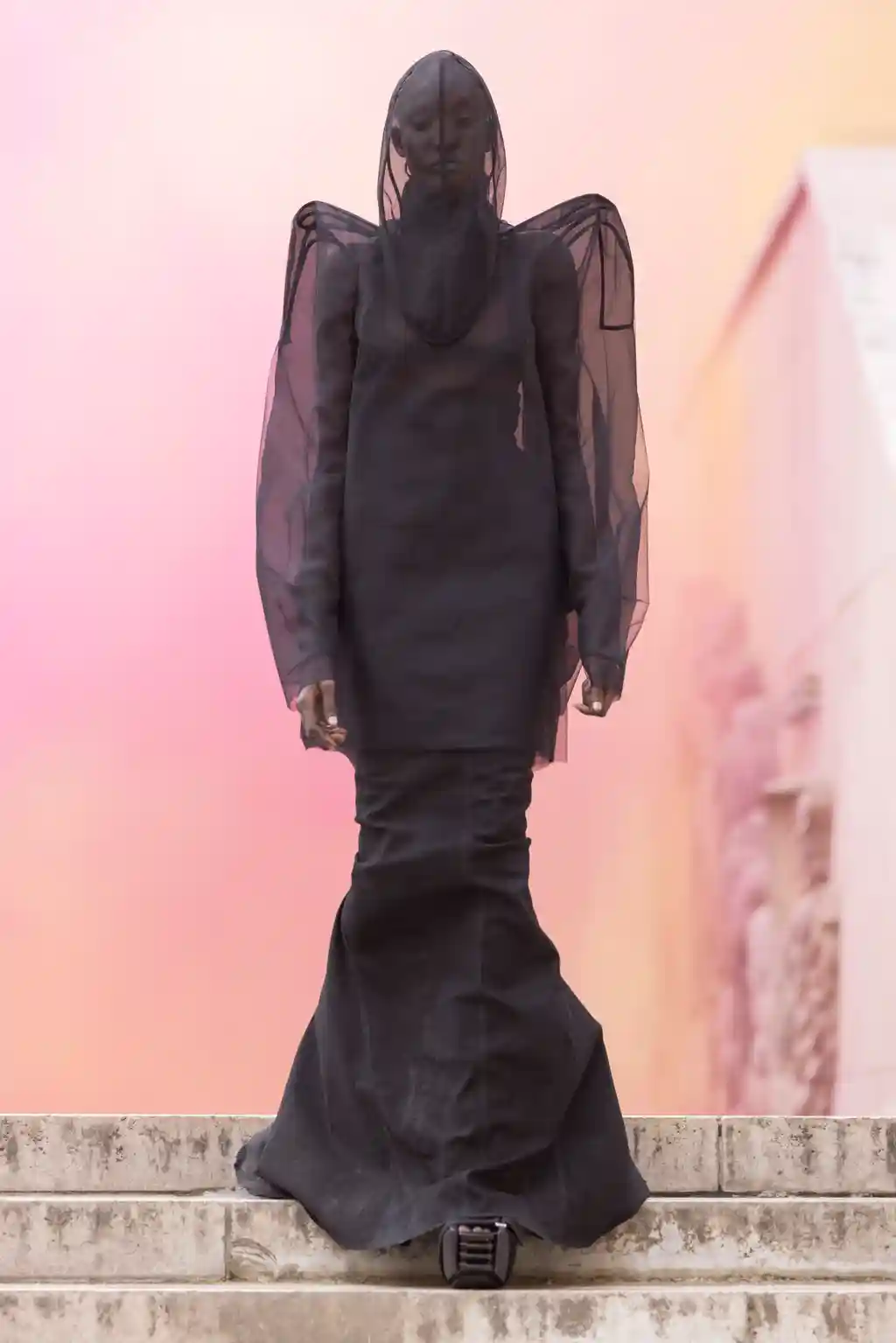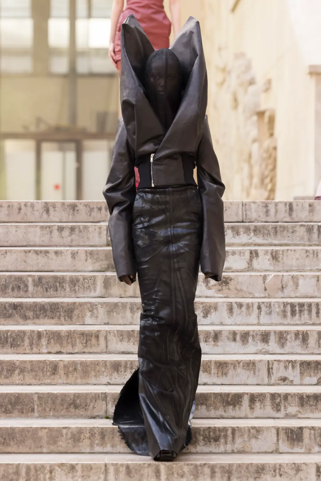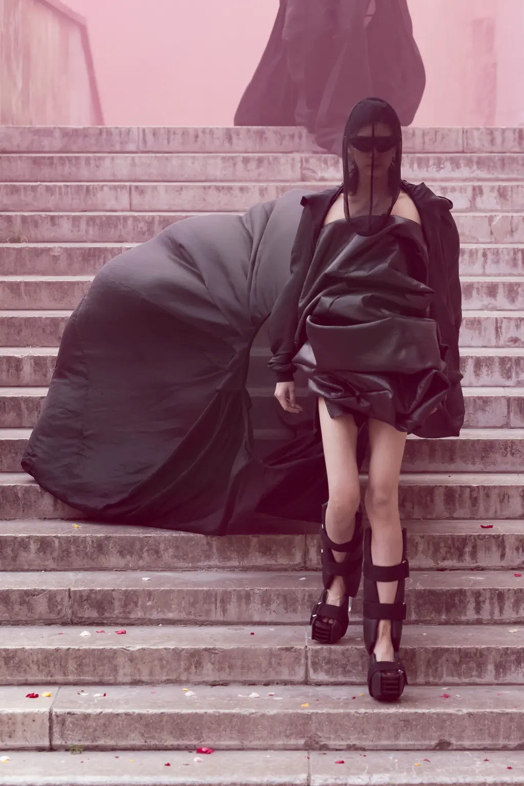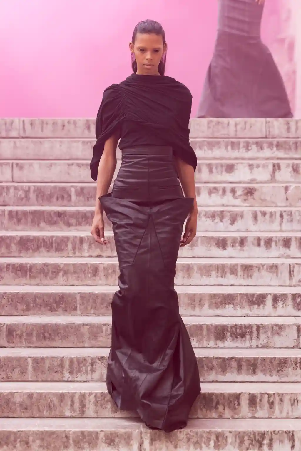 Listening to the right music can shift a bad mood, especially when you see it live. So much so that when Rick Owens, whose nickname is literally The Lord of Darkness, was at a Björk concert earlier this year, he thought, “Oh this is positive” and felt “kind of dumb for being so gloomy all the time”. So, is Rick in his happy, upbeat, colourful era? Not quite, although models did emerge from a fuchsia pink fog like goths in Barbieland. Suffice to say the clothes themselves held onto their signature darkness, with the first long, draped black gowns in jersey and leather setting the tone.