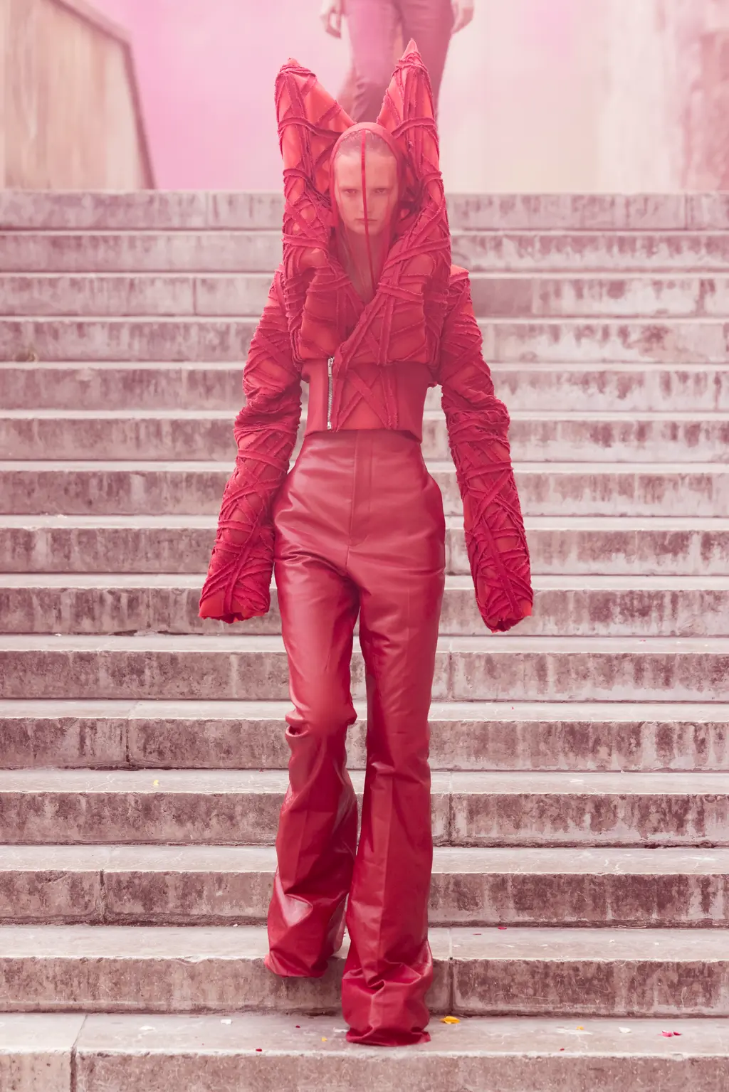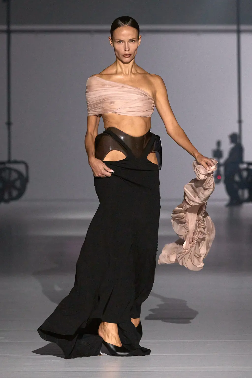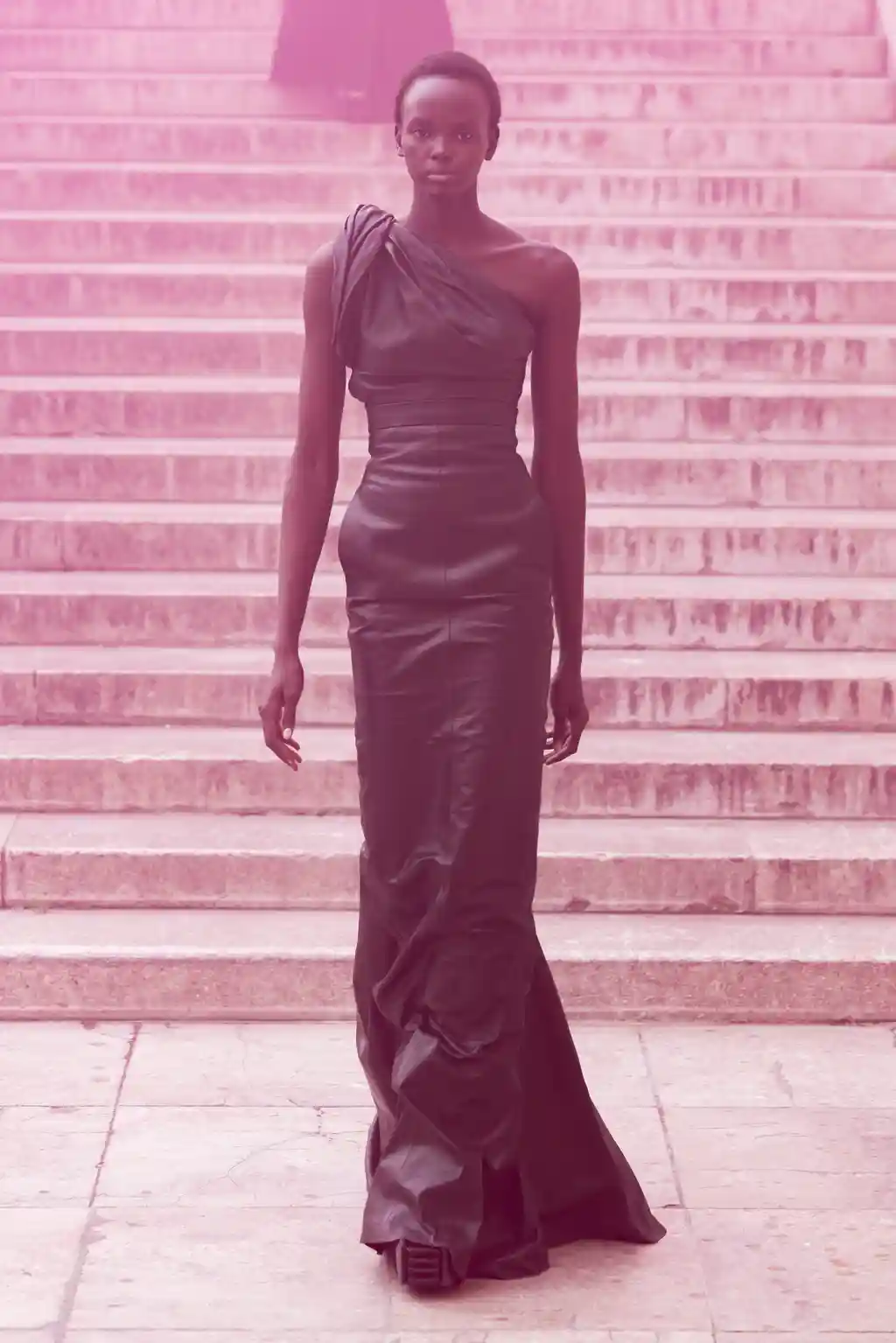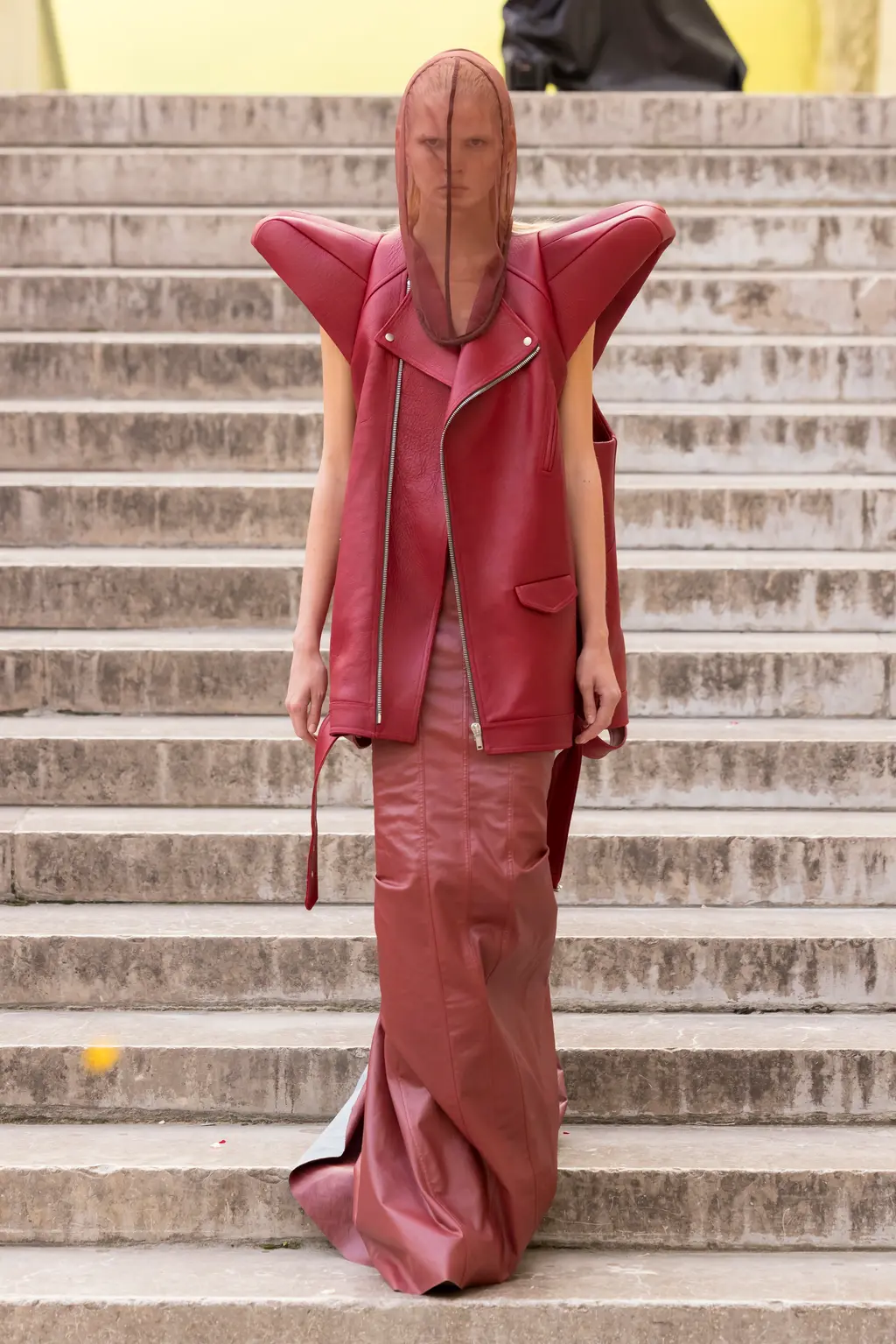 Listening to the right music can shift a bad mood, especially when you see it live. So much so that when Rick Owens, whose nickname is literally The Lord of Darkness, was at a Björk concert earlier this year, he thought, “Oh this is positive” and felt “kind of dumb for being so gloomy all the time”. So, is Rick in his happy, upbeat, colourful era? Not quite, although models did emerge from a fuchsia pink fog like goths in Barbieland. Suffice to say the clothes themselves held onto their signature darkness, with the first long, draped black gowns in jersey and leather setting the tone.