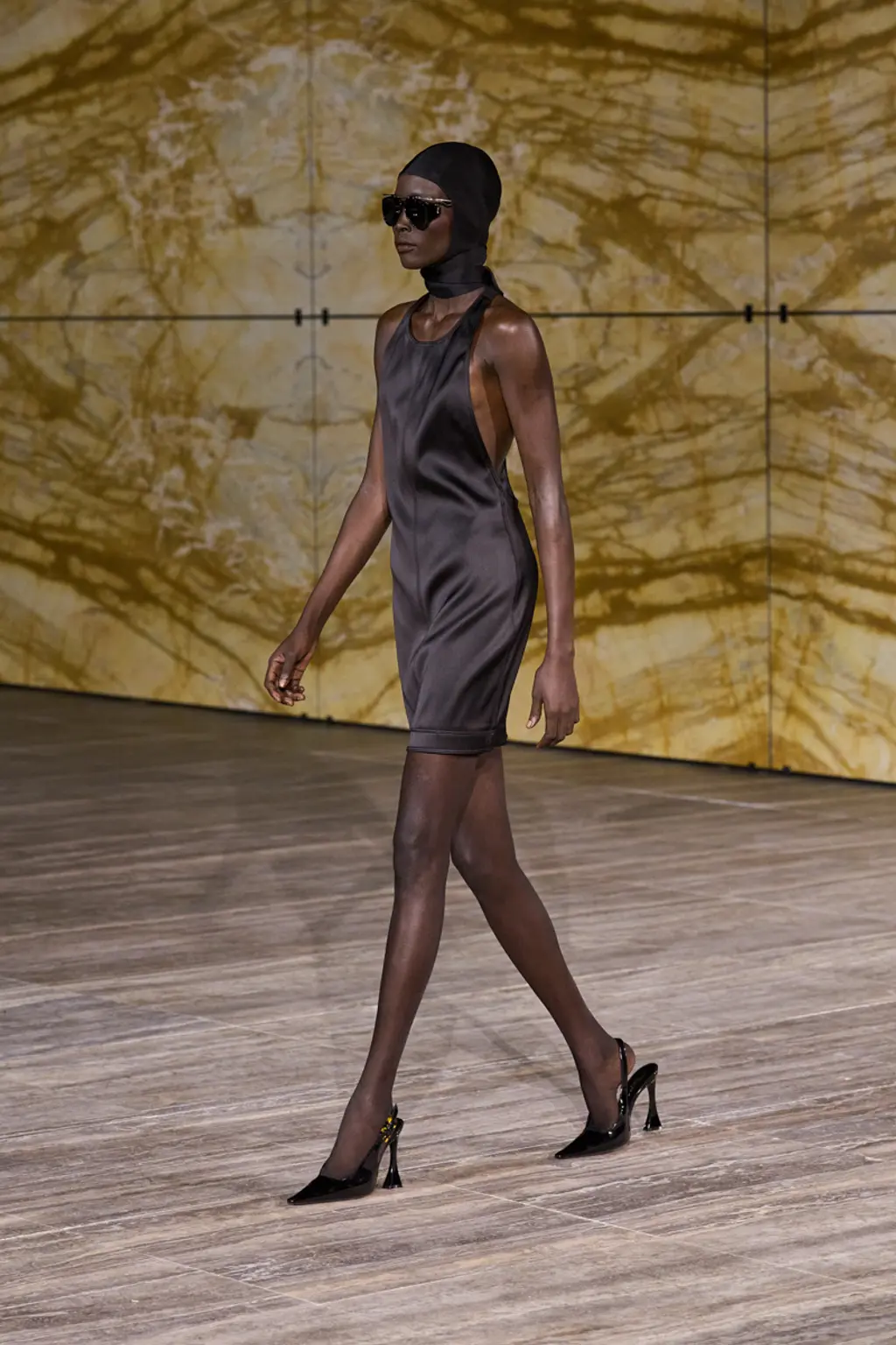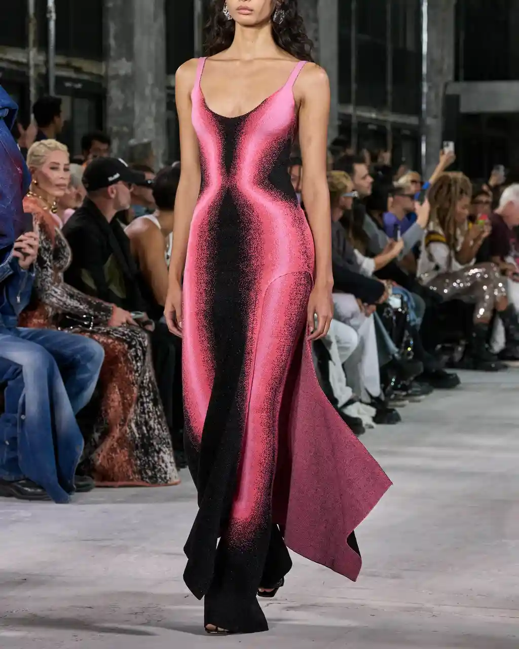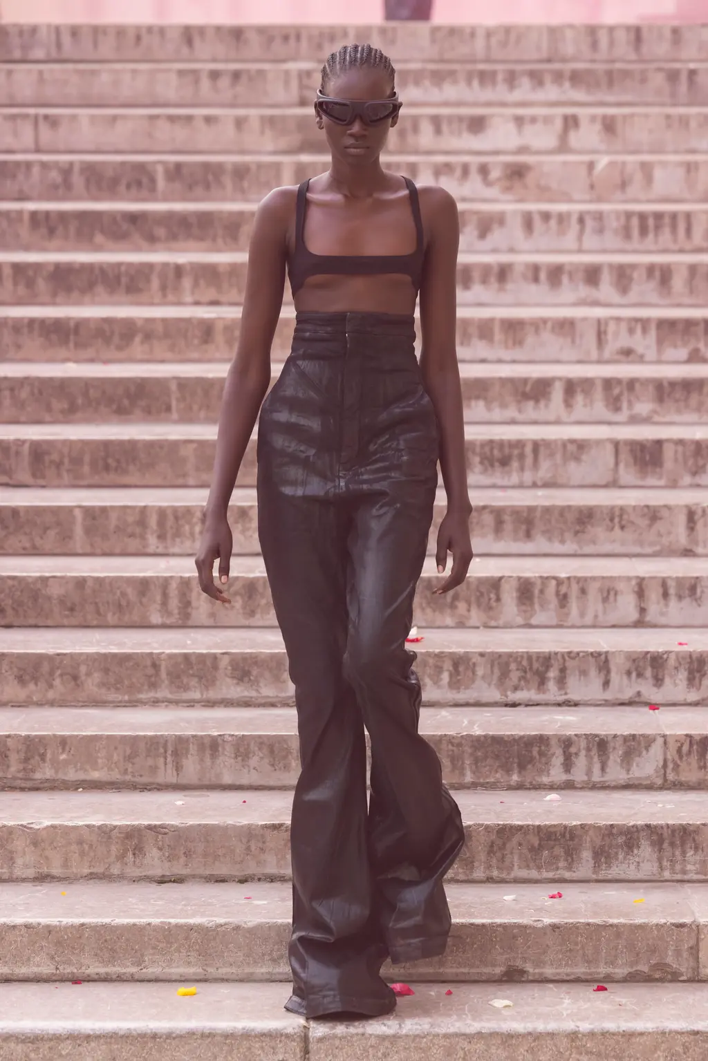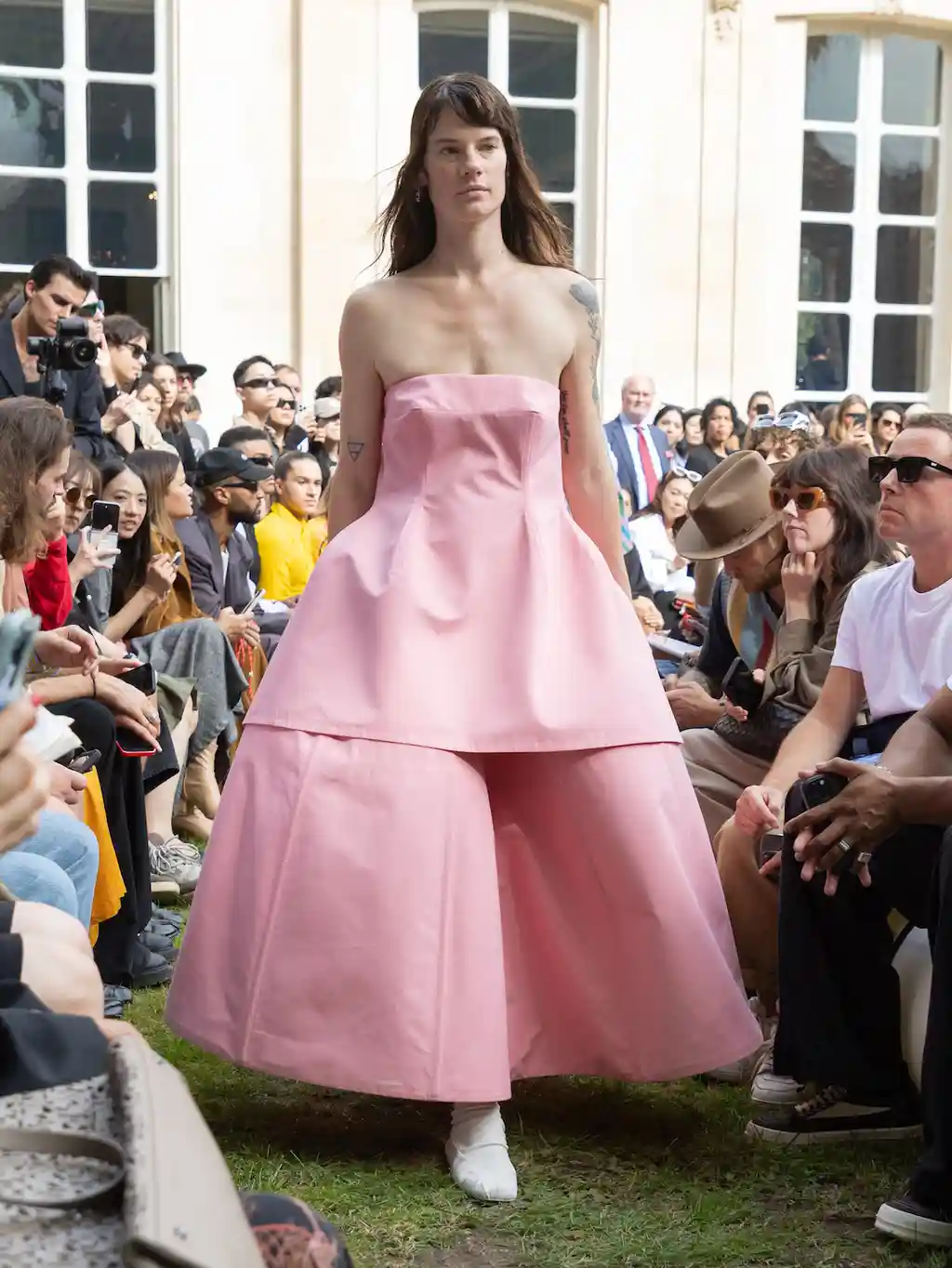 Listening to the right music can shift a bad mood, especially when you see it live. So much so that when Rick Owens, whose nickname is literally The Lord of Darkness, was at a Björk concert earlier this year, he thought, “Oh this is positive” and felt “kind of dumb for being so gloomy all the time”. So, is Rick in his happy, upbeat, colourful era? Not quite, although models did emerge from a fuchsia pink fog like goths in Barbieland. Suffice to say the clothes themselves held onto their signature darkness, with the first long, draped black gowns in jersey and leather setting the tone.