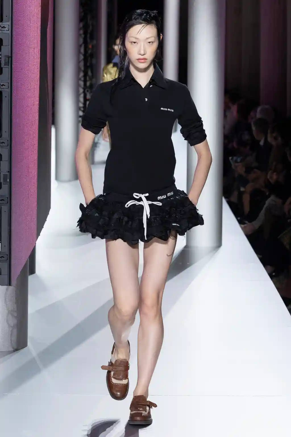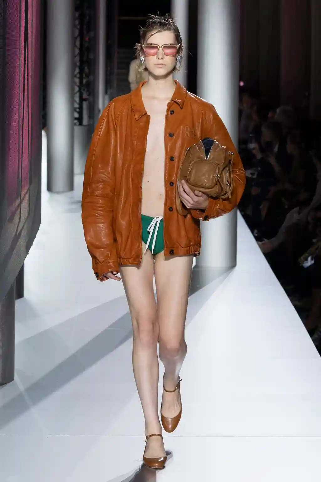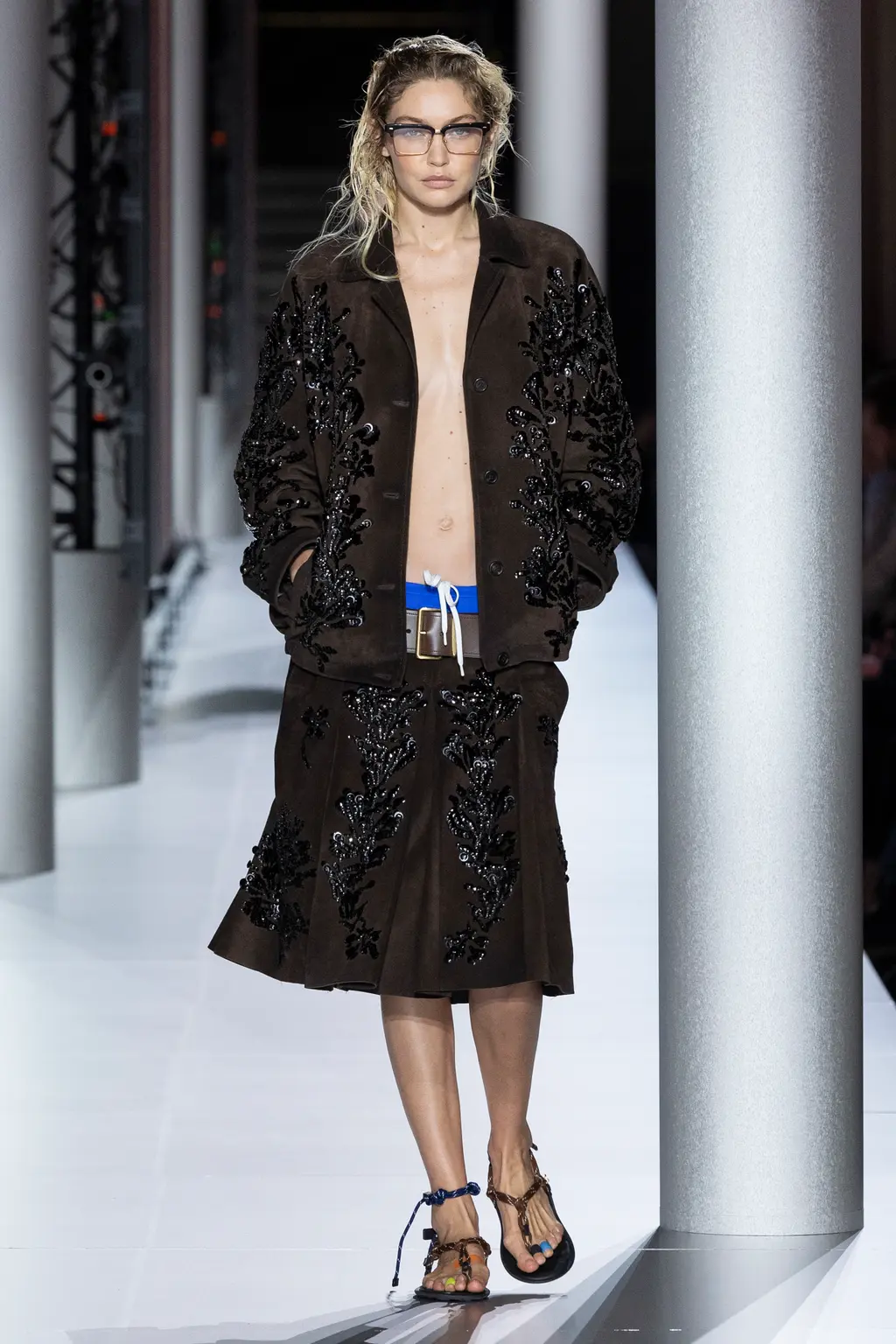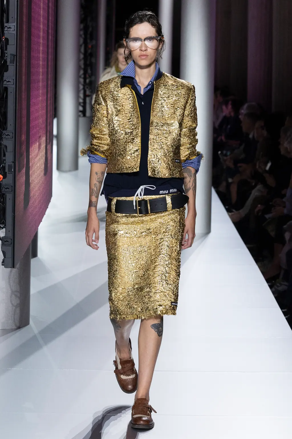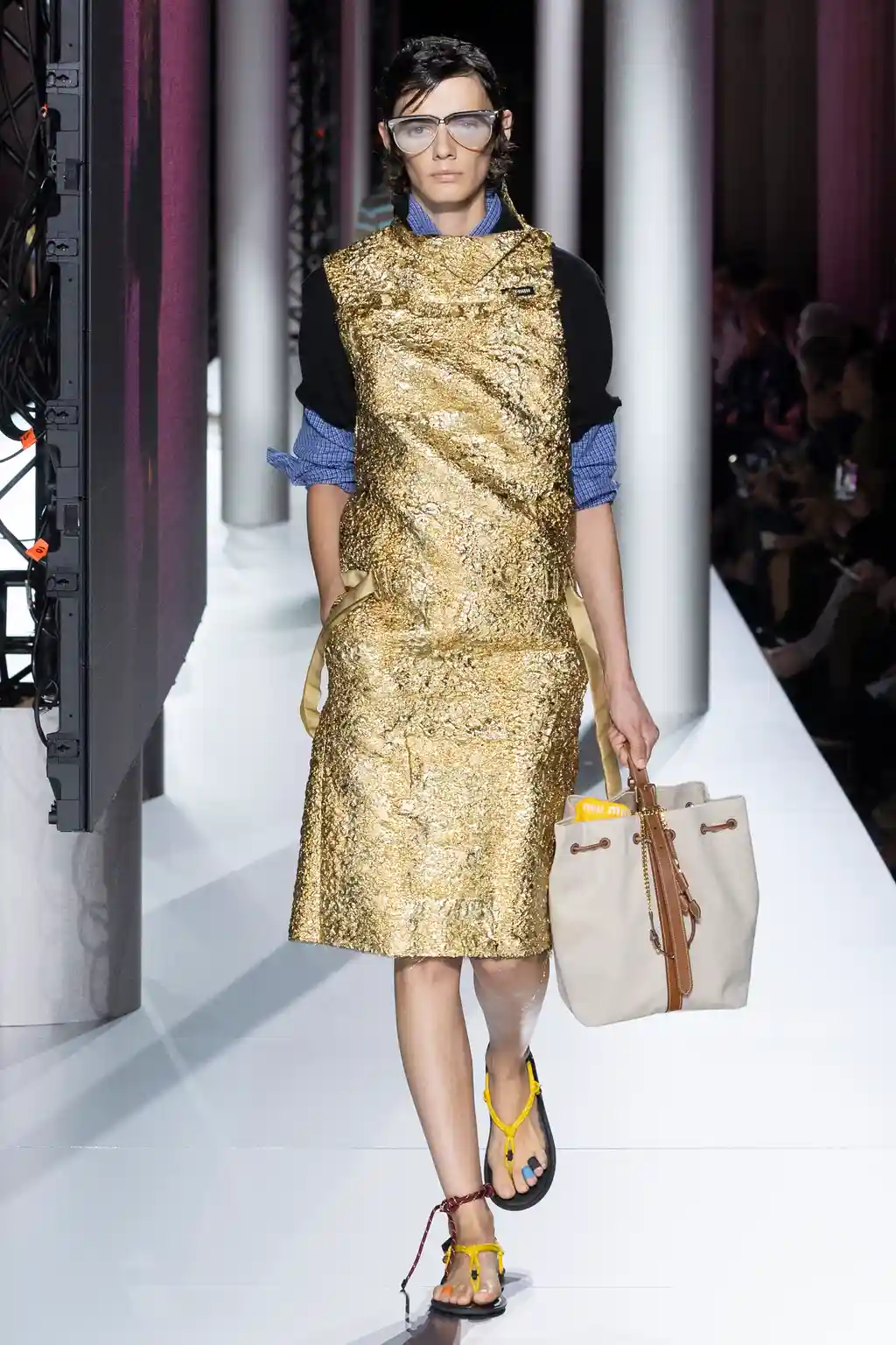 The micro-mini skirt also returned, but this time it was flouncy and multi-layered rather than pleated. Belts were thick and slung low around hips. Drop waist sequin dresses brought the glamour and models carried overstuffed handbags with high heels and towels peeking out from the top. The leather bandana tops paired with low-rise midi skirts are sure to make their way into fashion editorials and Insta posts. Cracked gold garments shimmered like foil or armour. The overall impression, though, was one of chaotic ease. Miuccia Prada seemed to be saying, “Hey, modern life is busy, so embrace the style mistakes you might make when you get dressed in a rush. You just might set a new trend.”