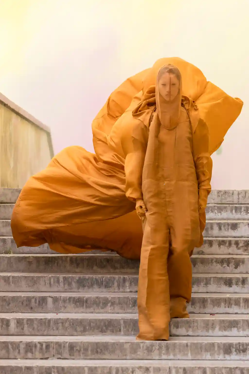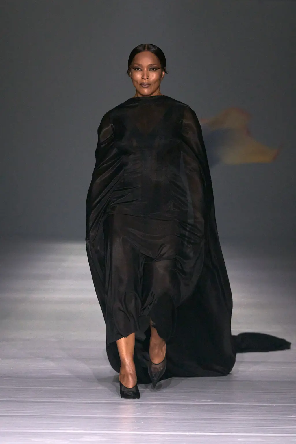 There were jutting Count Dracula shoulders, too, and contact lenses that turned the whites of the eyes black. Faces were shrouded beneath organza head coverings as though models had emerged into an apocalyptic world where they needed protecting from pollution or disease. It’s not quite giving joy, but the upbeat Diana Ross anthem, I Still Believe, that played throughout hinted at Rick’s newfound pursuit of positivity. Lovely stuff.