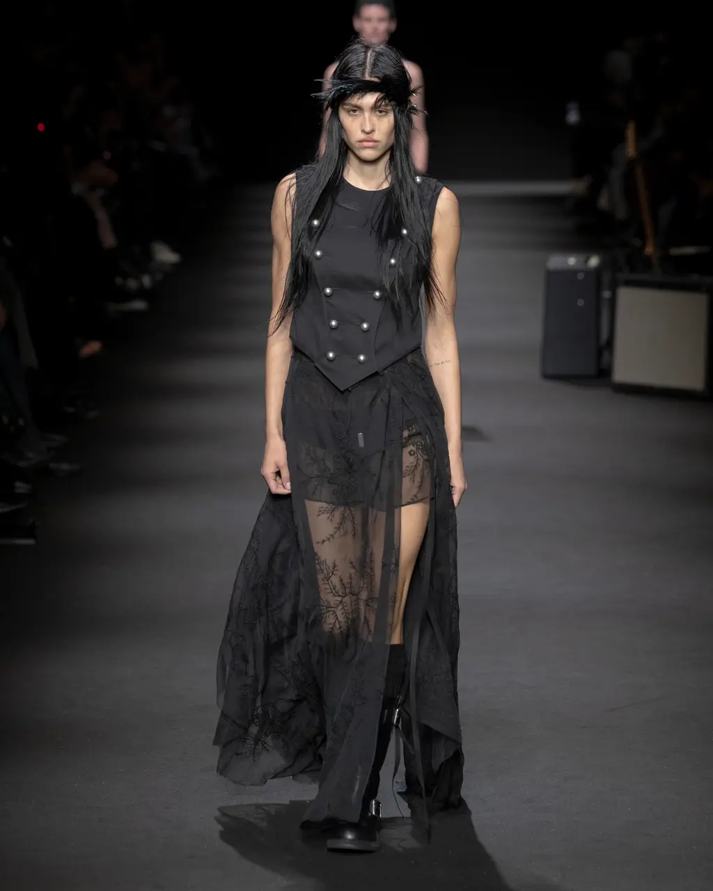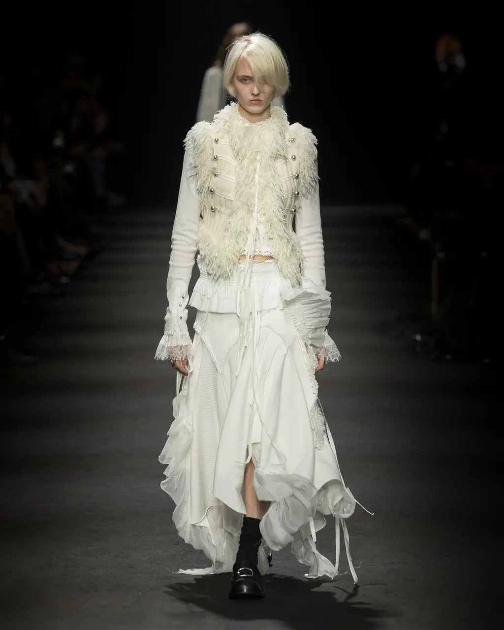 It would be remiss not to acknowledge the fact that this spotlight dovetails with the resurgence of indie-sleaze (see: Demeulemeester’ military jacket and slouchy knitwear) as well as the resurrection of a soft-goth aesthetic in pop culture. It’s a look embodied by the penetrative stares and razor-thin eyebrows of models including Gabbriette and Amelia Gray. The latter has walked Demeulemeester shows several times: her SS25 look was both equal parts a rock ‘n’ roll and majestic, as she strolled down the runway in a billowing white shirt and silver headpiece, as though returning from a raging afters. Demeulemeester is truly timeless, notes Gray. “I’ve always been drawn to the brand’s approach to grunge expression and gender neutrality,” the model tells THE FACE. “It’s played such a significant role in helping me find and define my personal style.”