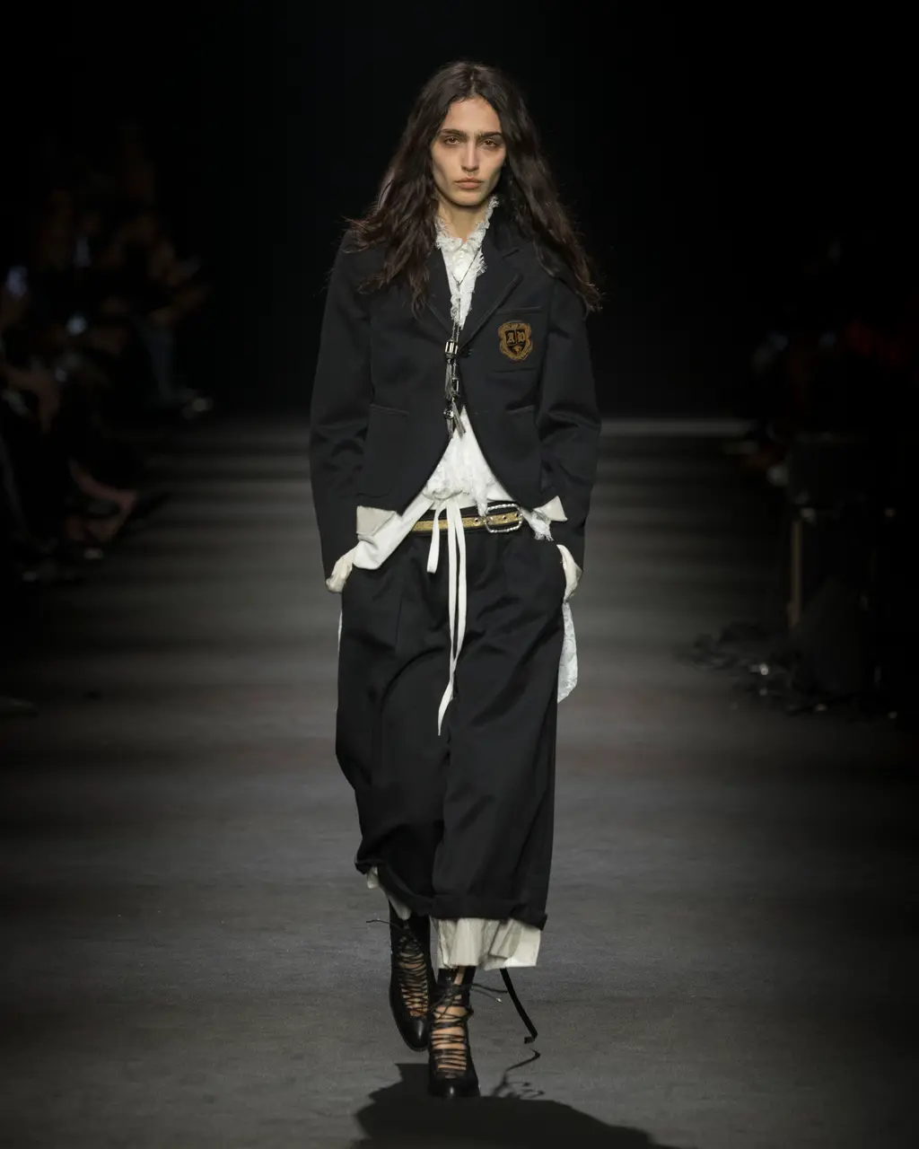 It’s true that Gray’s style – tough and sultry like a hickey – slots seamlessly into the Demeulemeester moodboard. The same can be said for the actor Sophie Thatcher, who, suitably grungey, starred in the label’s “Kids of Los Angeles” campaign. Likewise, Demeulemeester was a no-brainer for Jenna Ortega’s goth-inspired Wednesday press tour last year; months later, she sat front row at their show.