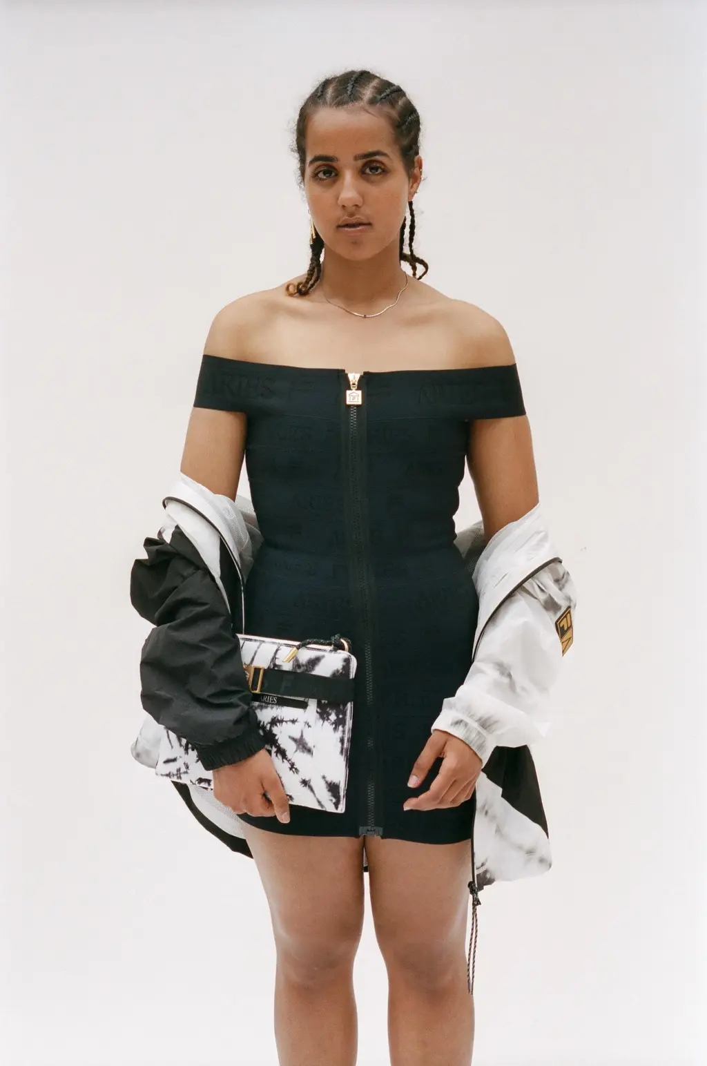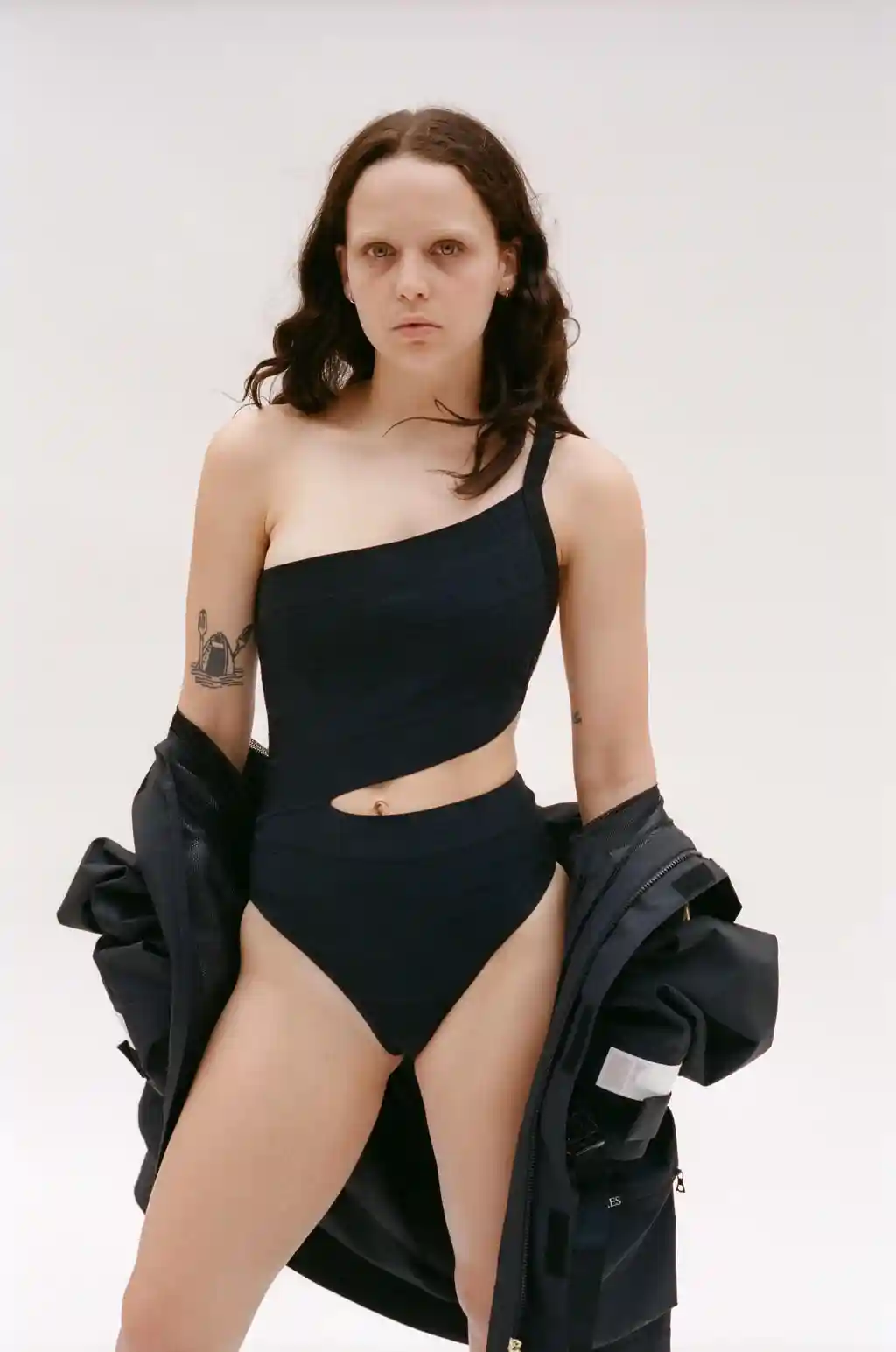 Inspired by the flag that proved fatal, black is applied to much of the collection, forming a sleek backdrop for an asymmetric, monostrap top, a spellout skirt and a zip-down dress embellished with the collaboration insignia. Elsewhere, the coastal theme is woven into sailing-inspired sportswear, semaphore flag motifs and elastic bandage swimwear, ready for you to wear while you throw yourself into slightly shallower waters this summer.