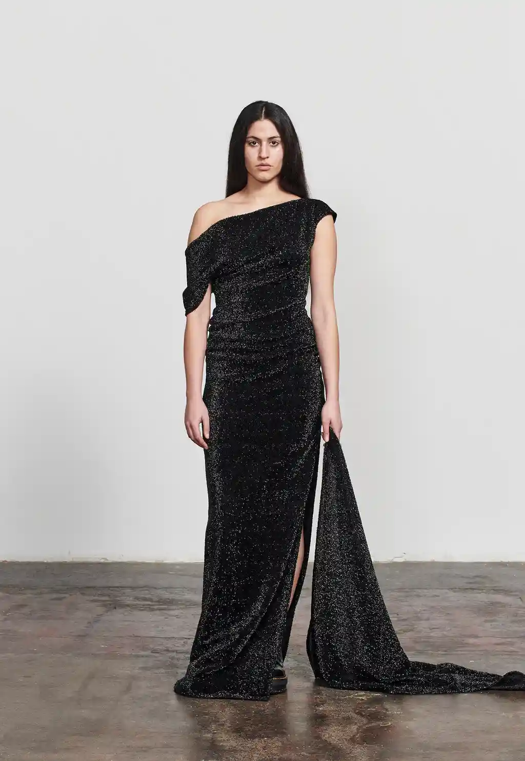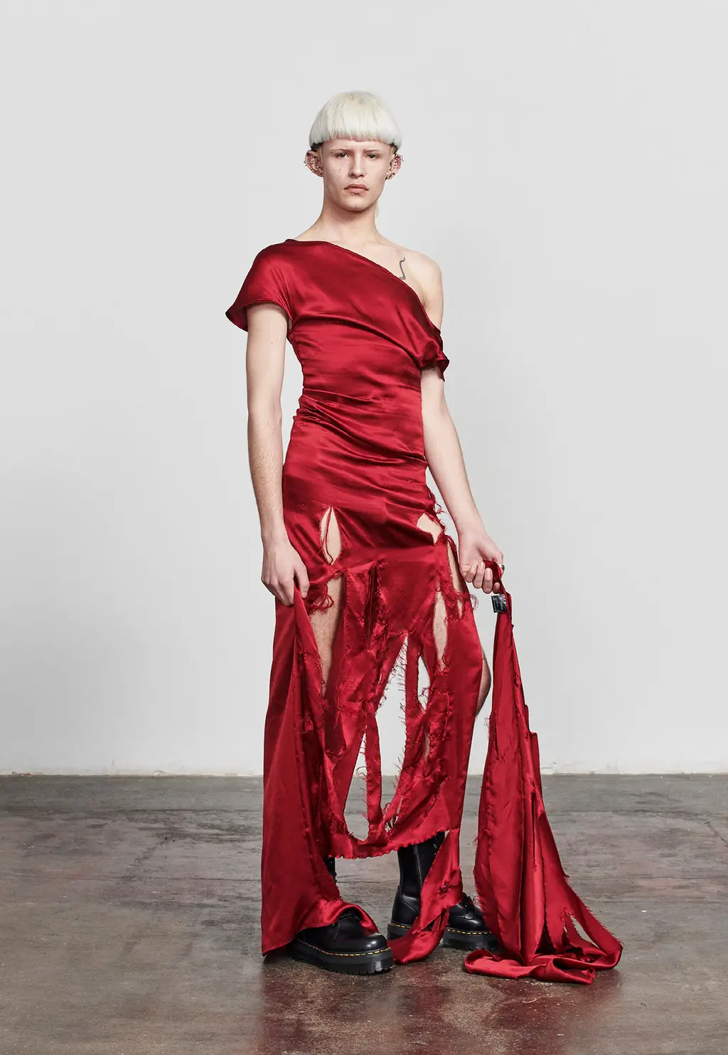 The collection, styled by Katie Grand, is divided into three distinct sub-sections, opening with all-black, billowing gowns and restrained, belted waists, while a silk skirt is heavily distressed. Then, a gear-shift, as a shimmery, scarlet evening dress is followed by strong asymmetric cuts and a particularly tough leather mini-skirt. The light at the end of the tunnel, then, is ethereal white fabric draped across the body, and Art School’s signature smock dress presented in its most refined interpretation yet, constructed from a delicate, sparkly knit.