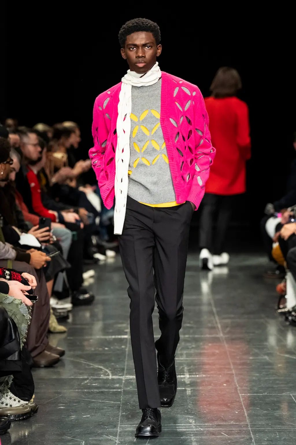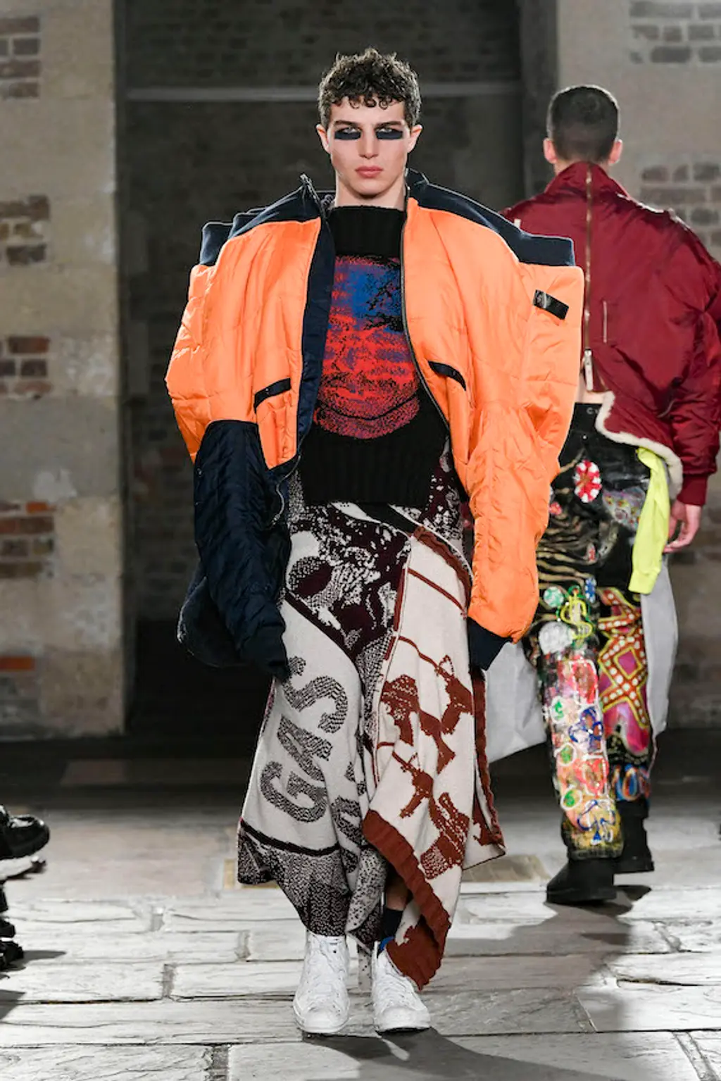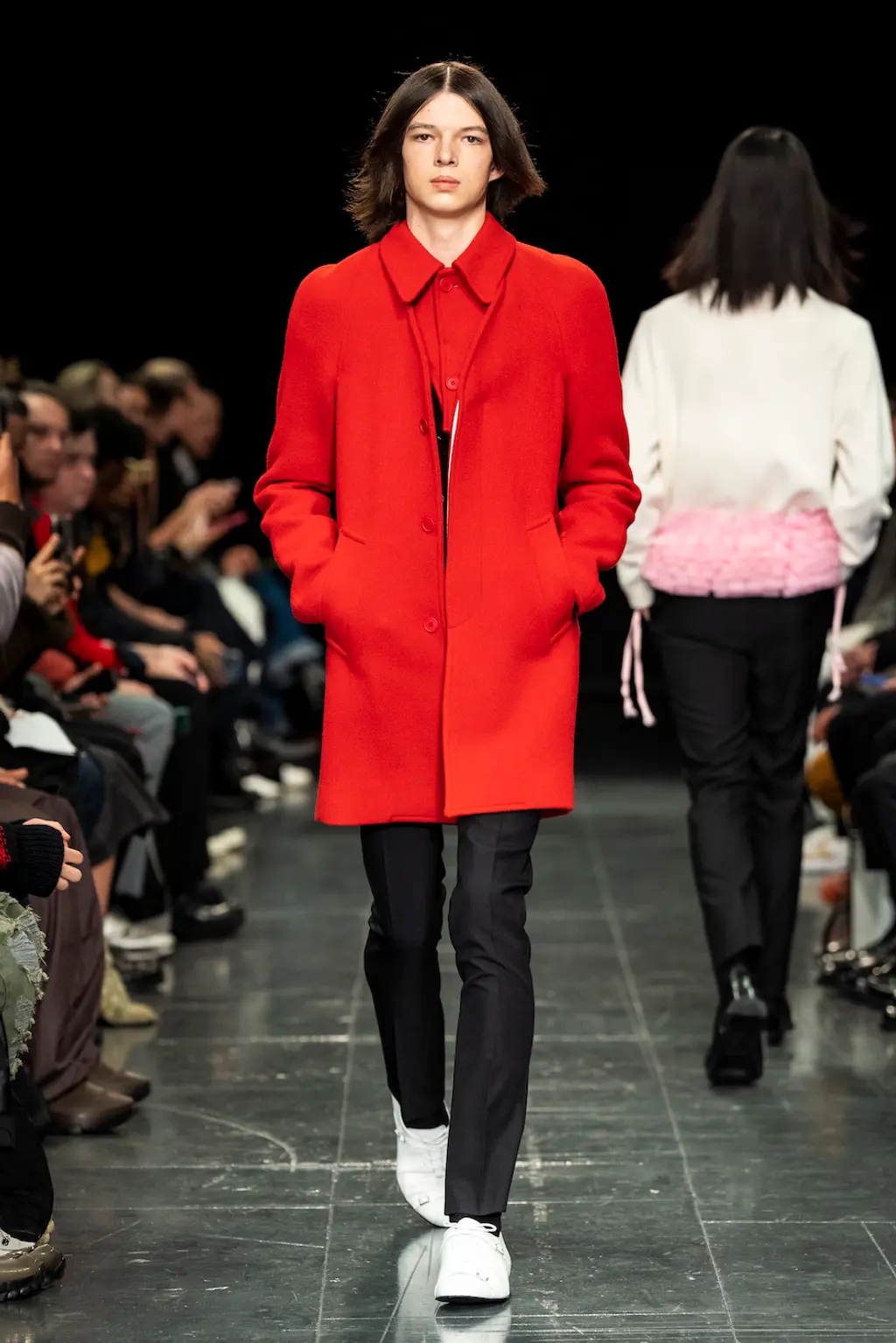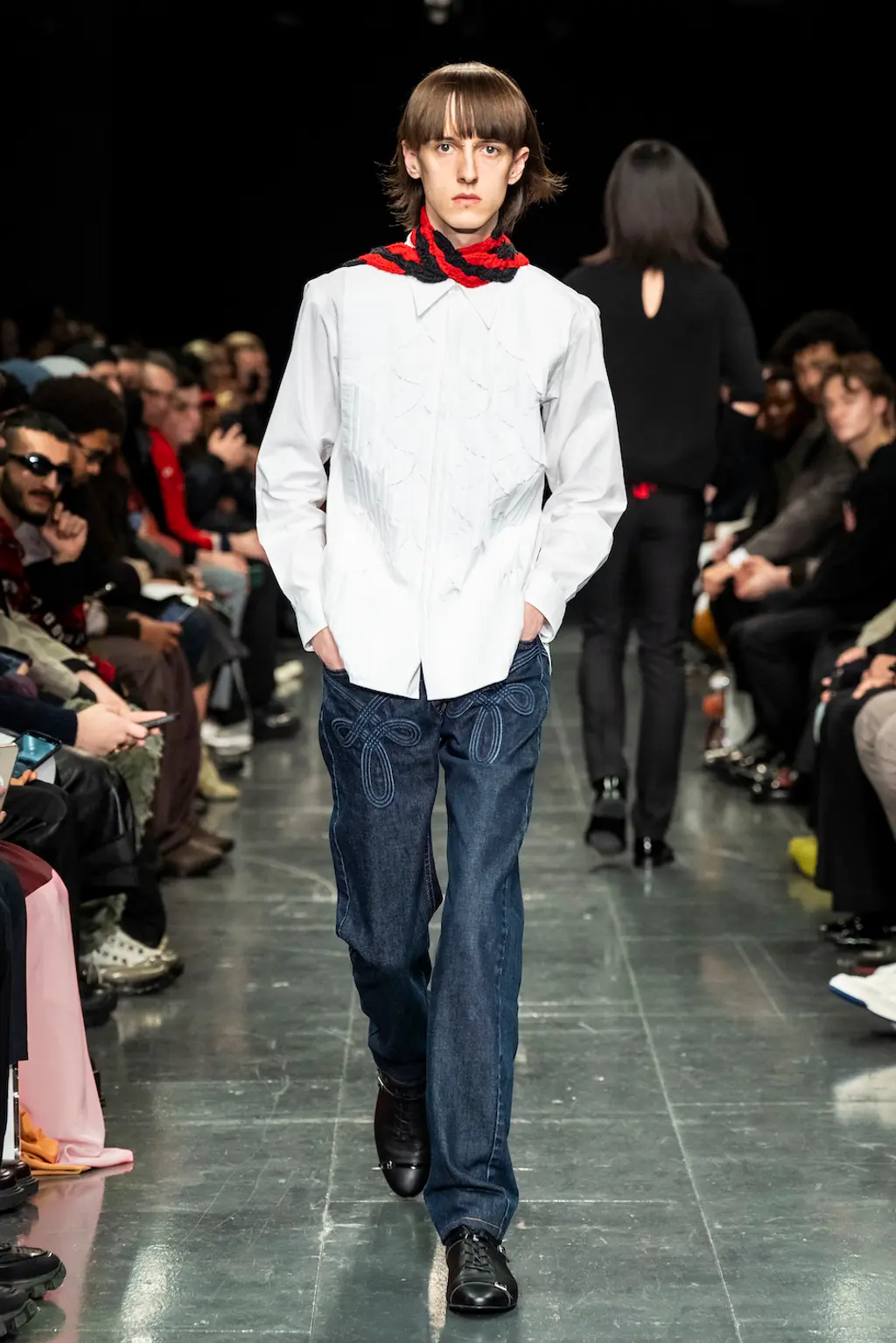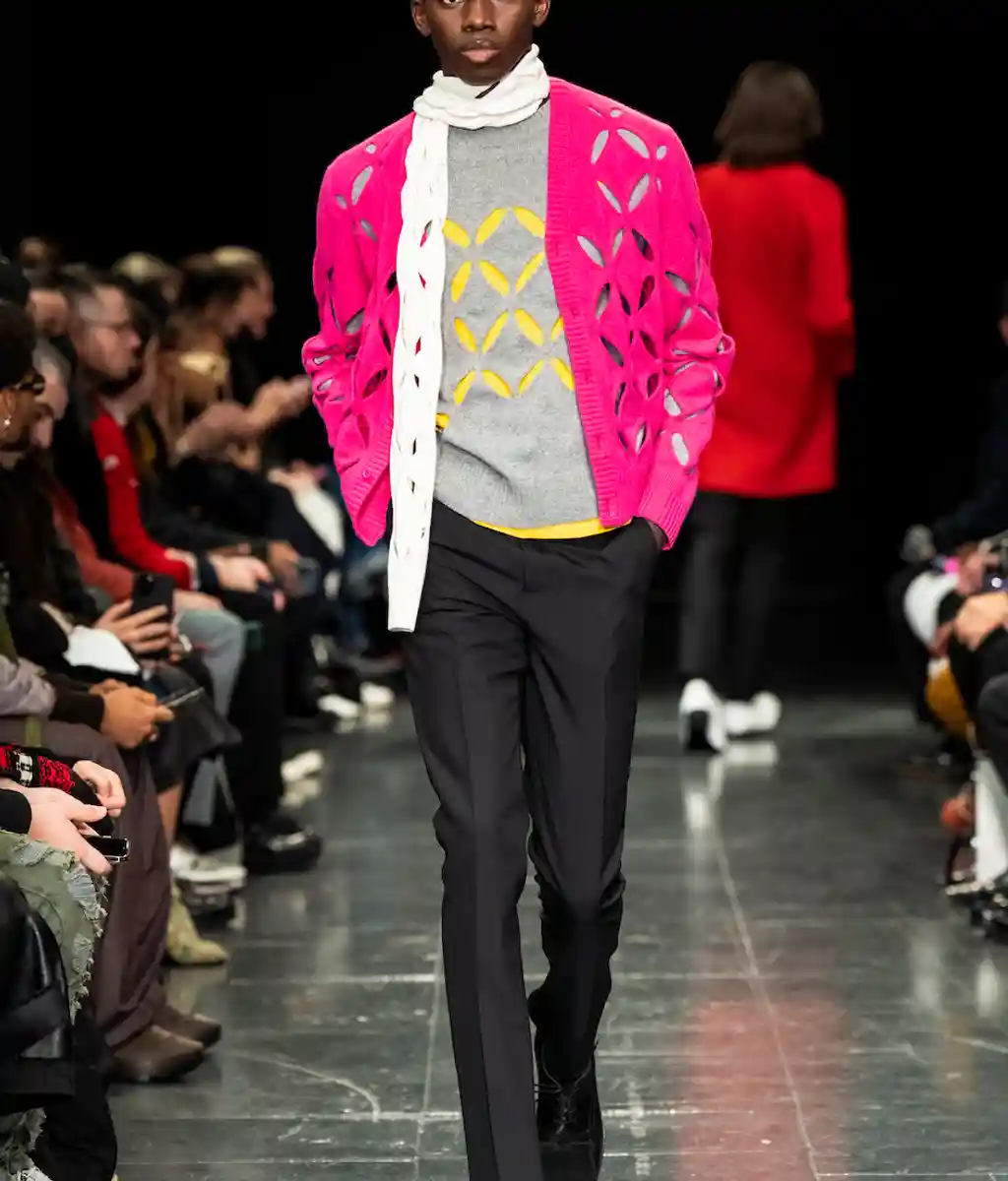 The word “theatrical” tends to be levelled at the kind of shows that pull out all the stops: dramatic gowns, elaborate sets, hats large enough to send and receive flight data. For Stefan Cooke and Jake Burt, this has taken on a quieter meaning. Their latest collection has its origins in theatre costume archives, the pair plundering the West End for choice details. Ruffs (or are they tutus?) linger around the hips in an Easter bunny palette of pinks and yellows. Paco Rabanne-esque chainmail takes inspiration from a medieval tabard. Of course, it wouldn’t be Stefan Cooke without some experimental textiles: pleats with the complexity of origami; denim with looped details like Celtic knots, achieved by stitching over rope; the same slashed knitwear they’ve presented before, other colours peeping through beneath. There’s a particular kind of vigour to Cooke and Burt’s work, but they wear their references – and their preoccupation with craft – lightly. This season, they deserve a standing ovation.