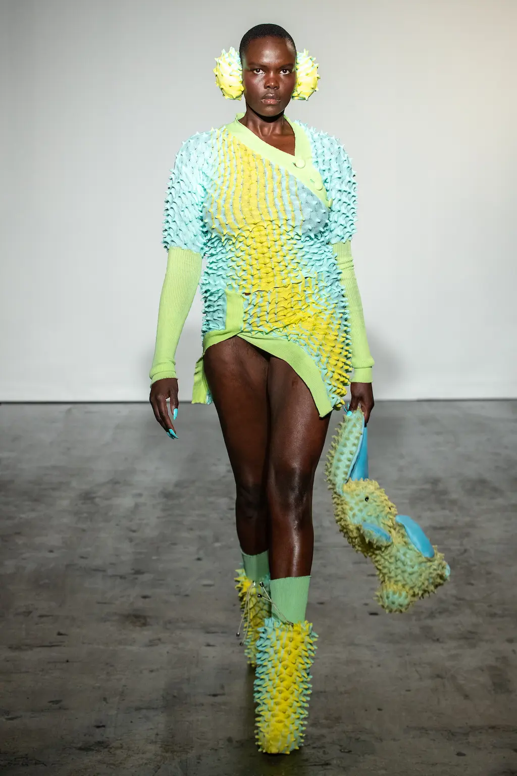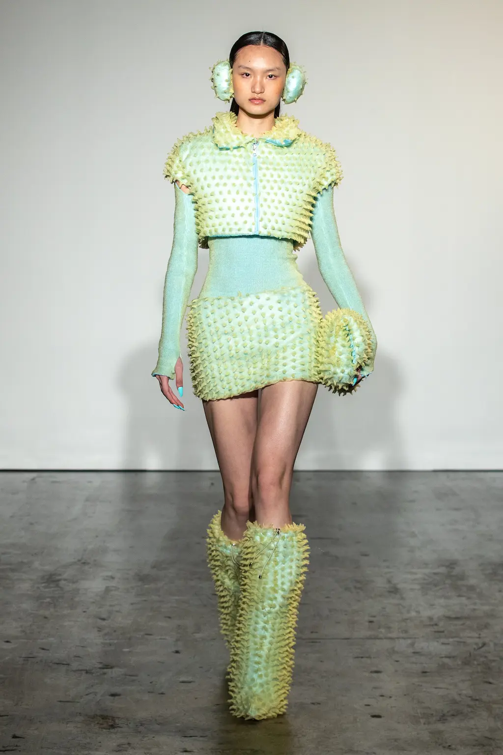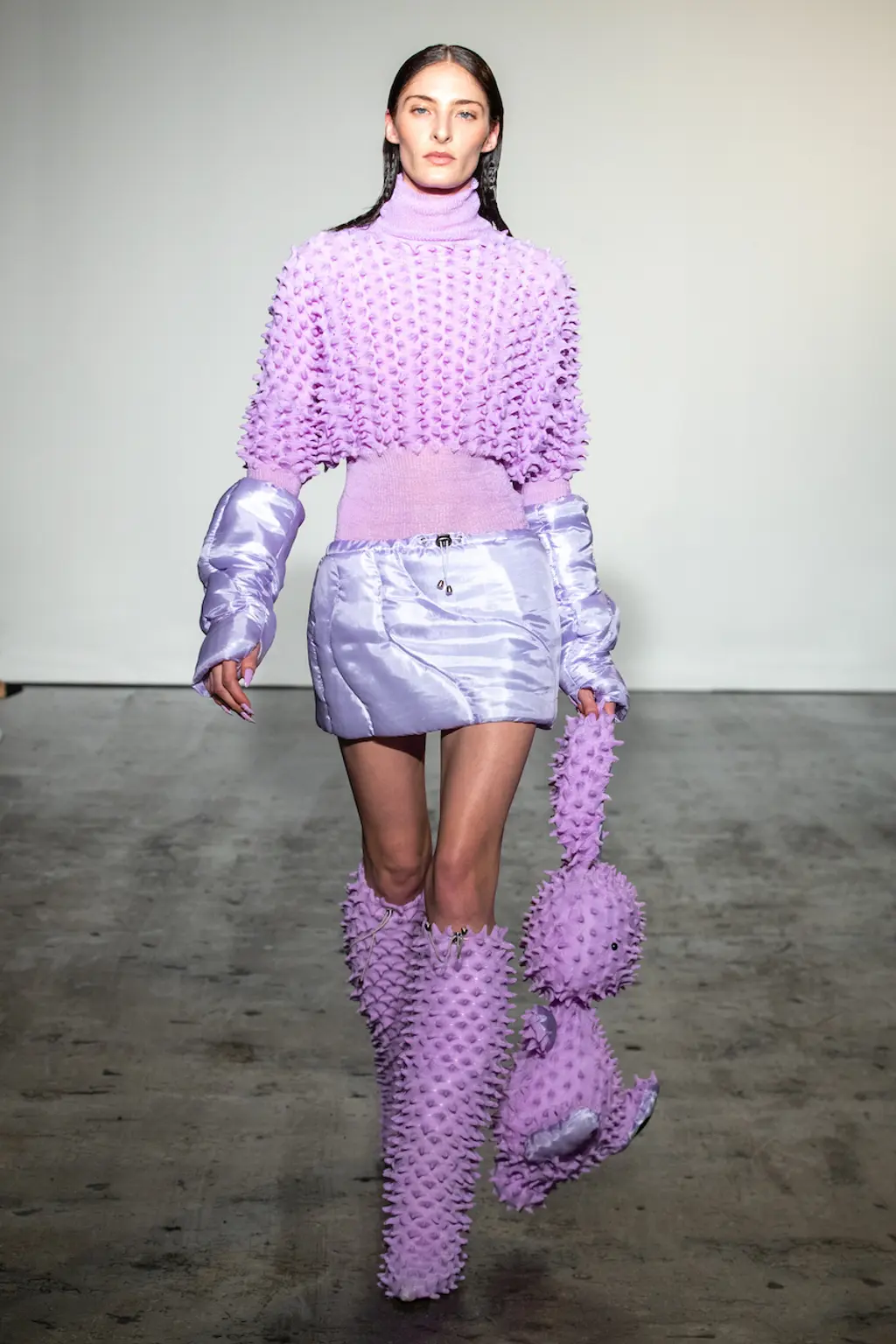 For Chet Lo, already well-known for his tactile fishing wire knits, the mood was “very après-ski, very yeti! It’s giving a cold brrr because I really wanted to be in a jacuzzi, mountain-side, drinking a bottle of champagne.” That cold brr came through in spiked earmuffs and snow boots (both accessories that, despite their chilly weather implications, have become rather hot of late), as well as pastel faux fur fits for the kitschest of snow bunnies.
