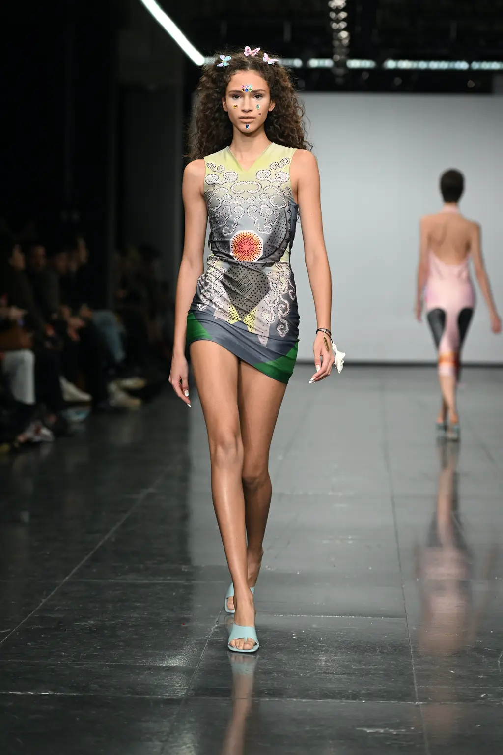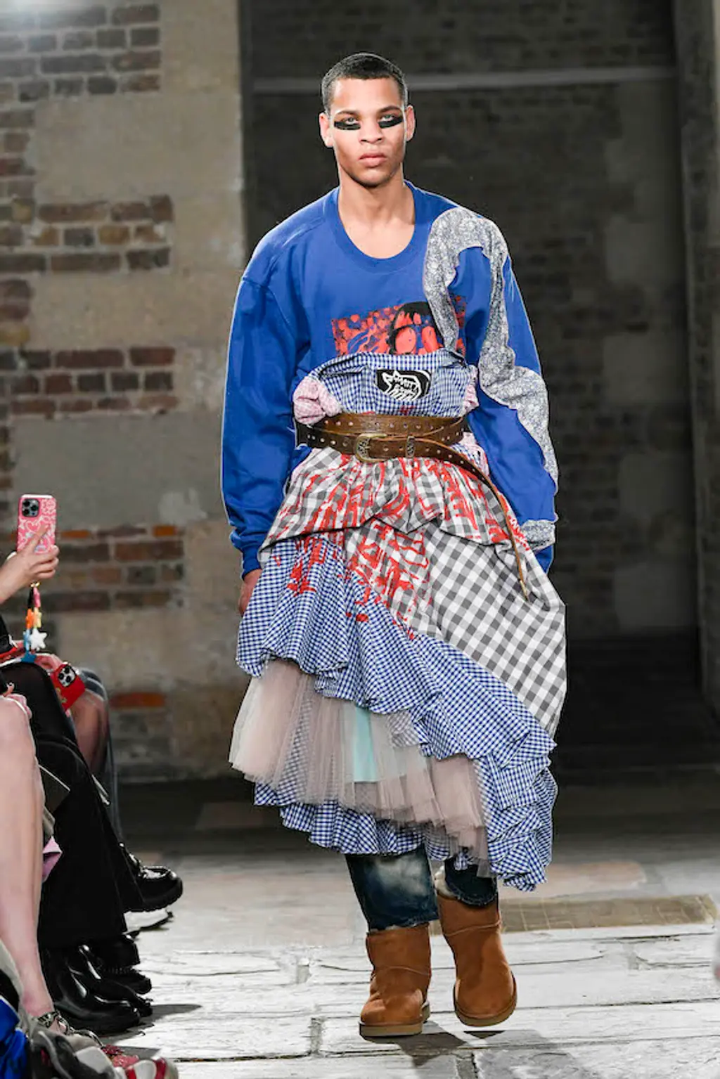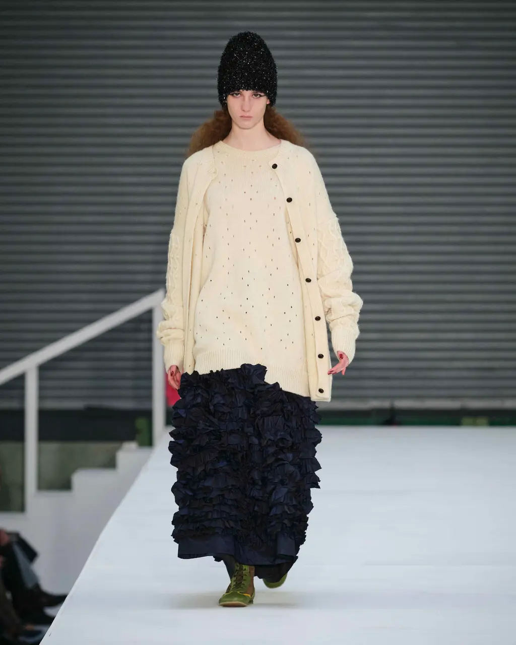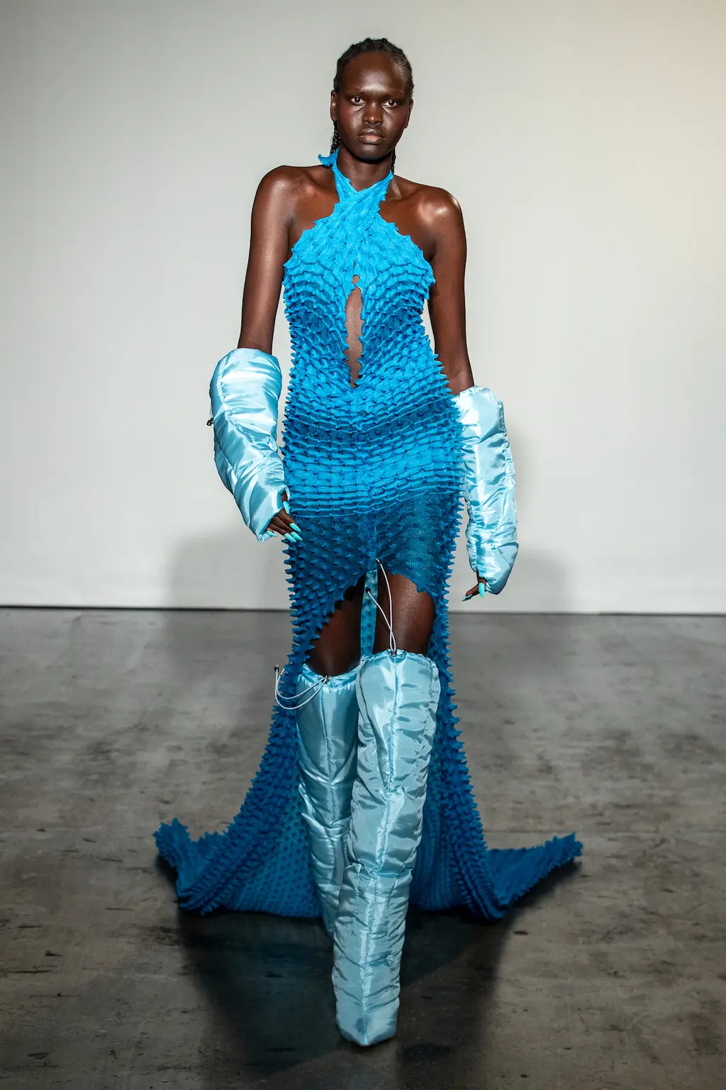 For Chet Lo, already well-known for his tactile fishing wire knits, the mood was “very après-ski, very yeti! It’s giving a cold brrr because I really wanted to be in a jacuzzi, mountain-side, drinking a bottle of champagne.” That cold brr came through in spiked earmuffs and snow boots (both accessories that, despite their chilly weather implications, have become rather hot of late), as well as pastel faux fur fits for the kitschest of snow bunnies.
