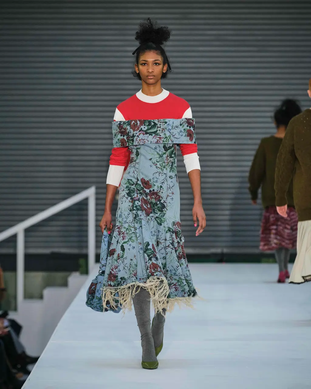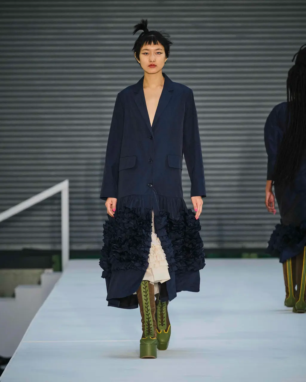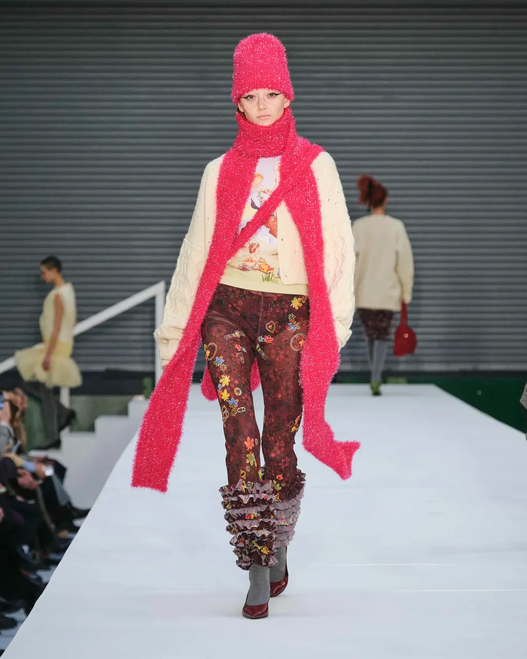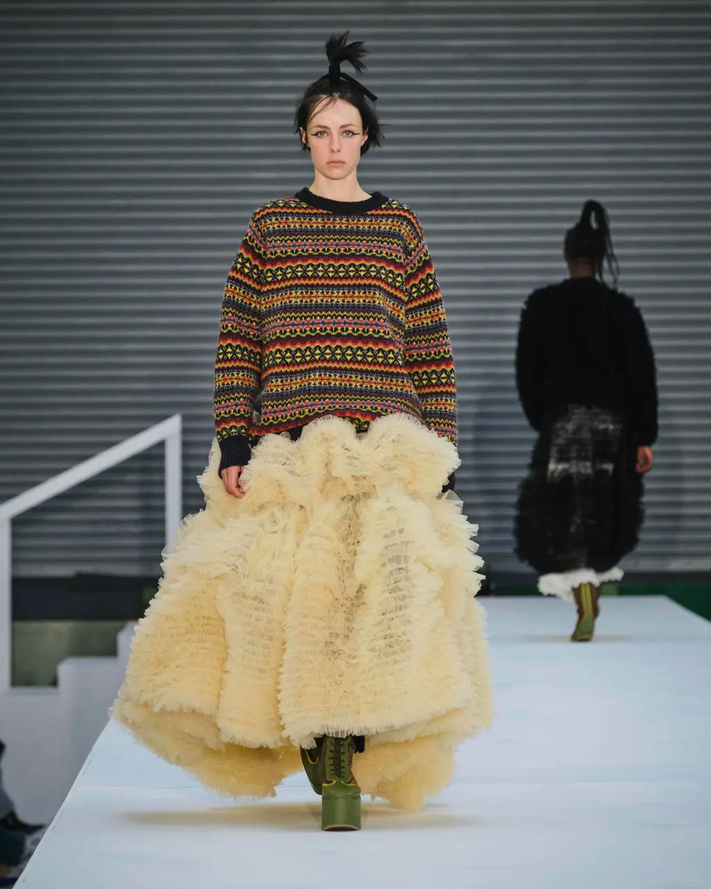 Is the cardigan over the ballgown a peculiarly British institution? Reminiscent of draughty stately homes and kids playing dress up, it seems to speak to the tattily aristocratic notions of eclecticism and eccentricity that LFW used to hold so dear. In Molly Goddard’s case, this season’s mix of knitwear, slouchy overcoats, stomping boots, frayed floral denim and signature confections of tulle and taffeta in palest cream and brightest fuschia, complete with topsy-turvy topknots, was inspired by one of her mum’s glam friends who was a fixture at Portobello Market in the ‘80s. Taking over the Seymour Leisure Centre while Storm Eunice made a good argument for those practical outer layers, Goddard’s show wore its high-low mix of slouch and fuss with studied ease.