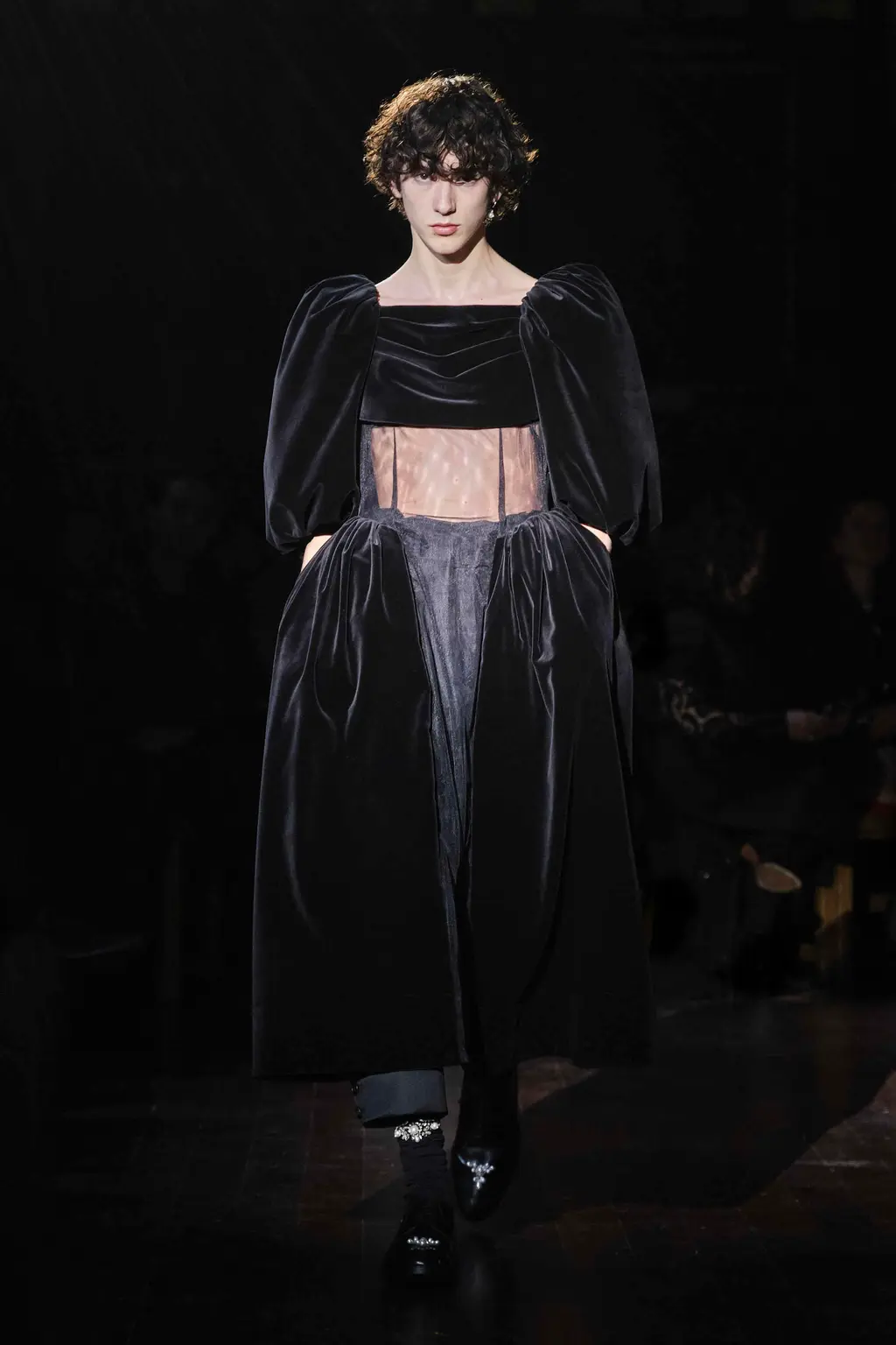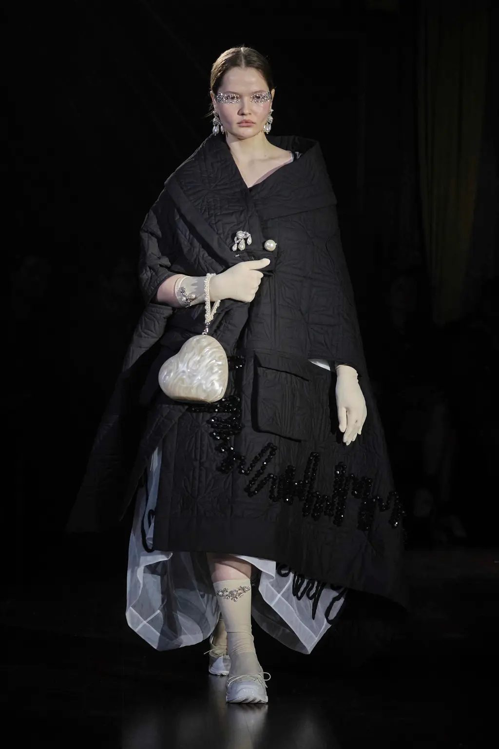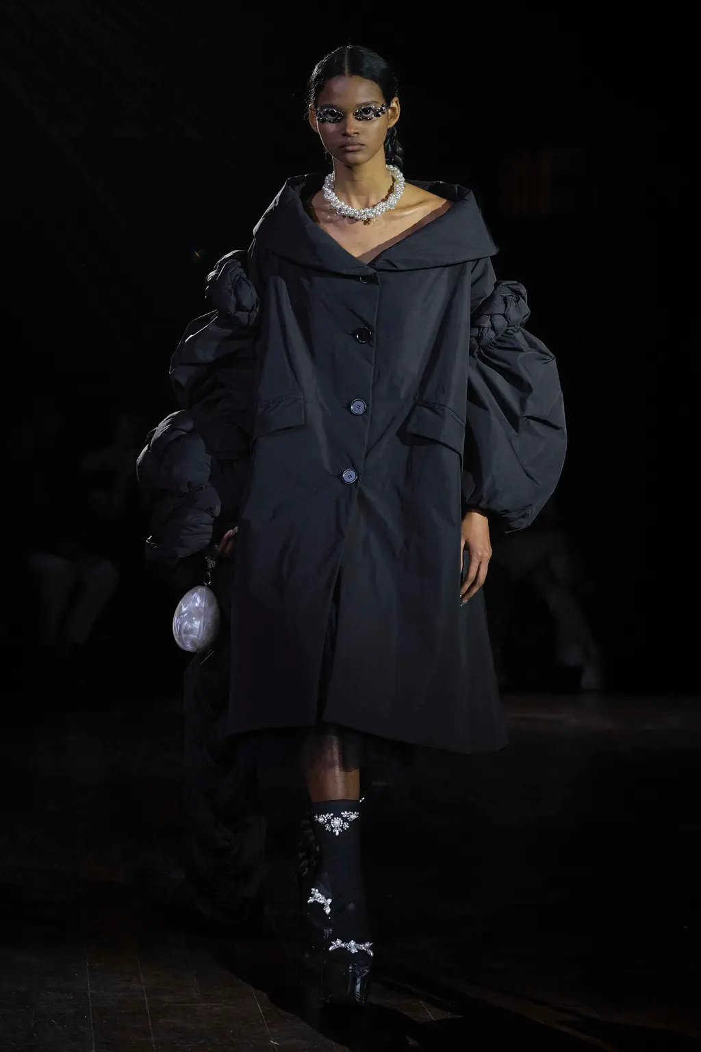 Step into Simone Rocha’s fairytale land. Children of Lir, to be specific: an Irish myth about a set of siblings turned into swans for 900 years by their wicked stepmother. Swans feel like a curiously Rocha-ish bird. Majestic and serene, yes, but not to be messed with either. Rocha’s attraction to the story’s mournful, gorgeous atmosphere, alongside its central idea of metamorphosis, is equally fitting. Showing in the gloom of Lincoln’s Inn, this season her sculptural pieces came in royal blue velvets, white cottons, padded nylons, and a shocking flash of scarlet patent leather. The socks and gloves glittered, as did the balaclavas. The suggestion of “crushed taffeta wings” in the show notes suggested flight potential everywhere. Seen away from the catwalk, Rocha’s pieces often have a sweetness and light to them. Witnessed in situ, there’s a welcome darkness that lingers.