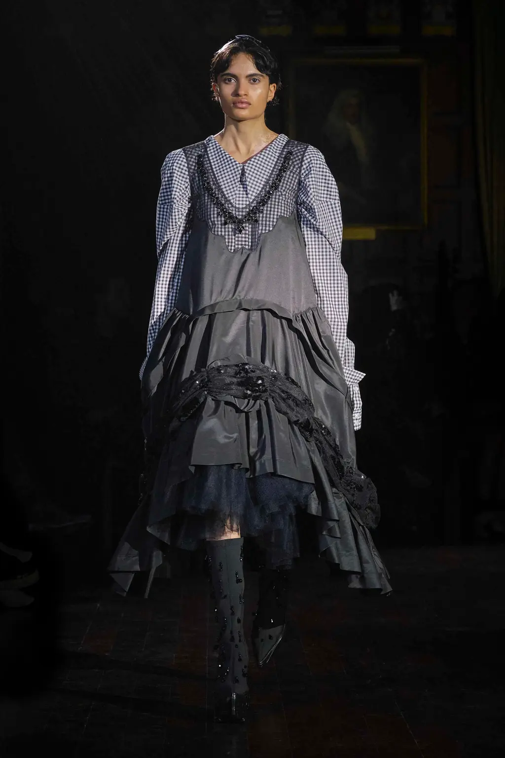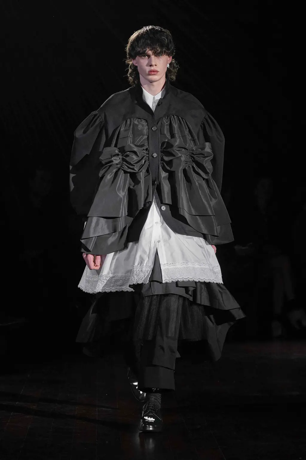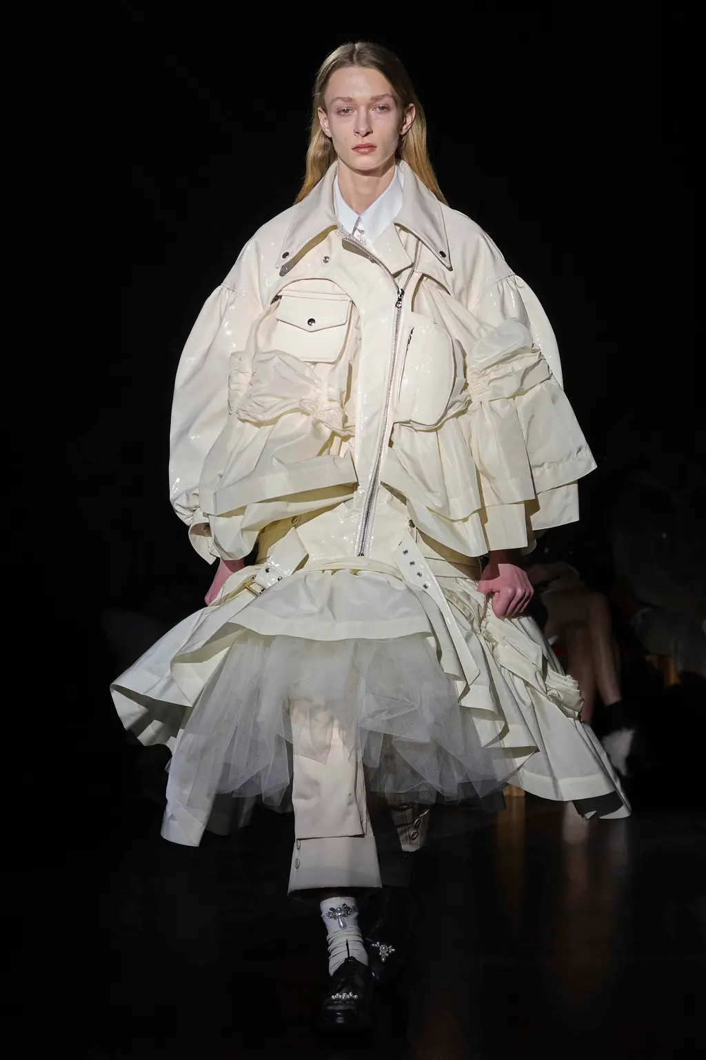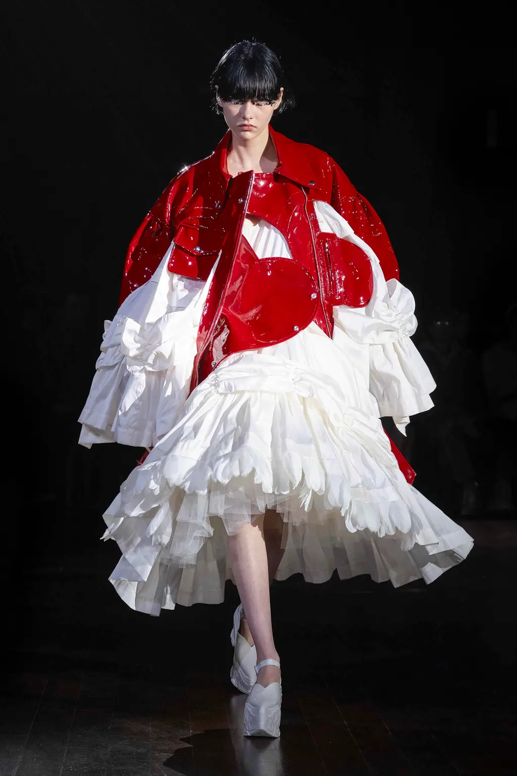 Step into Simone Rocha’s fairytale land. Children of Lir, to be specific: an Irish myth about a set of siblings turned into swans for 900 years by their wicked stepmother. Swans feel like a curiously Rocha-ish bird. Majestic and serene, yes, but not to be messed with either. Rocha’s attraction to the story’s mournful, gorgeous atmosphere, alongside its central idea of metamorphosis, is equally fitting. Showing in the gloom of Lincoln’s Inn, this season her sculptural pieces came in royal blue velvets, white cottons, padded nylons, and a shocking flash of scarlet patent leather. The socks and gloves glittered, as did the balaclavas. The suggestion of “crushed taffeta wings” in the show notes suggested flight potential everywhere. Seen away from the catwalk, Rocha’s pieces often have a sweetness and light to them. Witnessed in situ, there’s a welcome darkness that lingers.