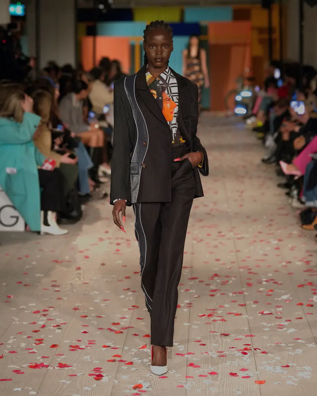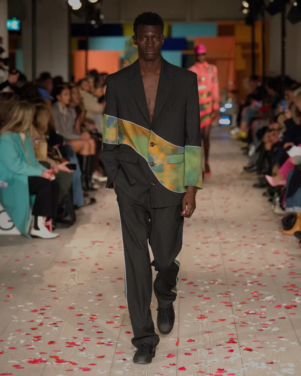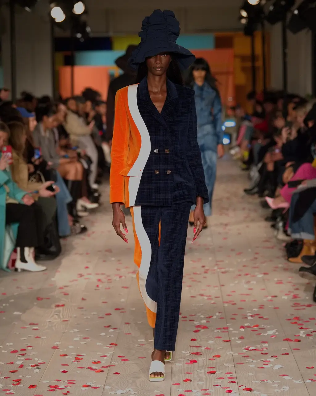 Rippling, curving motifs ran through Priya Ahluwalia’s debut runway show, and the excitement was palpable in the packed, sand-covered basement of London’s 180 Strand. Unexpected (see: undulations of colour cutting through a classic pin-striped suit) and mesmerising (look to the layers of pink and navy fabric wrapped around the body like ribbons), these free-flowing shapes are familiar territory for Ahluwalia. This season’s twin influences were Nollywood and Bollywood: both holding strong childhood memories for the designer. The drama of the former and dreaminess of the latter came together through vintage film poster T‑shirts, high-octane patterns and an irresistible partywear line-up. Not to mention Ahluwalia took to the catwalk with an LVMH Prize, a GQ/BFC Fashion Fund win and an appearance at Guccifest already under her belt – impressive. Anticipation was high, and she most certainly delivered. In Ahluwalia, everyone’s ready for their close-up.