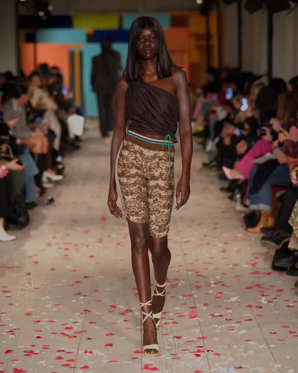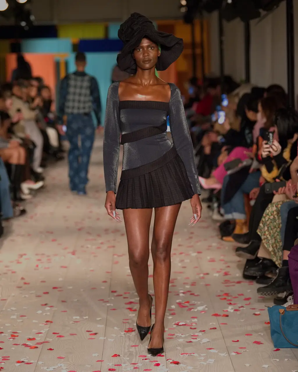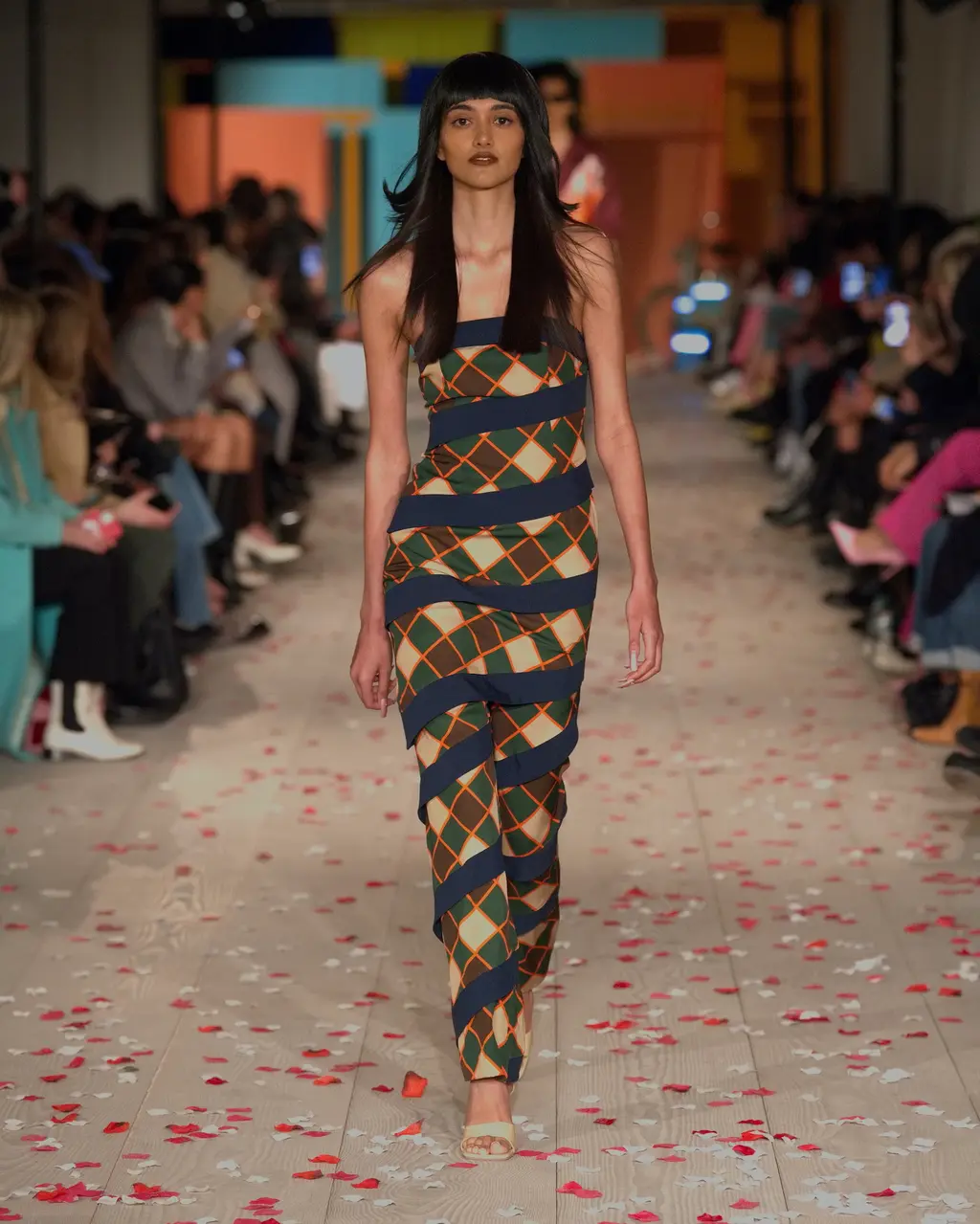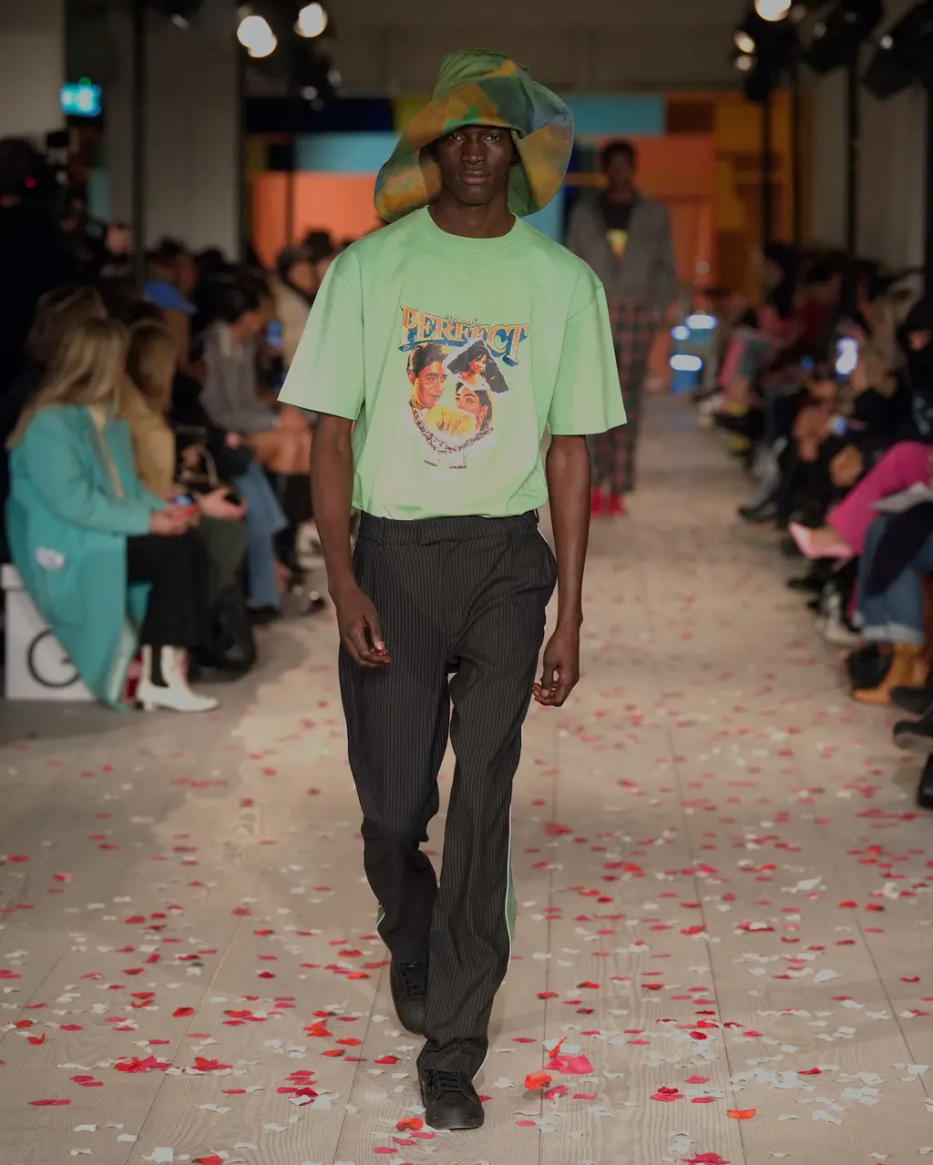 Rippling, curving motifs ran through Priya Ahluwalia’s debut runway show, and the excitement was palpable in the packed, sand-covered basement of London’s 180 Strand. Unexpected (see: undulations of colour cutting through a classic pin-striped suit) and mesmerising (look to the layers of pink and navy fabric wrapped around the body like ribbons), these free-flowing shapes are familiar territory for Ahluwalia. This season’s twin influences were Nollywood and Bollywood: both holding strong childhood memories for the designer. The drama of the former and dreaminess of the latter came together through vintage film poster T‑shirts, high-octane patterns and an irresistible partywear line-up. Not to mention Ahluwalia took to the catwalk with an LVMH Prize, a GQ/BFC Fashion Fund win and an appearance at Guccifest already under her belt – impressive. Anticipation was high, and she most certainly delivered. In Ahluwalia, everyone’s ready for their close-up.