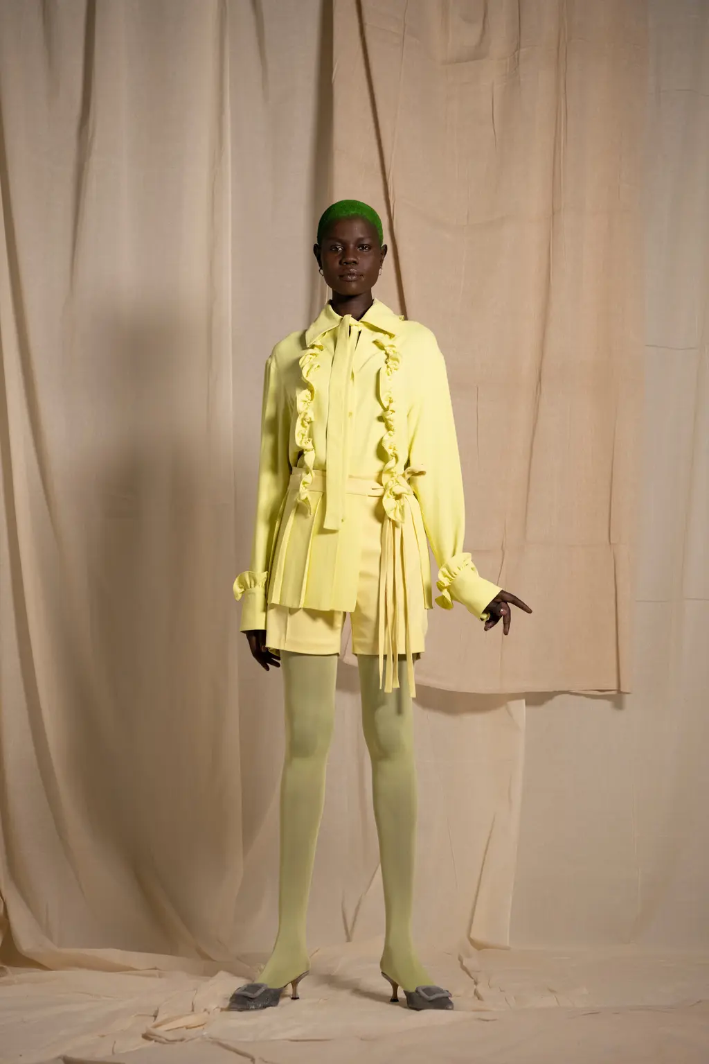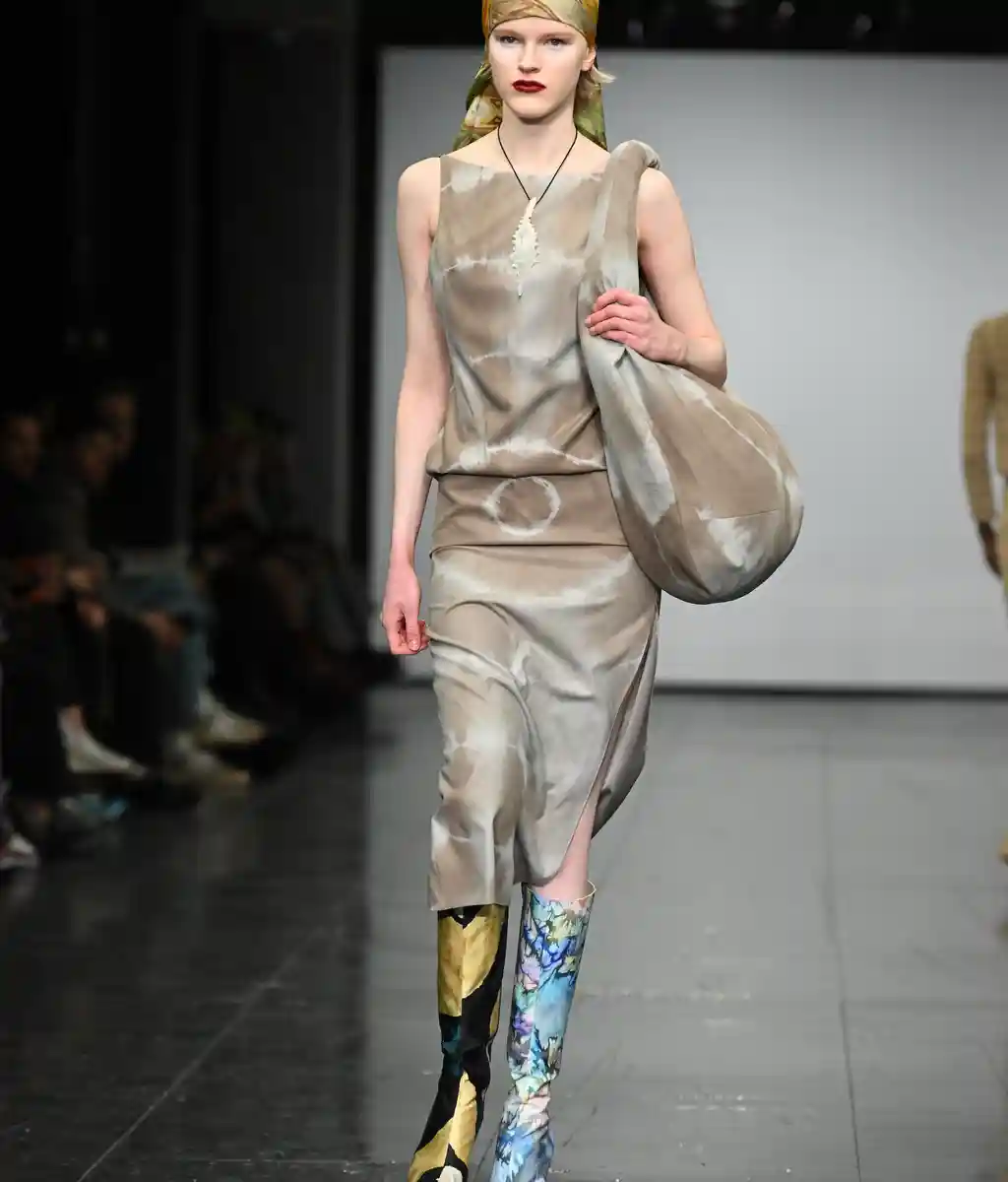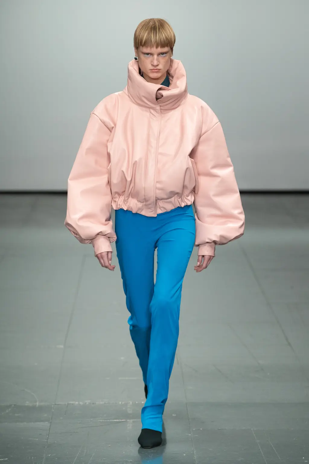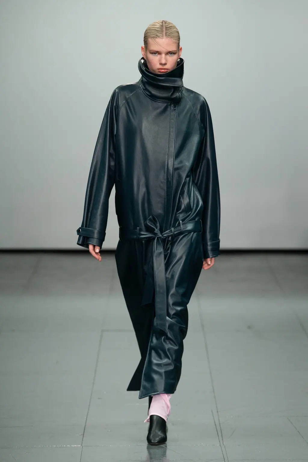 Richard Malone’s not averse to setting a scene. Last season he went so far as to frame several models with swathes of fabric rearing up and out from their shoulders, like stage curtains or the plush interiors of a ‘50s couture salon. This time there were no such theatrics, but the sense of grandeur remained. There is something of the grand dame about Malone’s designs. They’re still cutting edge – not only in their execution and shapes, but also their sustainable approach to deadstock fabrics and making pieces to order or in limited edition – but there’s a worldly sensibility to them. Some of these recycled jersey pieces wouldn’t look out of place on a modern-day Greta Garbo. There’s a playfulness to it too: two-tone candy-coloured separates; purple, yellow and burnt orange ribboned stockings that seem both entirely modern and straight out of the 16th Century; and a trio of trench coats with huge lapels, seductive in their simplicity and tantalising in their suggestion of slinking down the street in punchy, powder blue leather.