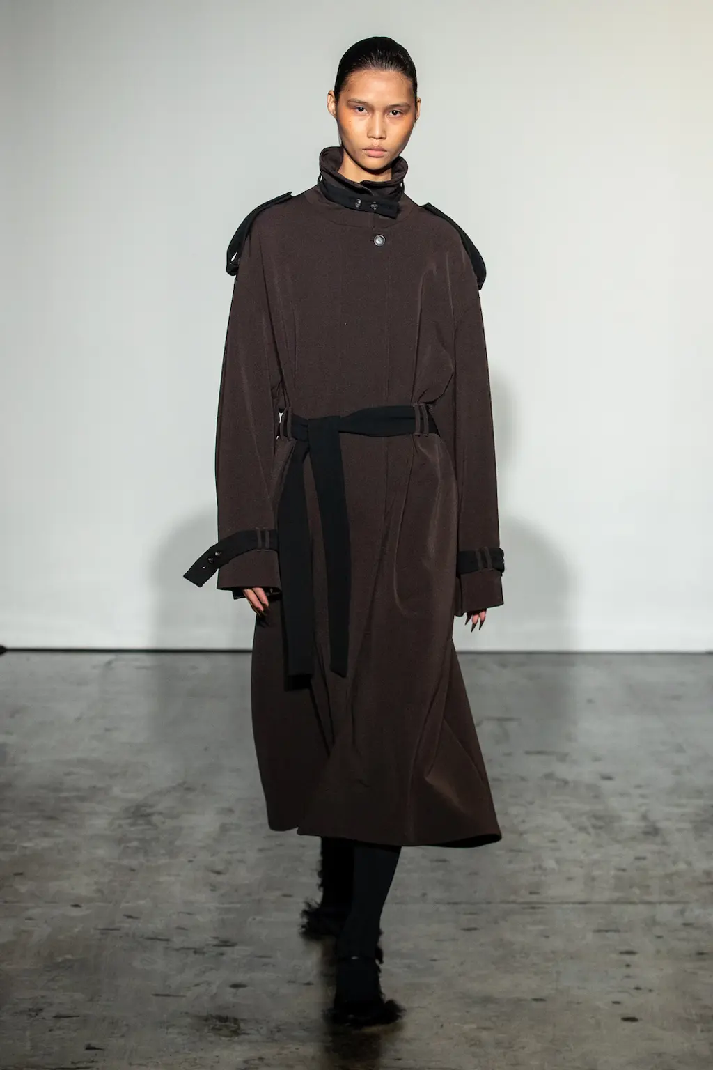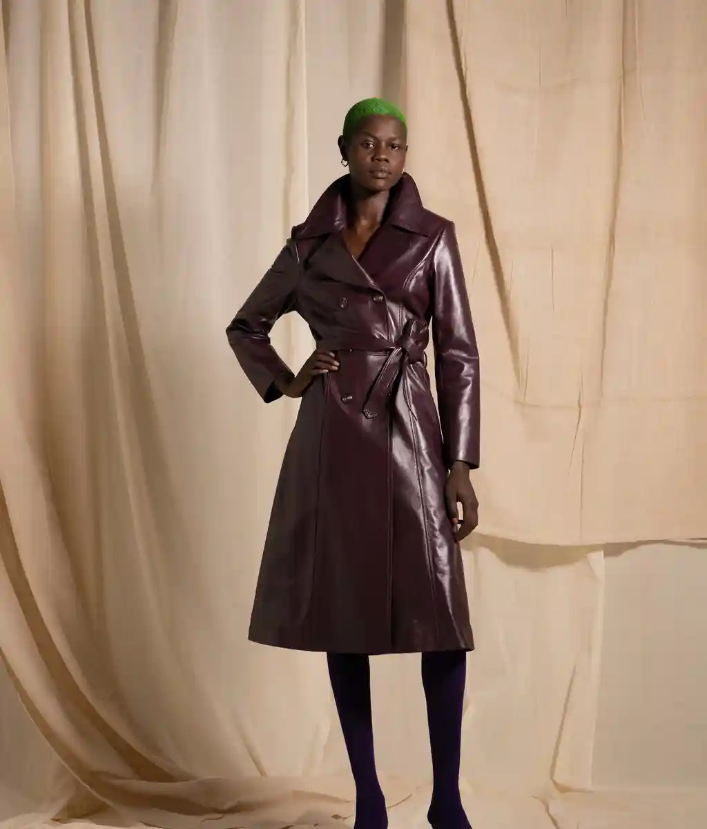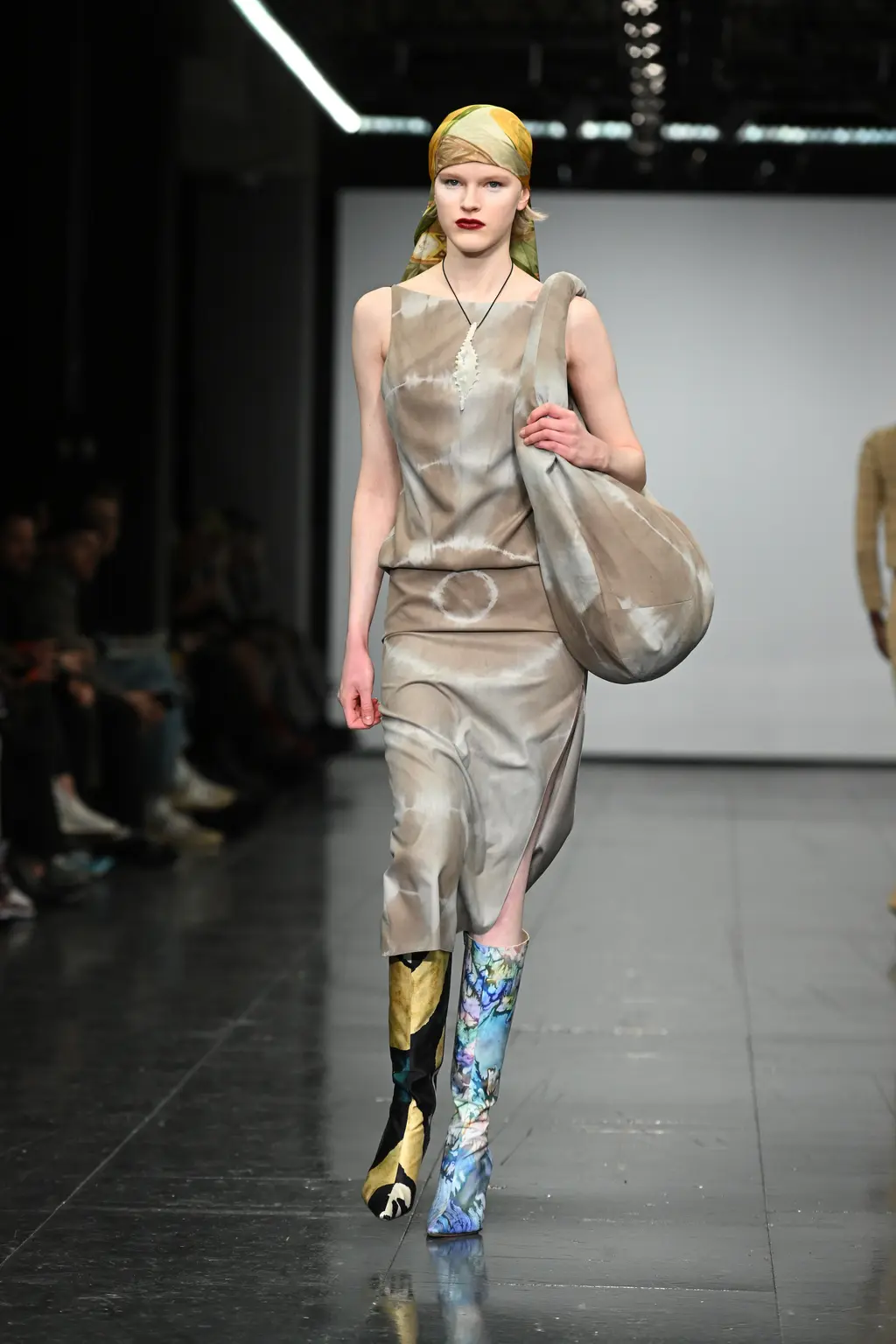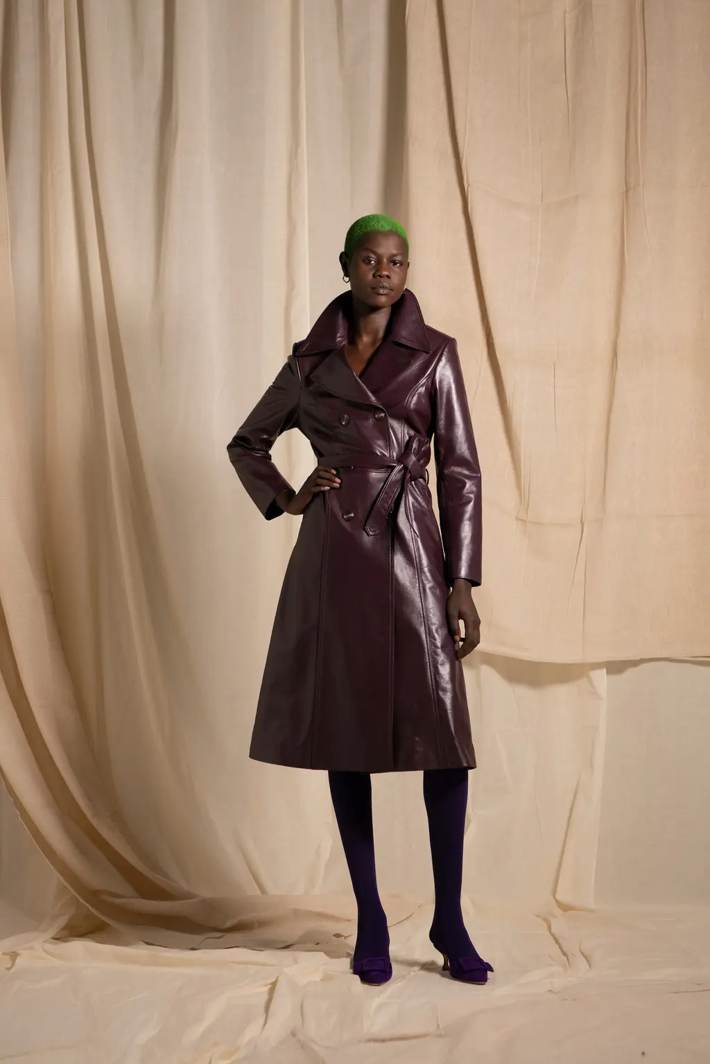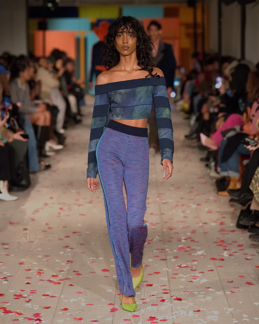 Richard Malone’s not averse to setting a scene. Last season he went so far as to frame several models with swathes of fabric rearing up and out from their shoulders, like stage curtains or the plush interiors of a ‘50s couture salon. This time there were no such theatrics, but the sense of grandeur remained. There is something of the grand dame about Malone’s designs. They’re still cutting edge – not only in their execution and shapes, but also their sustainable approach to deadstock fabrics and making pieces to order or in limited edition – but there’s a worldly sensibility to them. Some of these recycled jersey pieces wouldn’t look out of place on a modern-day Greta Garbo. There’s a playfulness to it too: two-tone candy-coloured separates; purple, yellow and burnt orange ribboned stockings that seem both entirely modern and straight out of the 16th Century; and a trio of trench coats with huge lapels, seductive in their simplicity and tantalising in their suggestion of slinking down the street in punchy, powder blue leather.