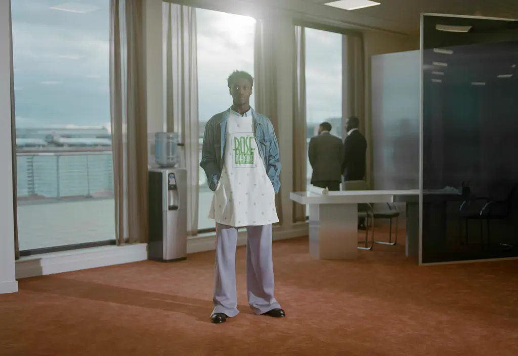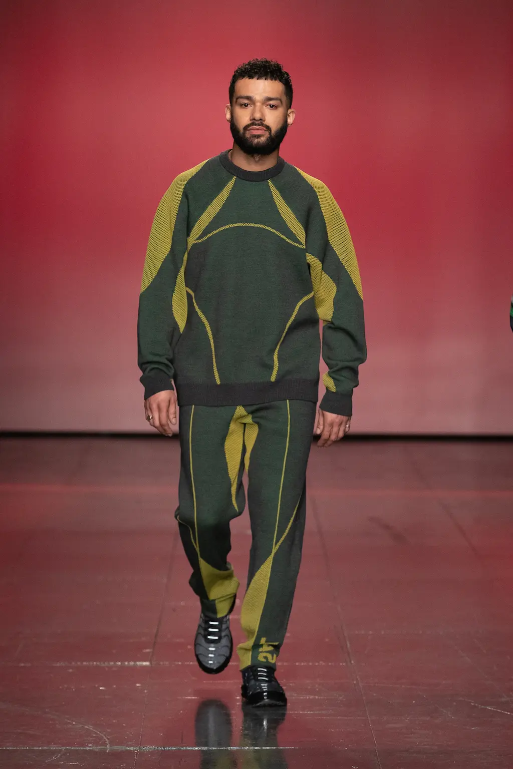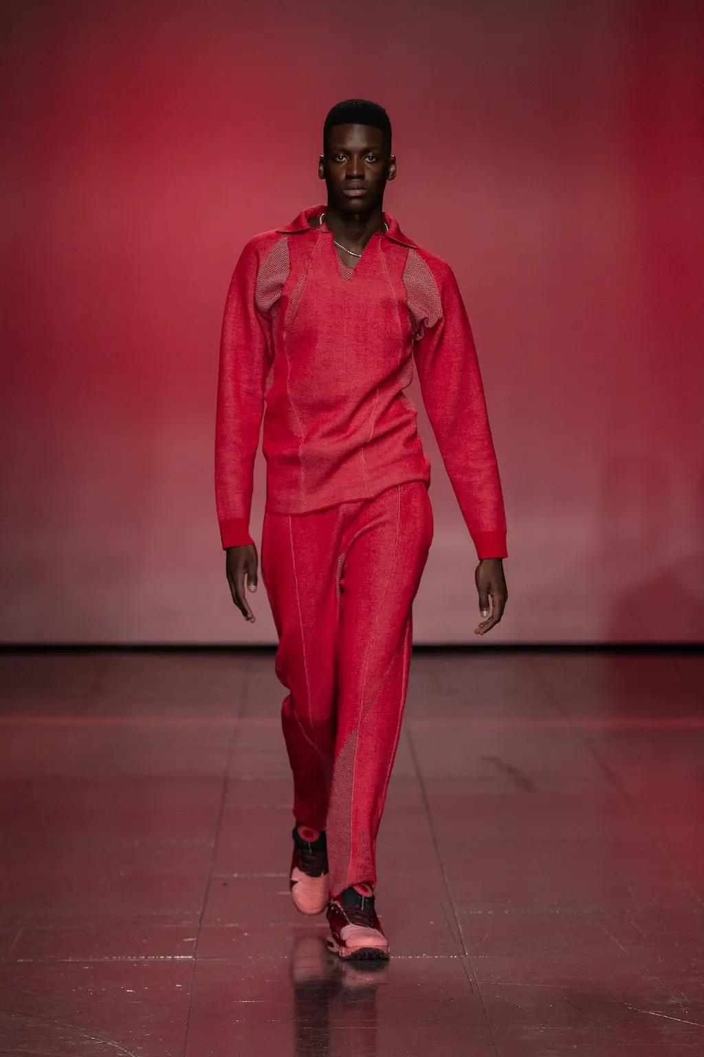 Saul Nash’s designs always suggest a pleasing balance between high tech precision and fluidity. Nash, a trained dancer, cares about making clothes that feel good to move in, and his collection that opened London Fashion Week this season was no exception. Accompanying the runway showcase was a video shot by Nash’s partner and collaborator Fx Goby which pays homage to Gee Artrey, one of London’s first Black barbers. In it, one can almost hear the quiet swish and slide of fabric beneath the music. These long standing interests in movement and community legacy come with a new folkloric twist (mermaid prints referencing water spirits present throughout African, Caribbean and Latin American mythology) and autobiographical details like a baseball shirt emblazoned with the word “GUYANA”. The oblique green and yellow prints, somewhere between a landscape and a ripple of oil, are a real stand out, as are the punchy red merino wool separates. Breathable, flexible, thoughtful: this is Nash at his best.