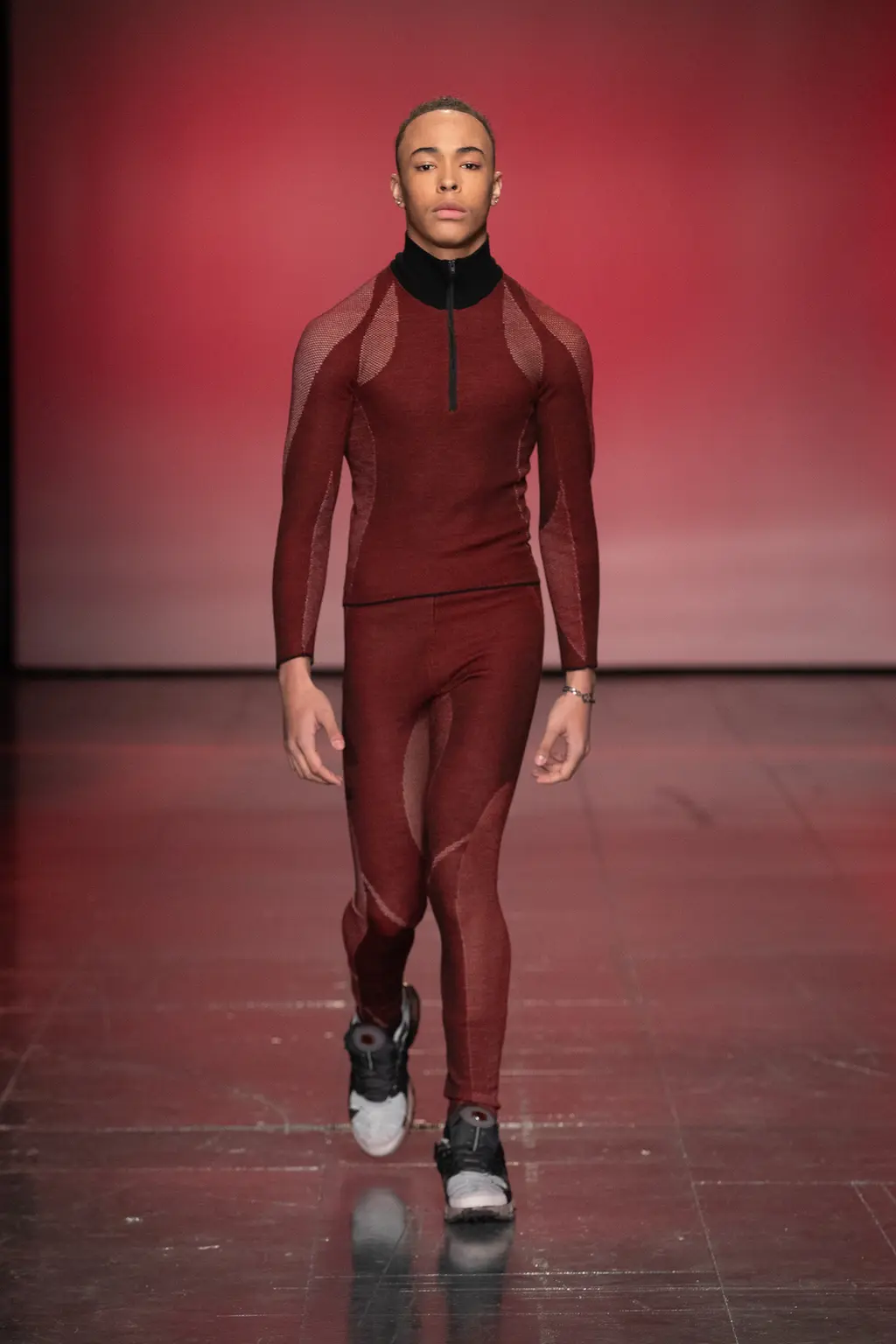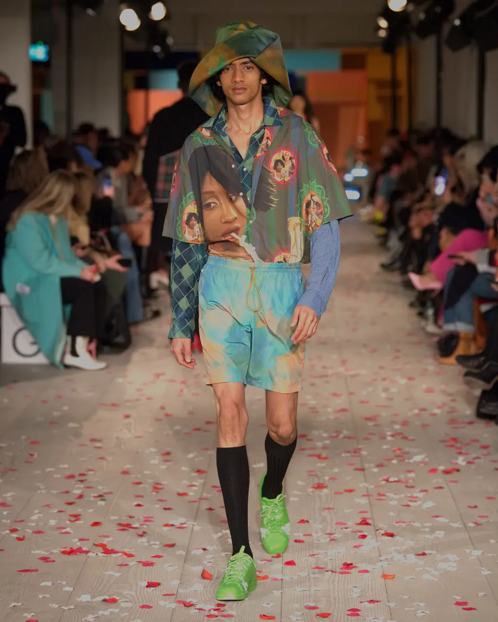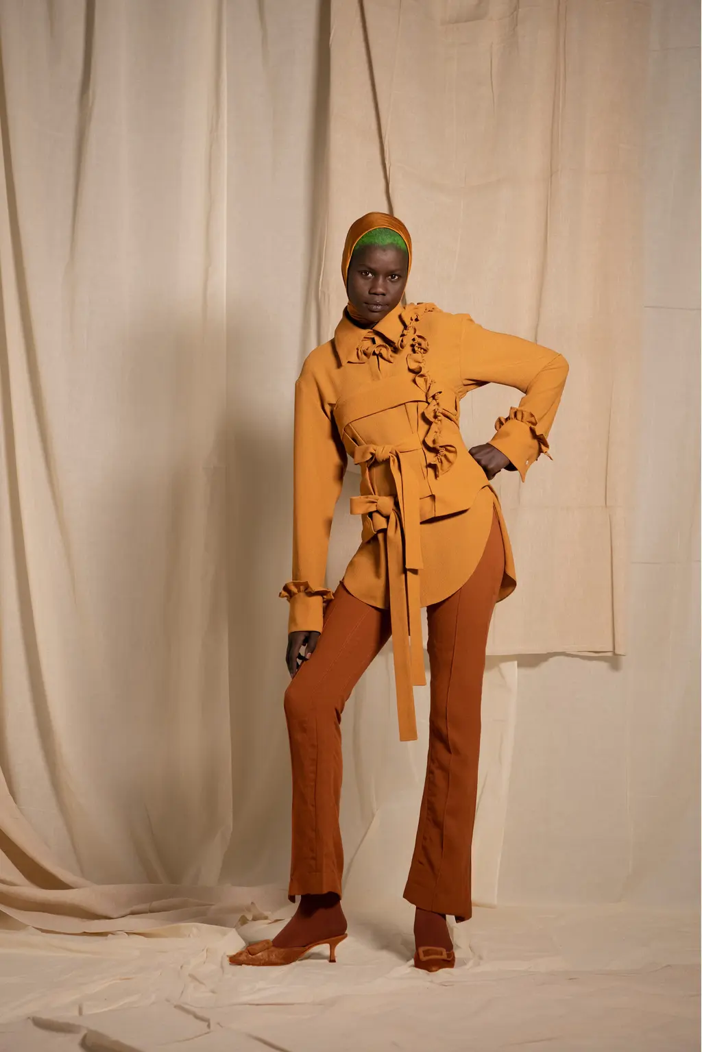 Saul Nash’s designs always suggest a pleasing balance between high tech precision and fluidity. Nash, a trained dancer, cares about making clothes that feel good to move in, and his collection that opened London Fashion Week this season was no exception. Accompanying the runway showcase was a video shot by Nash’s partner and collaborator Fx Goby which pays homage to Gee Artrey, one of London’s first Black barbers. In it, one can almost hear the quiet swish and slide of fabric beneath the music. These long standing interests in movement and community legacy come with a new folkloric twist (mermaid prints referencing water spirits present throughout African, Caribbean and Latin American mythology) and autobiographical details like a baseball shirt emblazoned with the word “GUYANA”. The oblique green and yellow prints, somewhere between a landscape and a ripple of oil, are a real stand out, as are the punchy red merino wool separates. Breathable, flexible, thoughtful: this is Nash at his best.