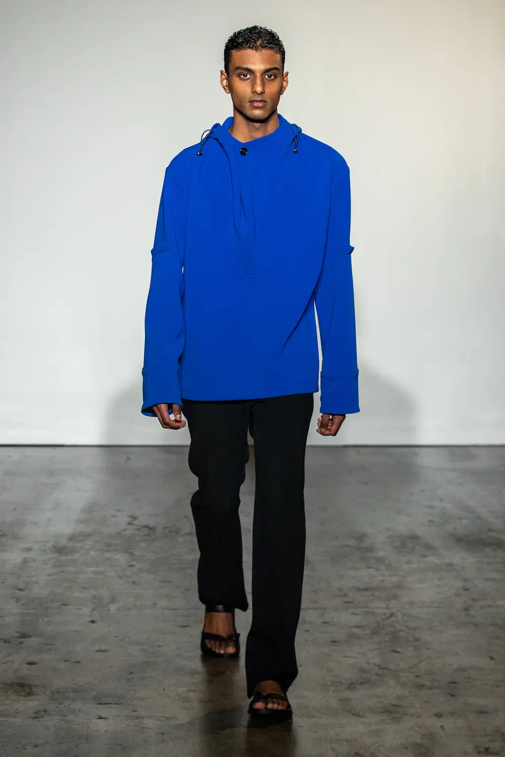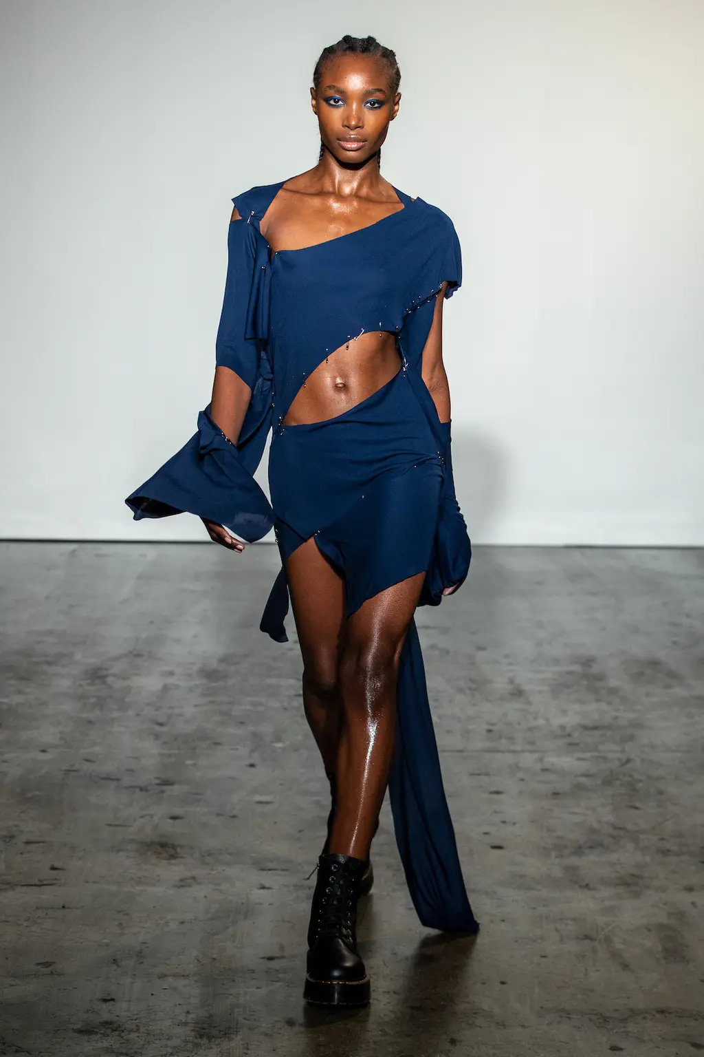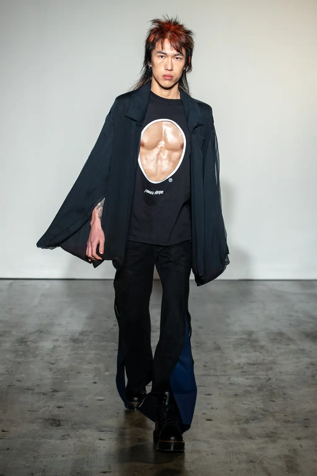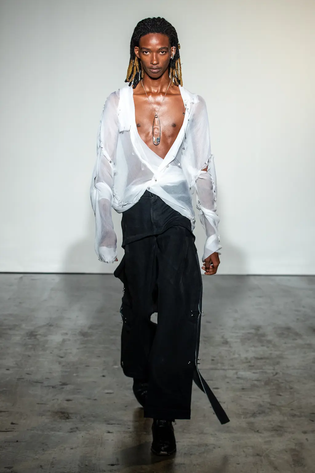 “My work is a lot about storytelling, but for this collection I felt I needed to present something where you understand the clothes themselves, so I had to strip everything back like the printing and the storytelling, to focus on the cut and the shapes.” So says Jawara Alleyne, one of the trio of designers showing under Lulu Kennedy’s Fashion East incubator this season, which also includes Chet Lo and Maximilian – and each of them have a different relationship with the balance between narrative and design process. In Alleyne’s case, this newly claimed focus yielded drapery aplenty and enough safety pins to make a young Sex Pistol happy.