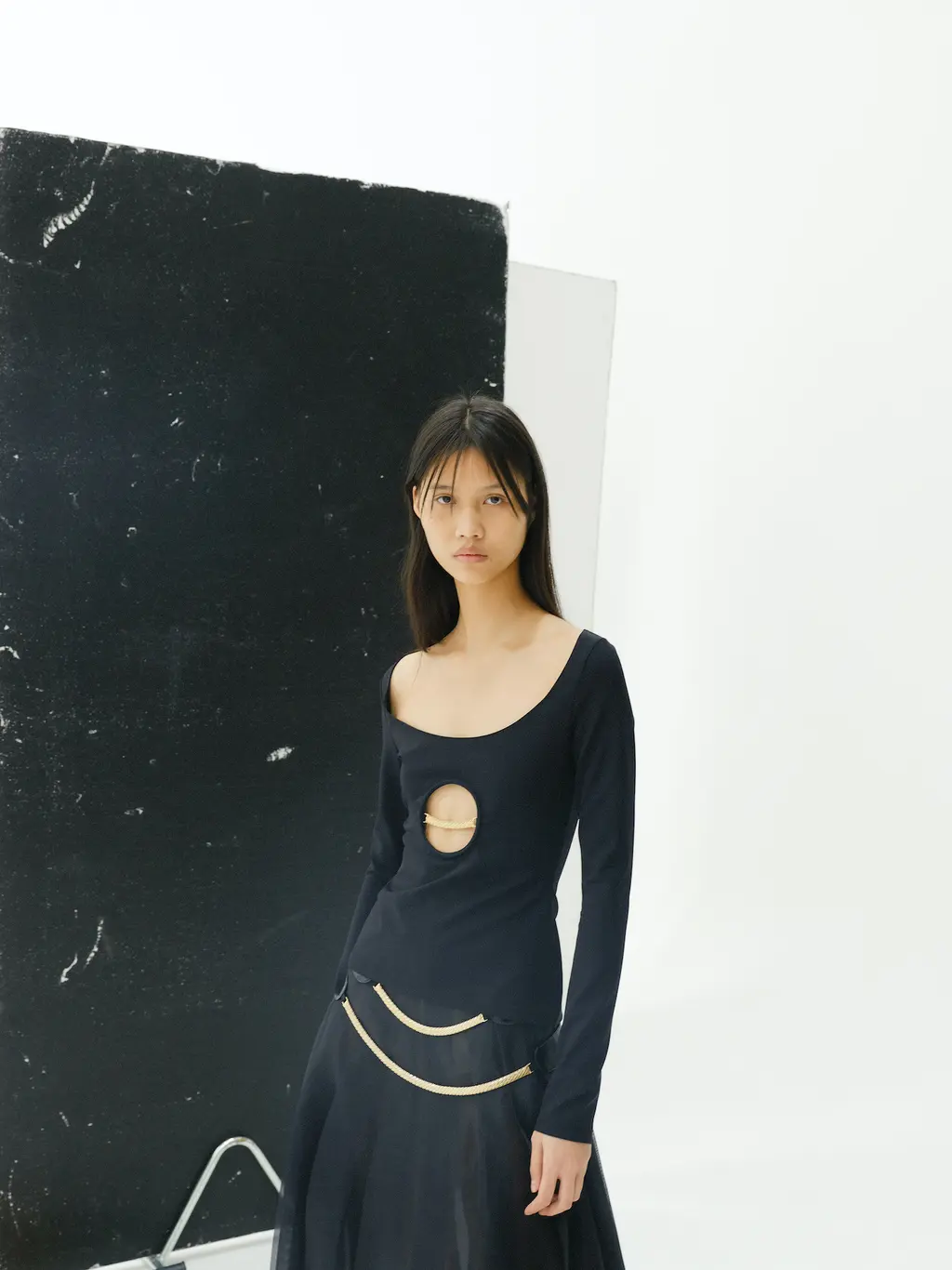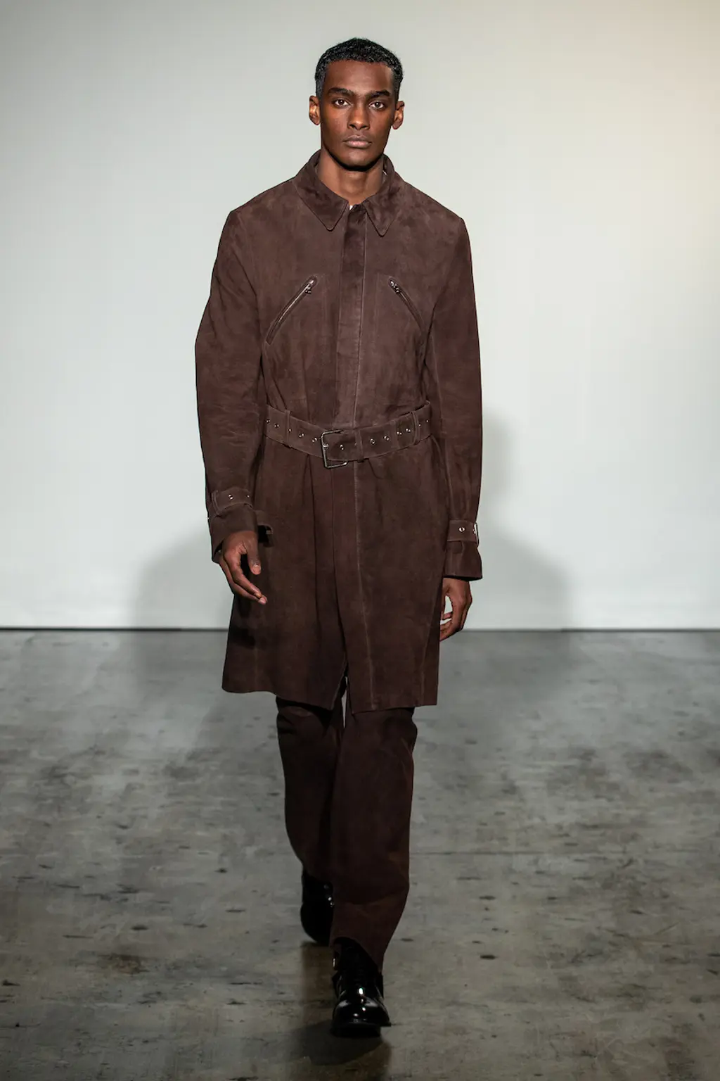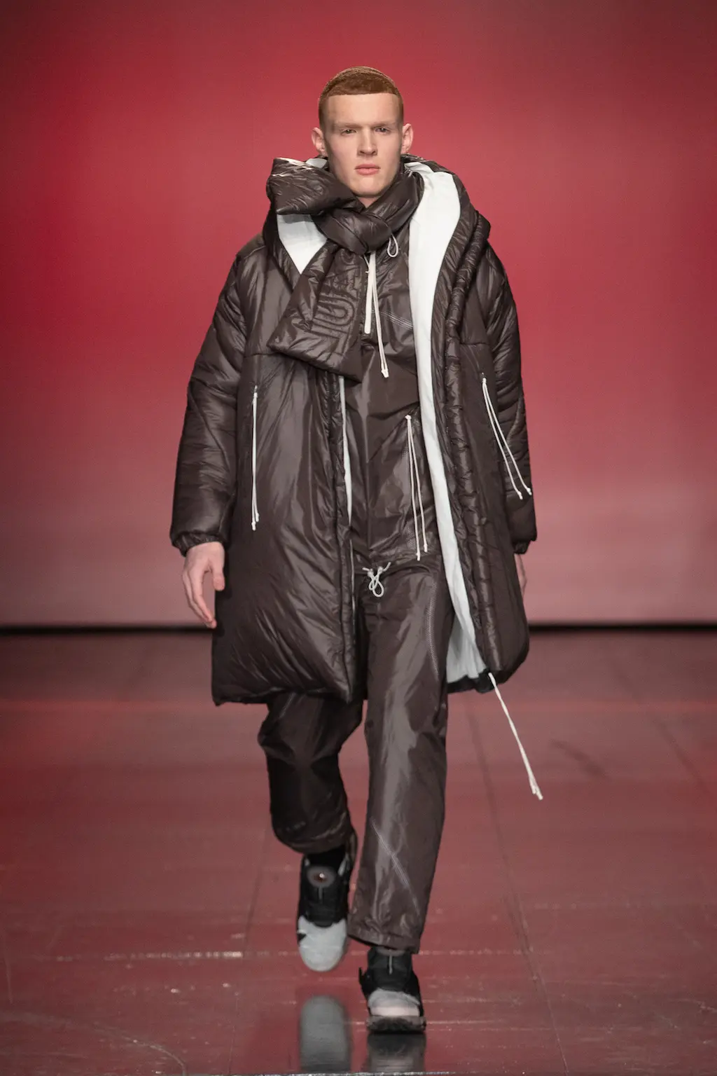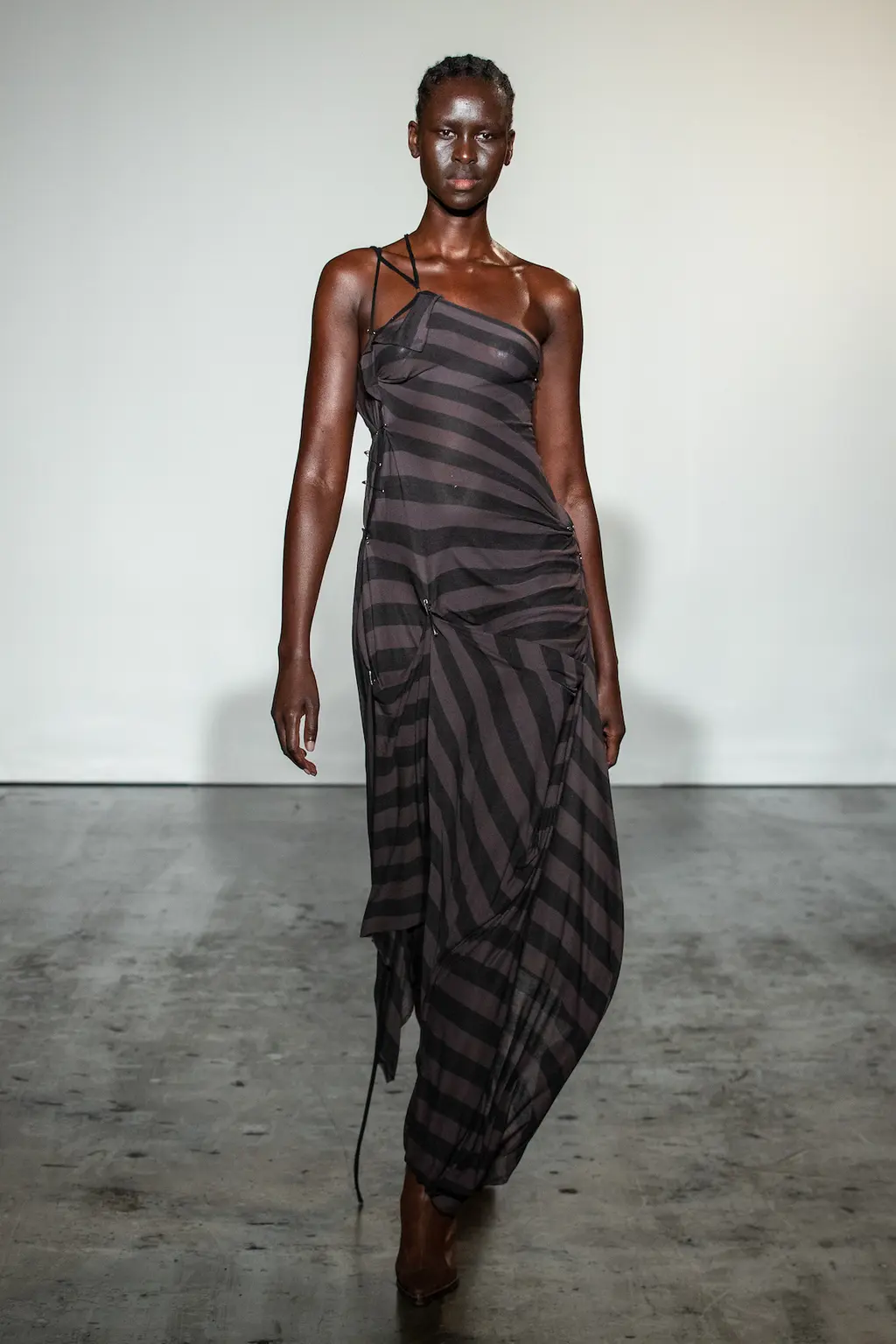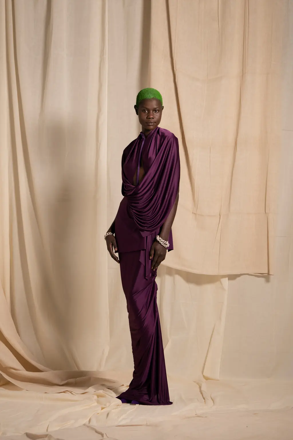 “My work is a lot about storytelling, but for this collection I felt I needed to present something where you understand the clothes themselves, so I had to strip everything back like the printing and the storytelling, to focus on the cut and the shapes.” So says Jawara Alleyne, one of the trio of designers showing under Lulu Kennedy’s Fashion East incubator this season, which also includes Chet Lo and Maximilian – and each of them have a different relationship with the balance between narrative and design process. In Alleyne’s case, this newly claimed focus yielded drapery aplenty and enough safety pins to make a young Sex Pistol happy.