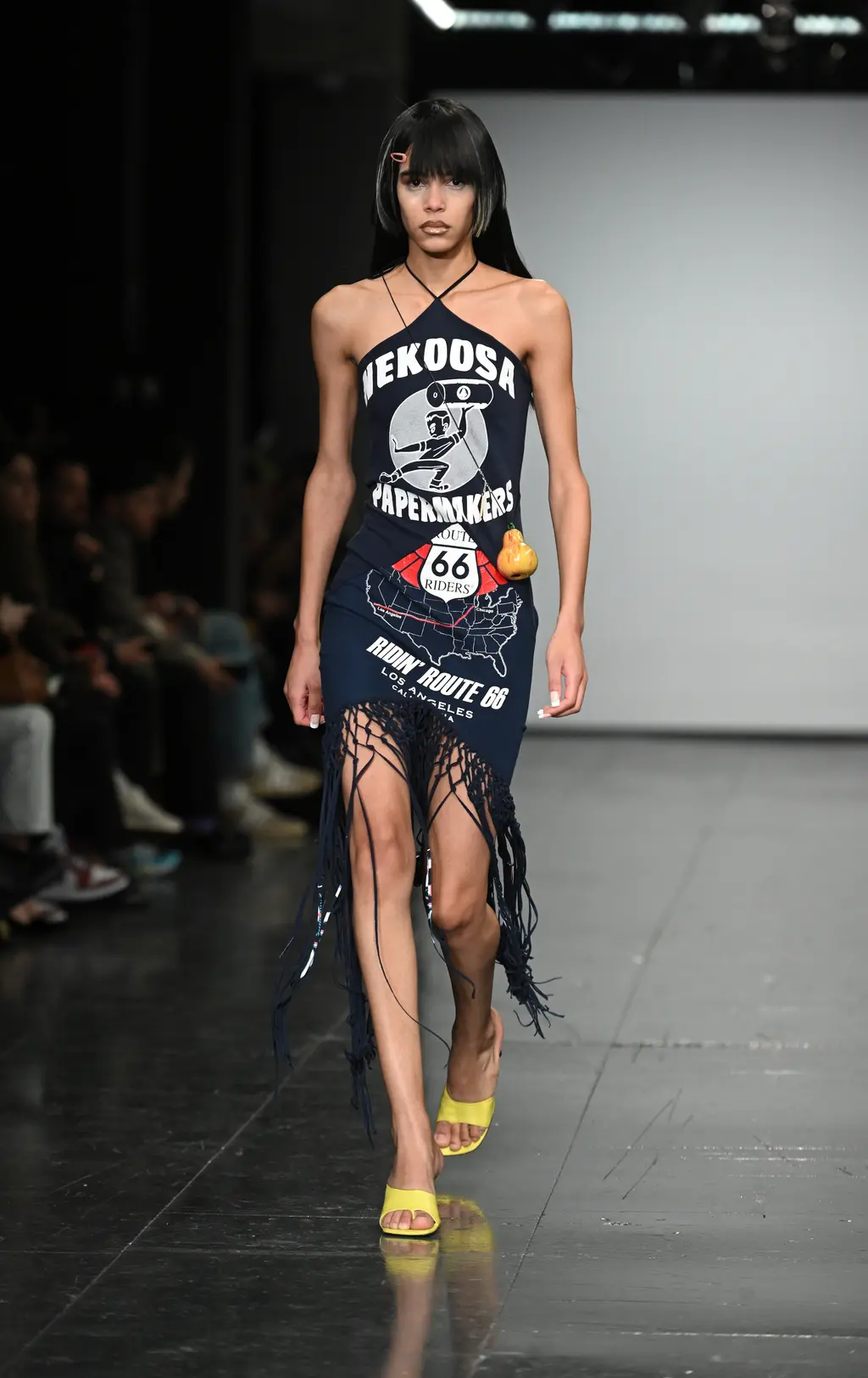 Fashion designers love to talk about designing for a certain type of woman. A sexy woman. A sophisticated woman. A woman who reminds them of their mother putting on lipstick before an evening out. Bright young thing Conner Ives pushes this one step further, by centring each collection around a series of pop culture archetypes. For his first, buzzy runway show, the New York-born designer debuted “The Vogue Girl”, a Devil Wears Prada homage complete with page boy cap and buttercup yellow pea coat crafted from military Polish blankets; and “Devil in a Red Dress”, a Cruella de Vil vision in crimson crystals. Other namechecks went to Jackie O, Sharon Tate, Adriana la Cerva, and Ives’ cowgirl Aunt Marilee from New Mexico. Featuring a mishmash of reconstituted fabrics, bias cuts, sexy silk fringing and kitsch Americana, Ives reveals his age in his preoccupations – the interest in reality TV and “Y2k girlies” suggests a real keenness to flag his formative influences – but the results are impressively assured.