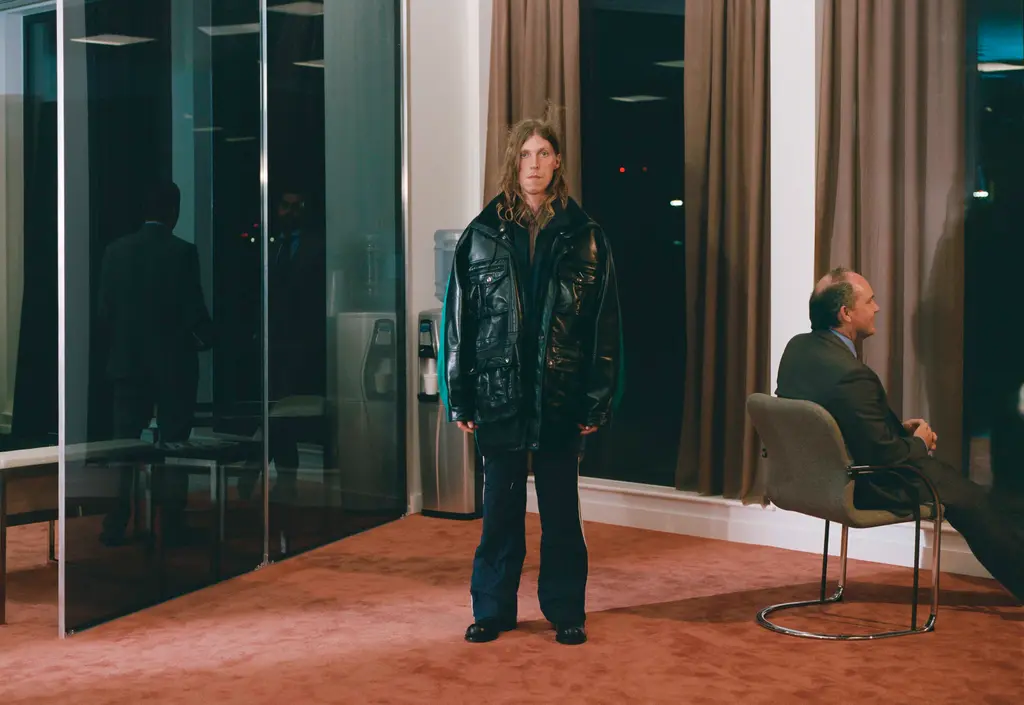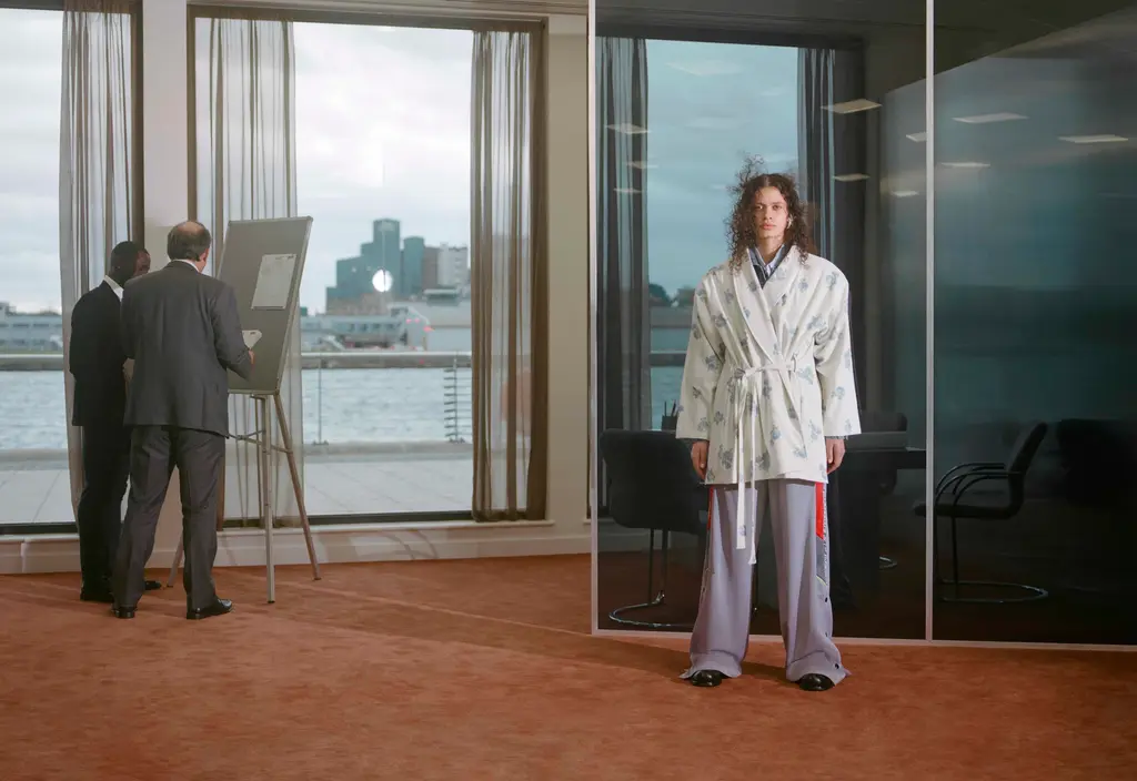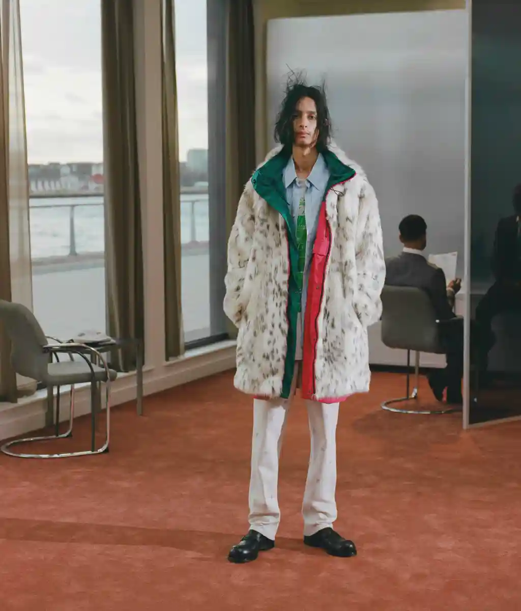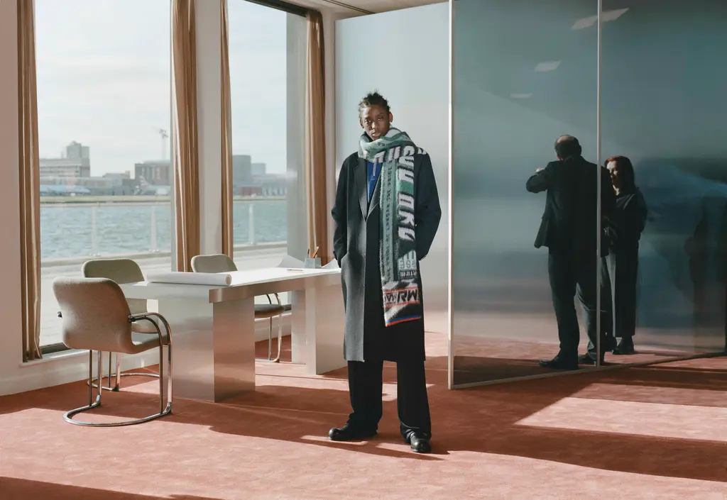 For AW22, Martine Rose’s models took to swanky office spaces, showing off wares as fit for the 9 – 5 as they are for going out-out, or even slipping into bed after hours. After all, the boundaries between the two have all but disappeared over the last two years, which is exactly what Rose sought to reflect. Traditionally sporty silhouettes are subverted and sharpened up into more professional attire, like wide-shouldered suits and signature heavy set knits, offset by quilted granny ponchos. There are oversized leather coats, logoed tees, scarves so big they’d give Lenny Kravtiz a run for his money, and even an apron thrown in for good measure. But make no mistake: each detail has been carefully thought through, down to Japanese pleated denim and use of deadstock fabric such as power mesh, made over decades and now discontinued. Inspired by the haphazardness of searching through a pile of clothes before making it to work or frantically getting yourself dressed for a job interview on a hangover, this collection is anything but unintentional – and that’s just what Rose was going for.
