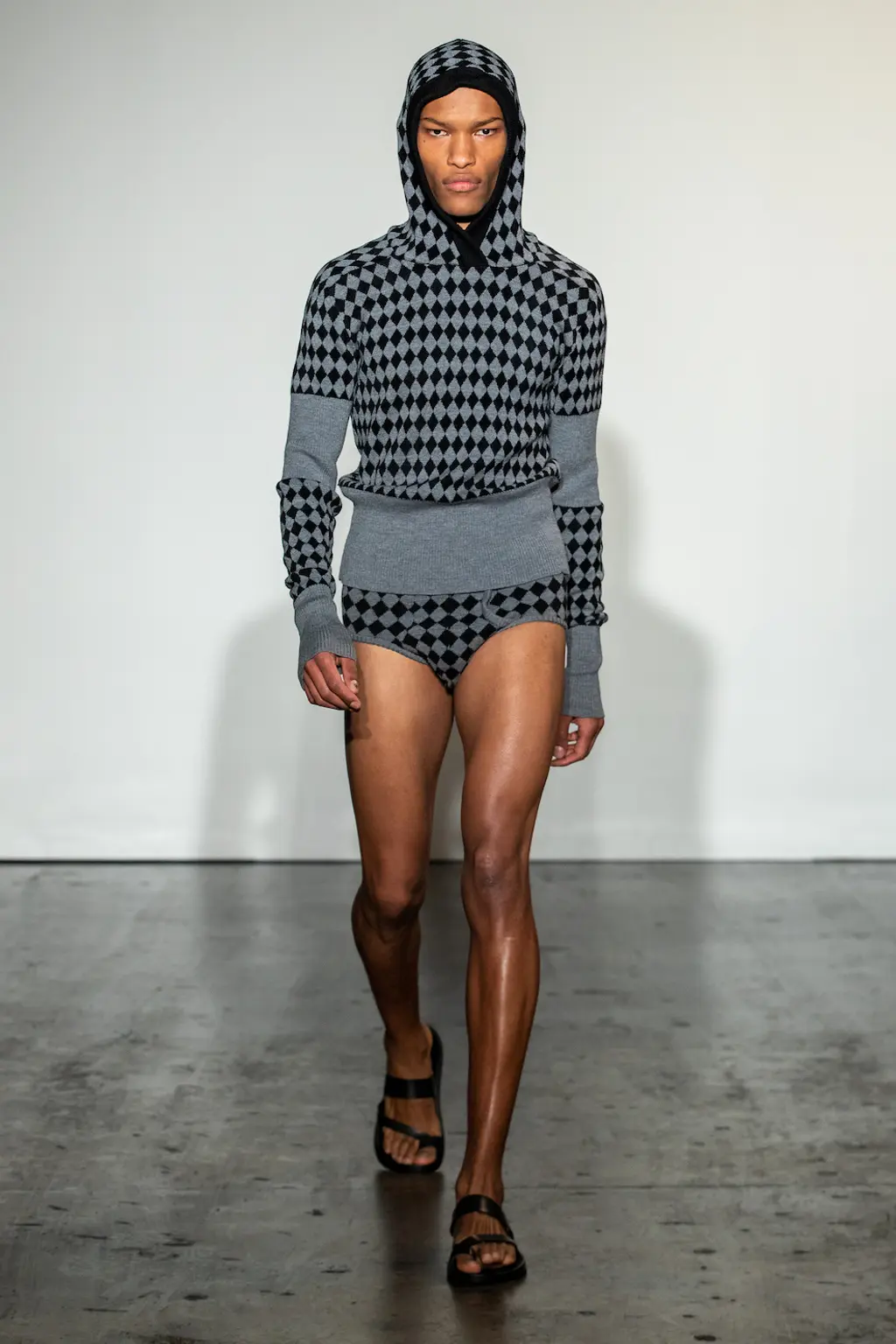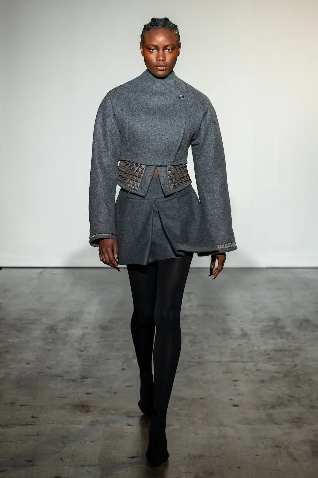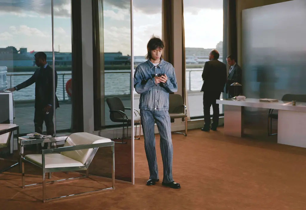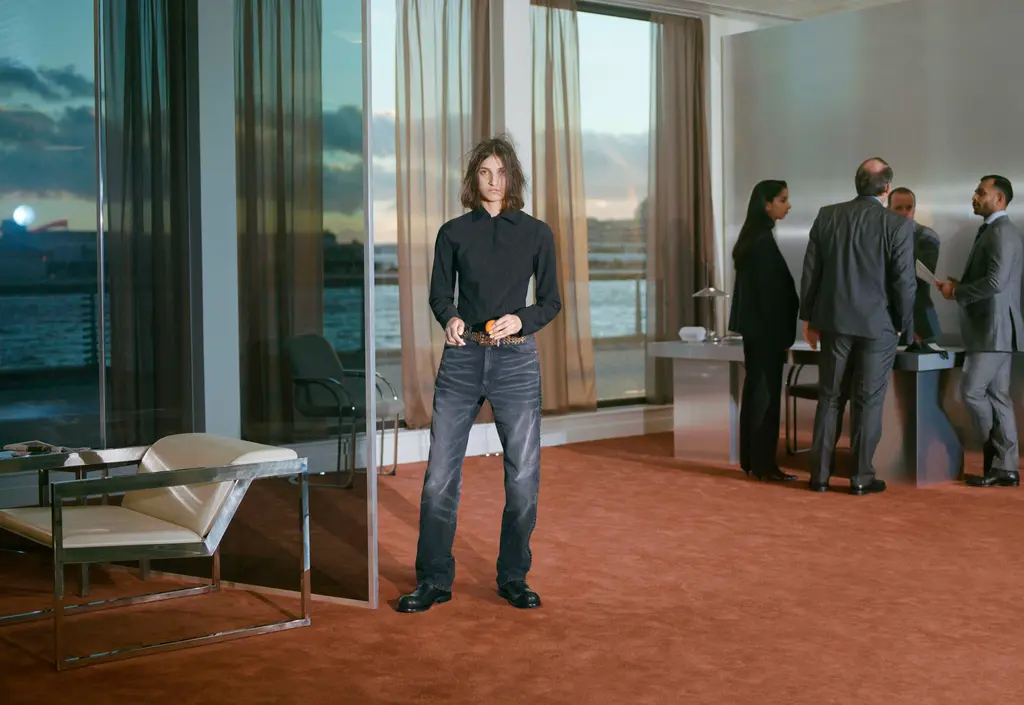 For AW22, Martine Rose’s models took to swanky office spaces, showing off wares as fit for the 9 – 5 as they are for going out-out, or even slipping into bed after hours. After all, the boundaries between the two have all but disappeared over the last two years, which is exactly what Rose sought to reflect. Traditionally sporty silhouettes are subverted and sharpened up into more professional attire, like wide-shouldered suits and signature heavy set knits, offset by quilted granny ponchos. There are oversized leather coats, logoed tees, scarves so big they’d give Lenny Kravtiz a run for his money, and even an apron thrown in for good measure. But make no mistake: each detail has been carefully thought through, down to Japanese pleated denim and use of deadstock fabric such as power mesh, made over decades and now discontinued. Inspired by the haphazardness of searching through a pile of clothes before making it to work or frantically getting yourself dressed for a job interview on a hangover, this collection is anything but unintentional – and that’s just what Rose was going for.