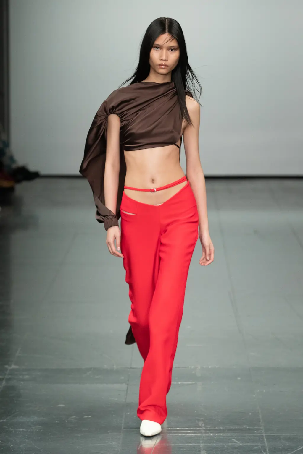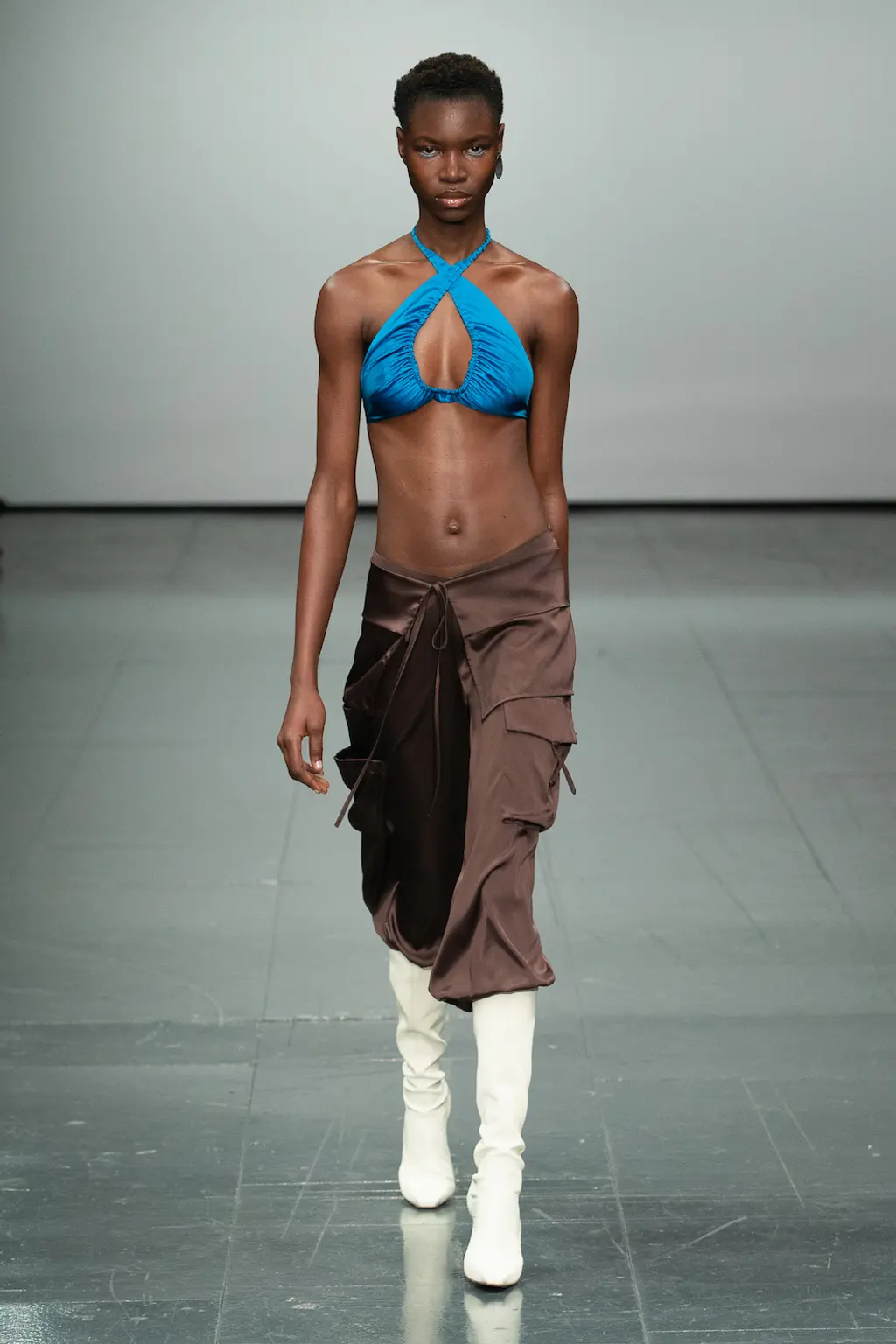 There’s a defining silhouette in fashion right now. It’s slashed, draped, tied and full of keyholes. It exposes triangles of midriff and a lot of collar bone. The fabrics are shiny or diaphanous, as if a Greek goddess who chopped off her dress hem fell into a timehole and staggered out at the turn of the millennium. Supriya Lele is a key proponent of this flesh-emphasising, body-exposing look. She’s part of a cohort of designers mixing autobiography (in Lele’s case, vivid memories of watching female relatives help each other arrange their saris) with a yen for the style – and, perhaps more importantly, the aura – of the Nineties and Noughties. Lele’s latest collection refines these preoccupations in a palette of dusky browns, cool blues, and bright yellows and reds. Designs are focused on the hip rather than the waist, mini-skirts and trousers slung low. It’s knowingly cool, and likely to furnish a lot of nights out this year.