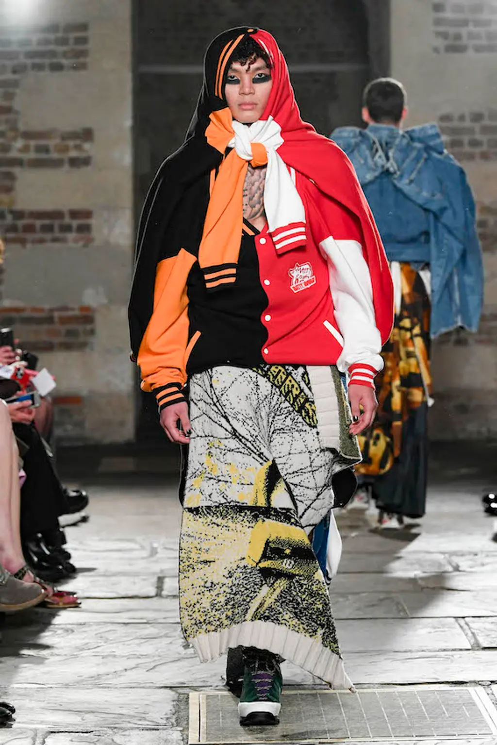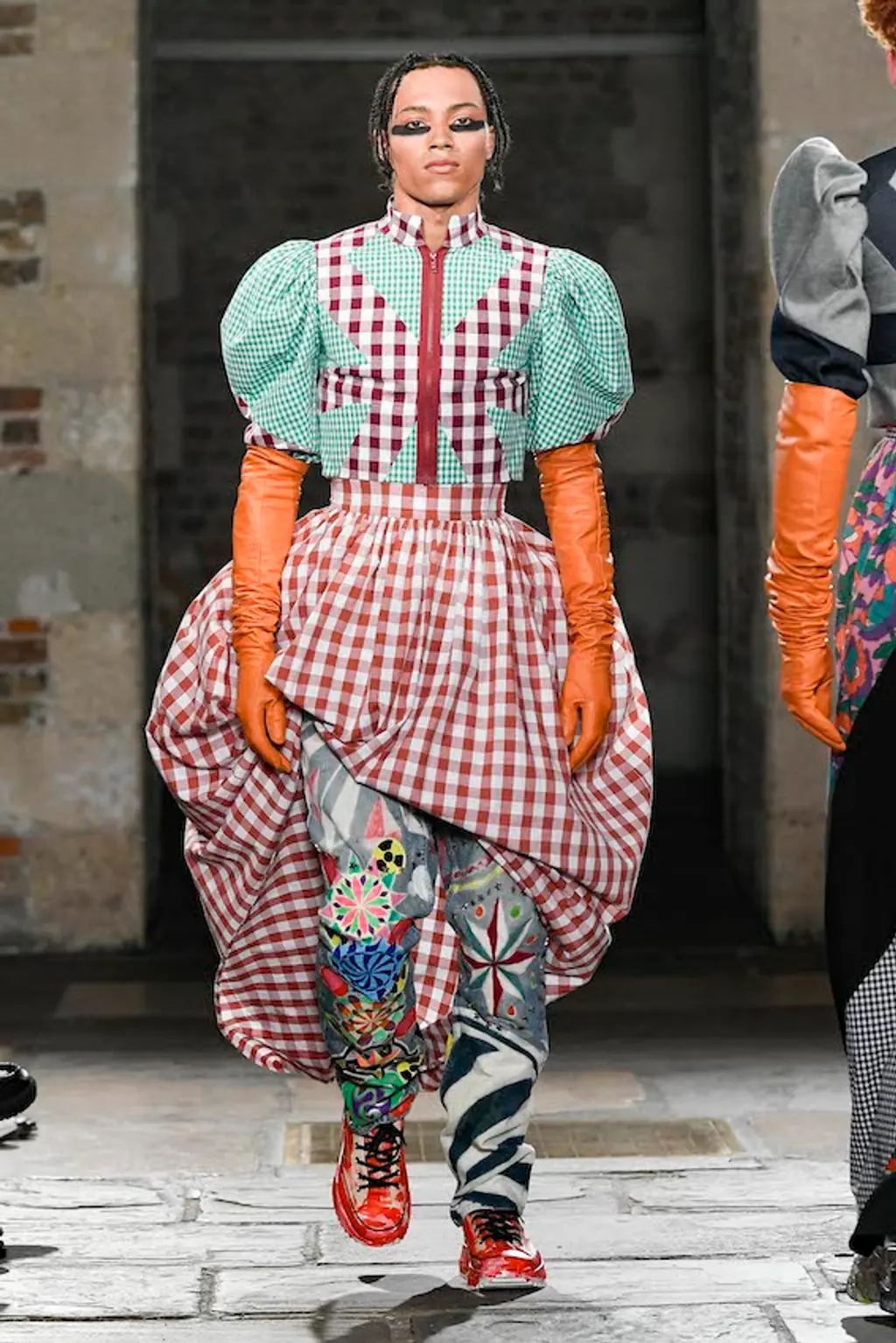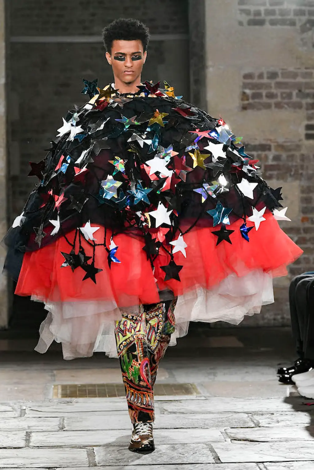 There’s obviously a breeze blowing over the Atlantic, because Matty Bovan’s first physical show in two years also had a strong American twang. Bovan, whose designs look like the lovechild between Vivienne Westwood, Bodymap, and a particularly fruitful jumble sale, developed this collection during a two-month stay in Connecticut with his boyfriend. The result, titled Cyclone (Bovan loves a reference to weathering the elements), invokes chaos and a very American kind of dream in patchworked plaids and hulking linebacker shoulders, not to mention that staple of punk – a much destroyed and distorted star-spangled banner. In a bid for radical re-use, the collection also borrowed heavily from other brands. Calvin Klein jeans, Adidas sportswear and a puffball gown by Roksanda Ilincic all got the Matty Bovan treatment, broken down and rebuilt into something wonderful and strange: a chorus line of tracksuit jacket arms swinging around one model’s legs in skirt form.