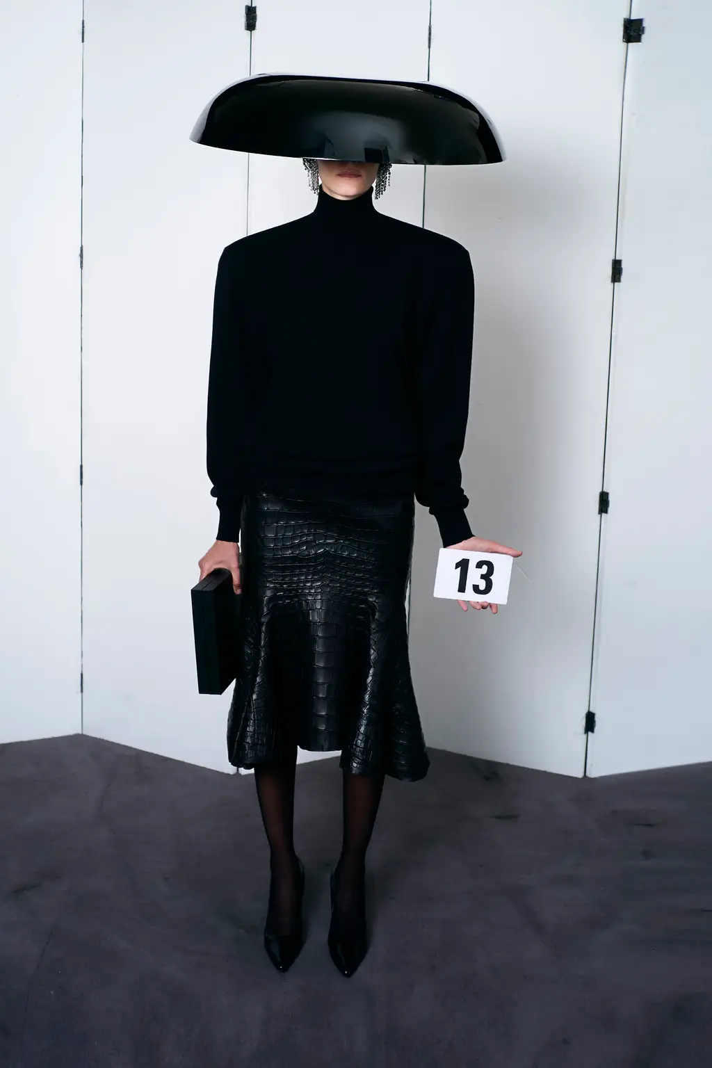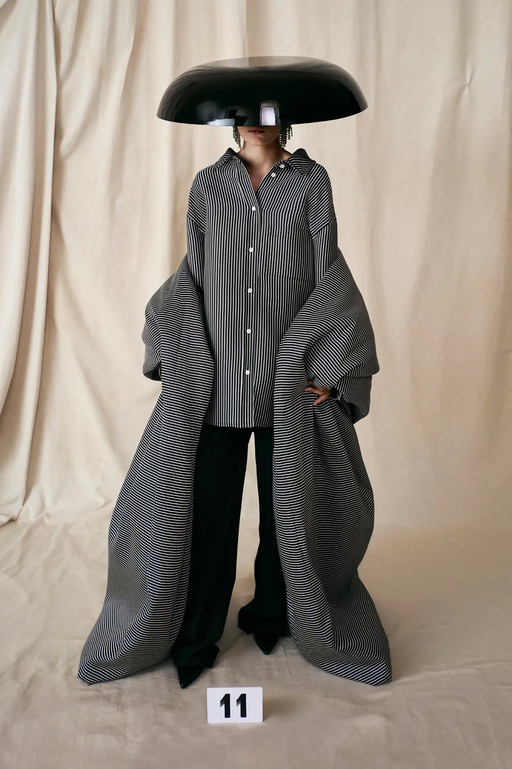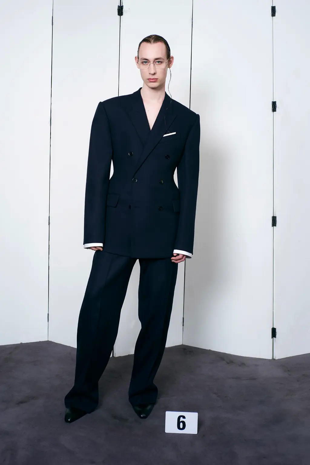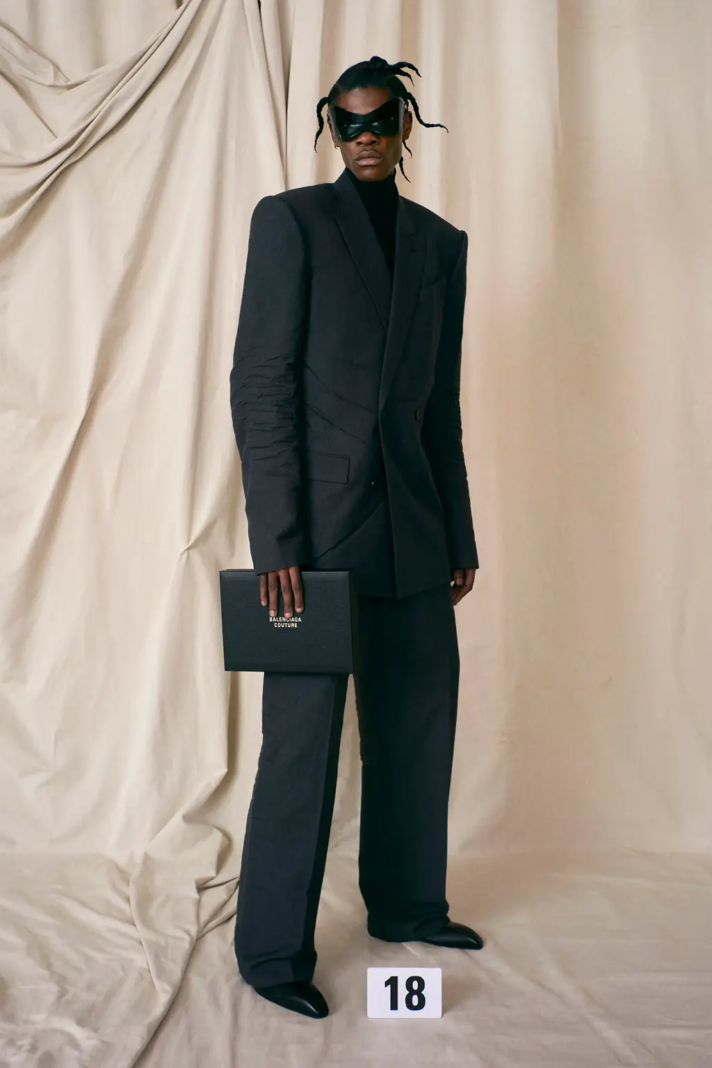 The first half of the collection was dominated by impeccable tailoring. Black, sombre suits cut with Gvaslia’s signature cinched waists and broad shoulders, and jackets that drown the body and sit neatly at the hip. In a nod to founder Cristobal Balenciaga – whose reputation as a couturier had Christian Dior refer to him as “the master of us all” – C.B initials were hand-embroidered on silk ties, poplin shirts and leather gloves, while Gvasalia opted for mohair, cashmere and barathea wool directly inspired by the fabrics Balenciaga wore.