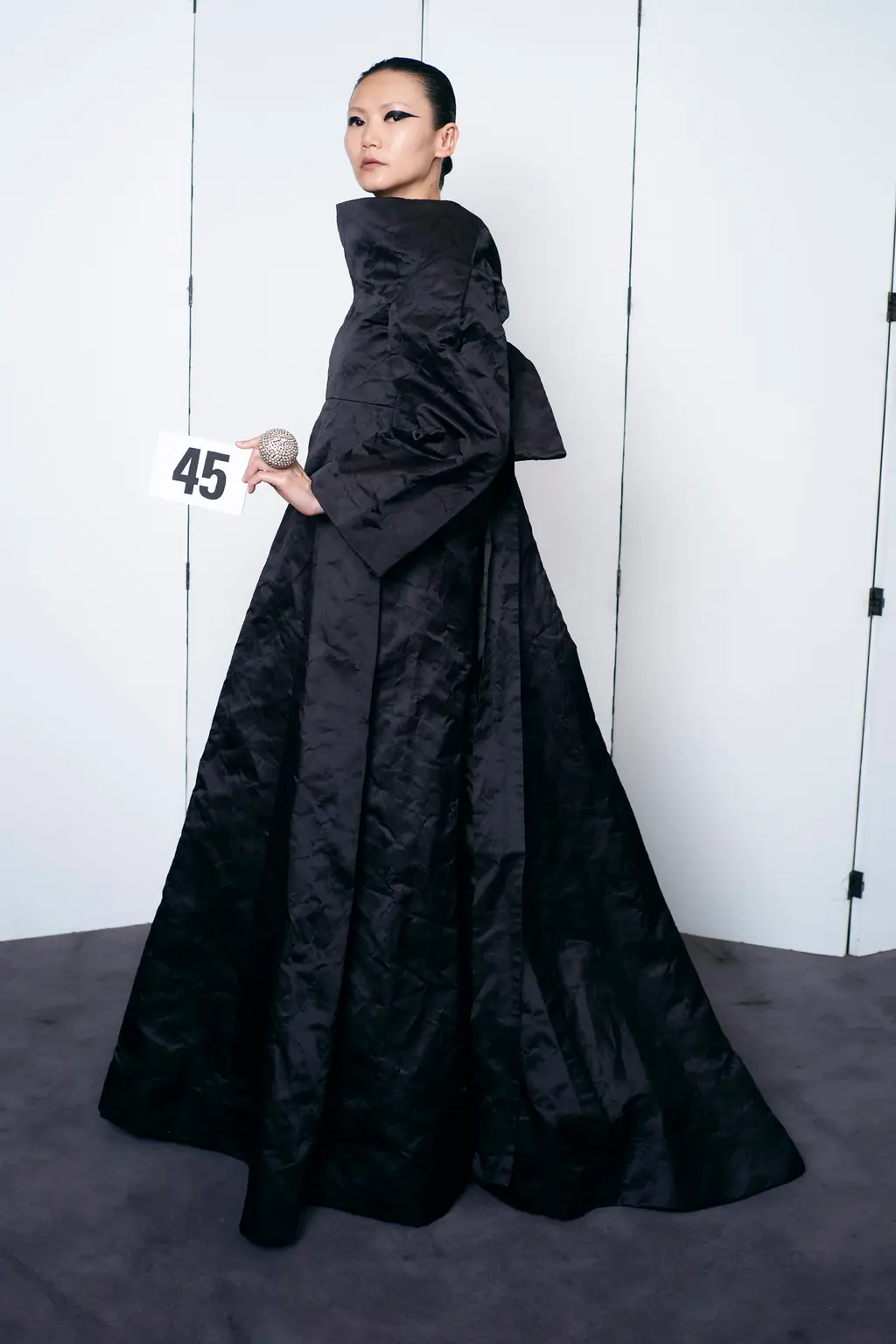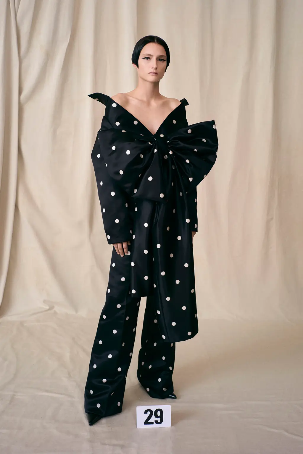 Then in walked the gowns. Dramatic, floor-sweeping, cut to exquisite proportion and striking a balance between old and new. Opera gloves? Sure. A sequinned mini dress? Great. Dresses were twisted in lace and tulle, polka-dot patterns hand printed on silk chiffon. Shapes were maximised to thrilling effect, like on a bright pink, long-sleeved gown that starts as a utility jacket at the top, buttoning to the neck, and flowing to the ground from the waist, ballooning in size.