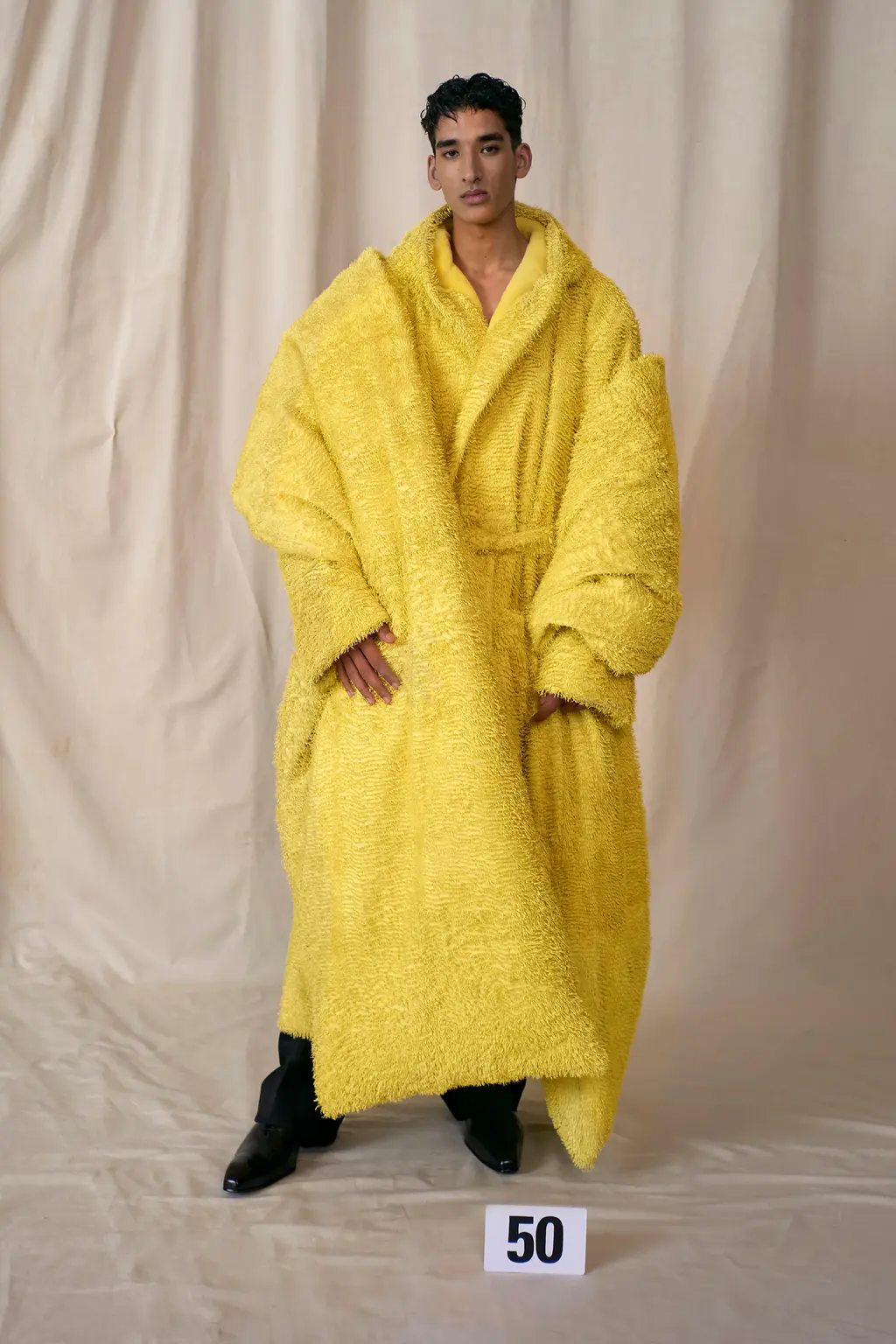 For regality (this is couture, now), Gvsalia included robes, fluffy in texture and wearable enough to just about avoid comparisons to a comforting nightgown. Their shapes nodded more to Hampton Court than they did the bathroom, tied at the waist with arms covered in heavy micro-knifed leather.