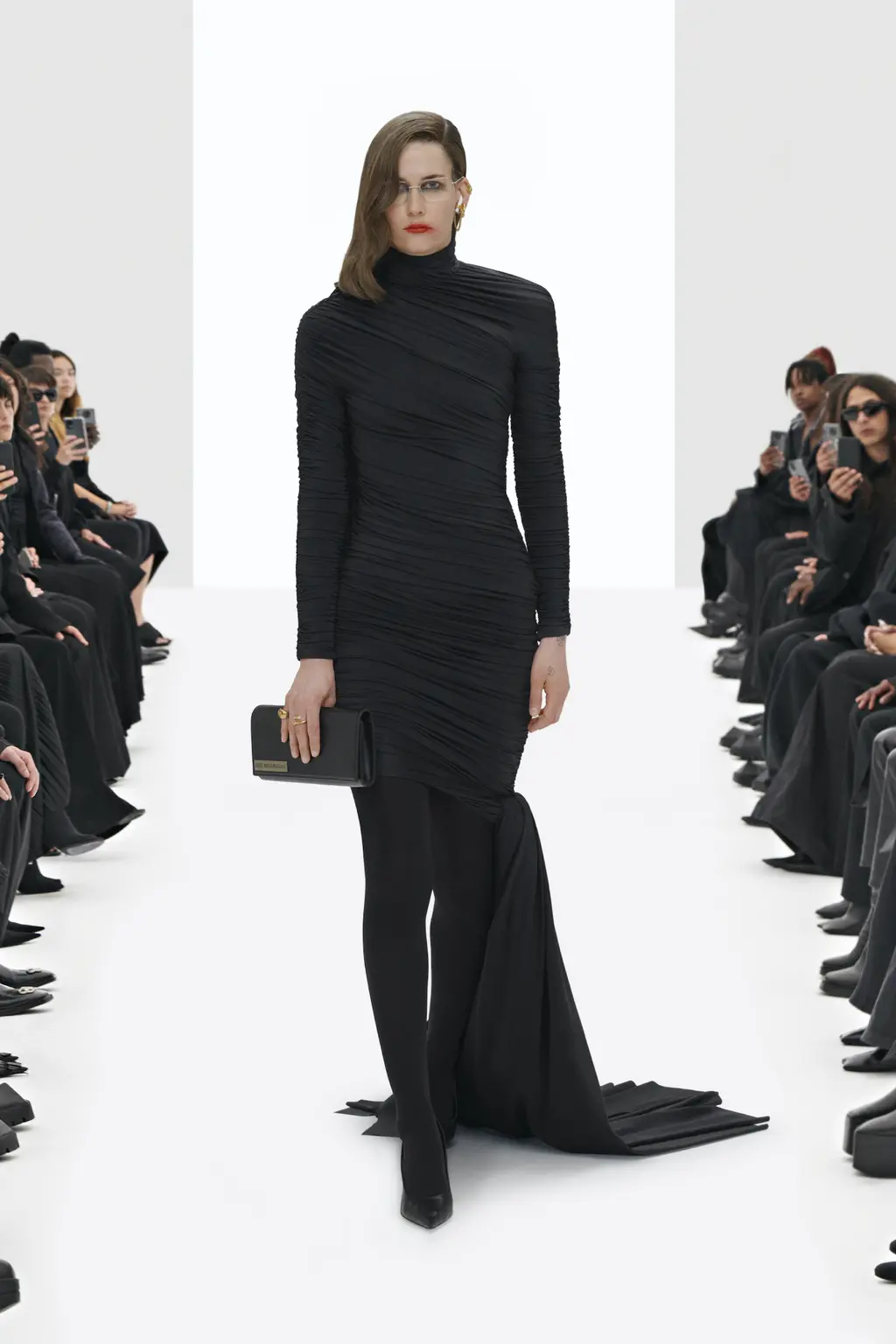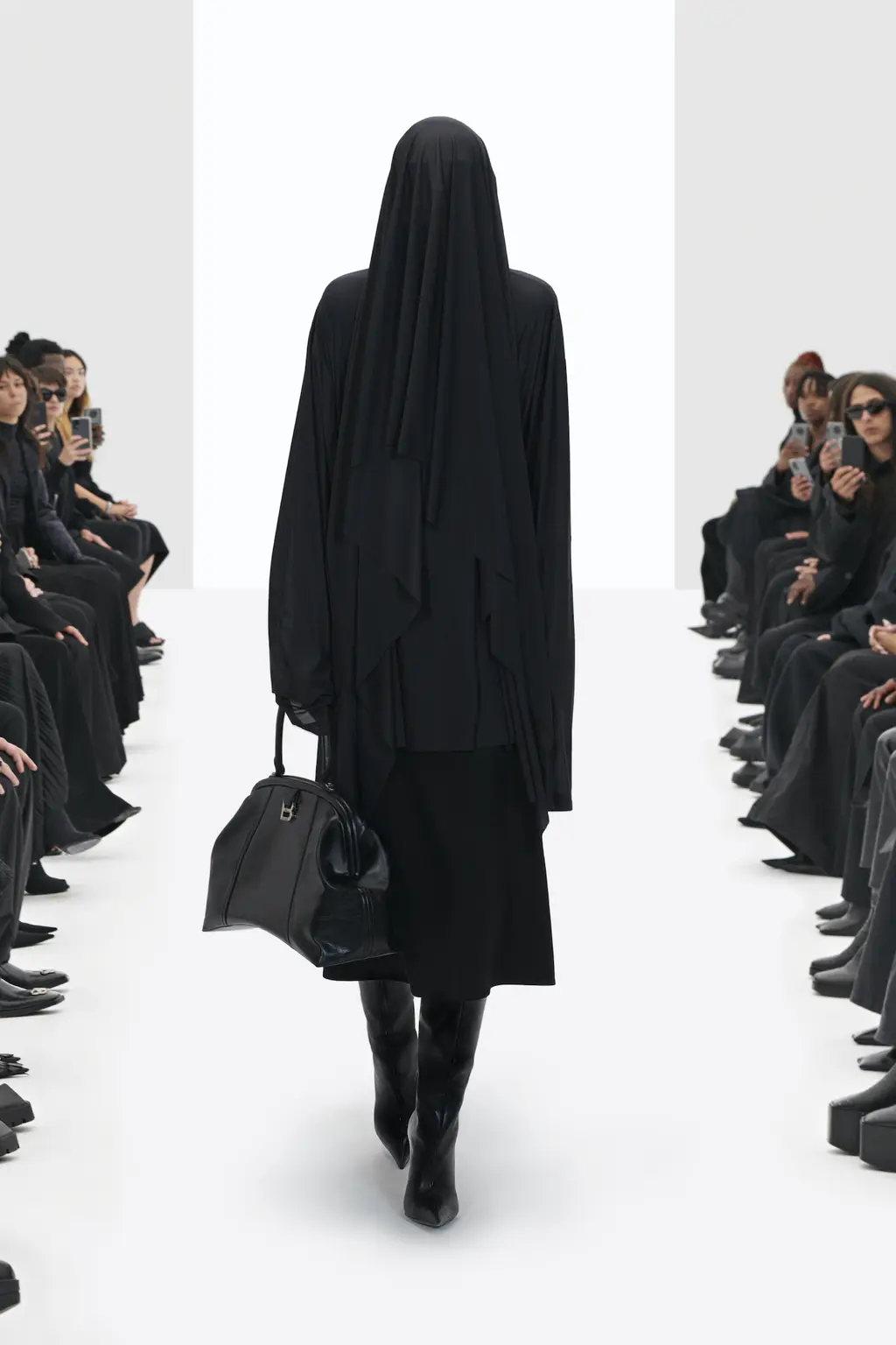 Cut to a bright white presentation space, with a maskless audience wearing all-black. It didn’t take long to realise that we were watching a simulated fashion show, albeit an incredibly realistic one.