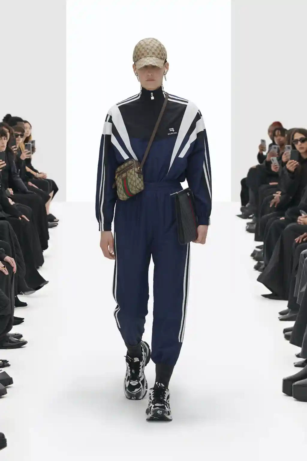 The fake fun didn’t stop there. The collection also included a take two of The Hacker Project, last season’s collaboration between Gucci and Balenciaga, which saw Alessandro Michele interpret many of Gvasalia’s Balenciaga signatures for the Gucci runway. For his return match, Gvasalia “copied” Michele’s double G buckle belt, replacing “GG” with “BB”, as well as a number of classic Gucci bag styles also bearing a “BB” print. One weekend bag was playfully tagged with the words “This Is Not a Gucci Bag”, à la René Magritte, to highlight the semiotic silliness of it all.