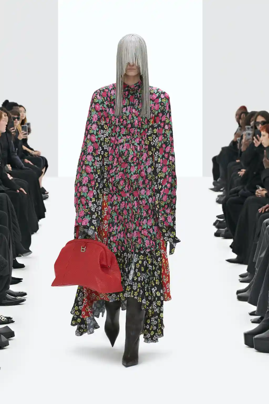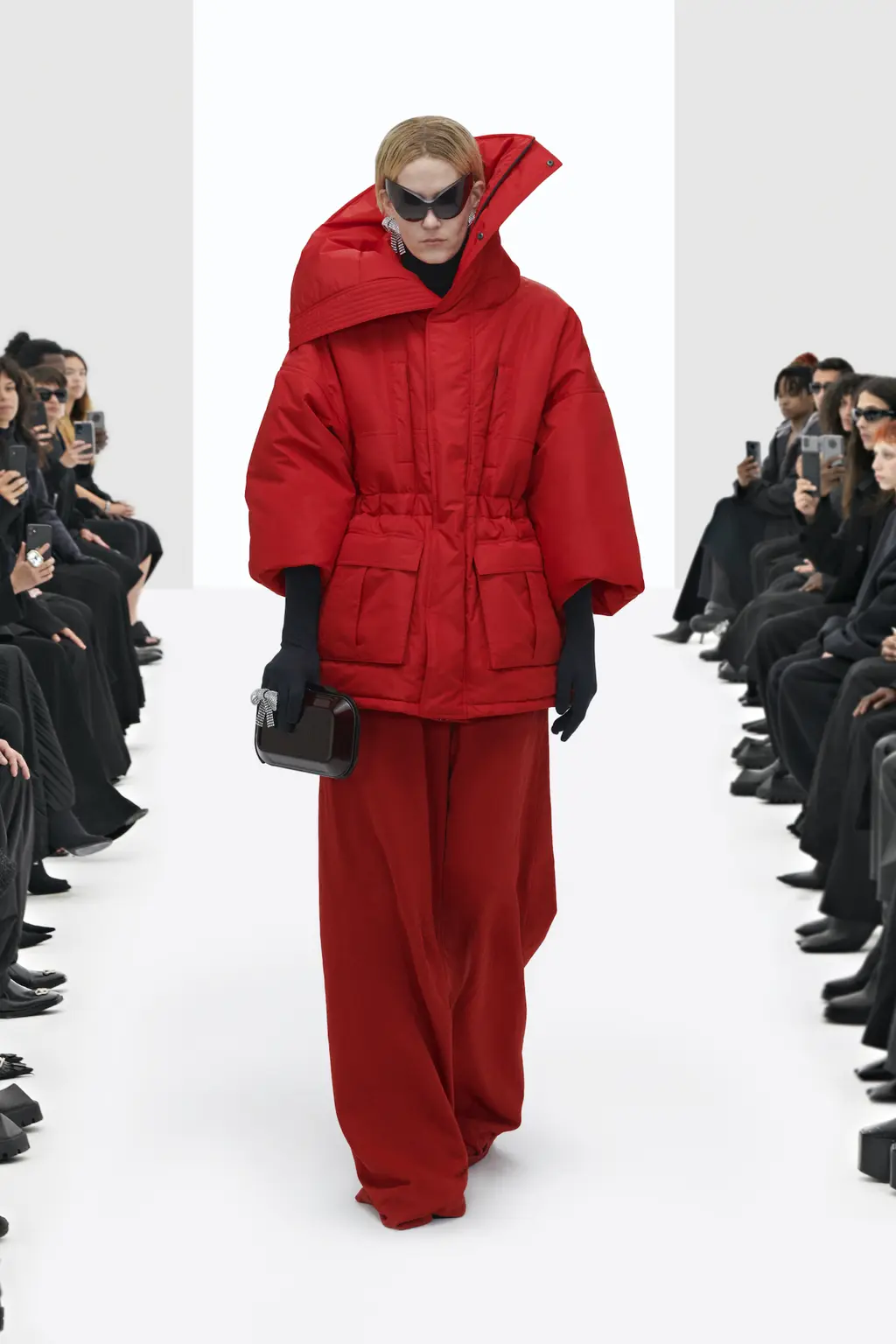 All-black looks were intersected with brightly coloured ones (fuschia, citrus yellow and cherry red) to express what Gvasalia has described as a deliberately hopeful emergence from our period of collective mourning.