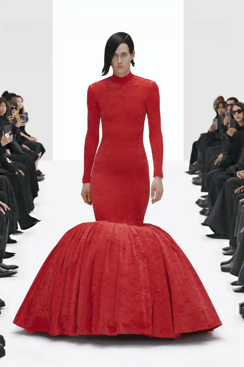 Most of the fashion, however, had Gvasalia written all over it, from a plethora of oversized, immaculately tailored coats to puffer jackets with huge, angular collars, utility trousers to hoodies (here, bearing the word “bebé” and The Simpsons family decked in Balenciaga). Dresses were flowing with bold prints or rendered as dramatically cut evening gowns. The final look – a copy of Divine’s bright red balloon dress from Pink Flamingos – was the real showstopper.