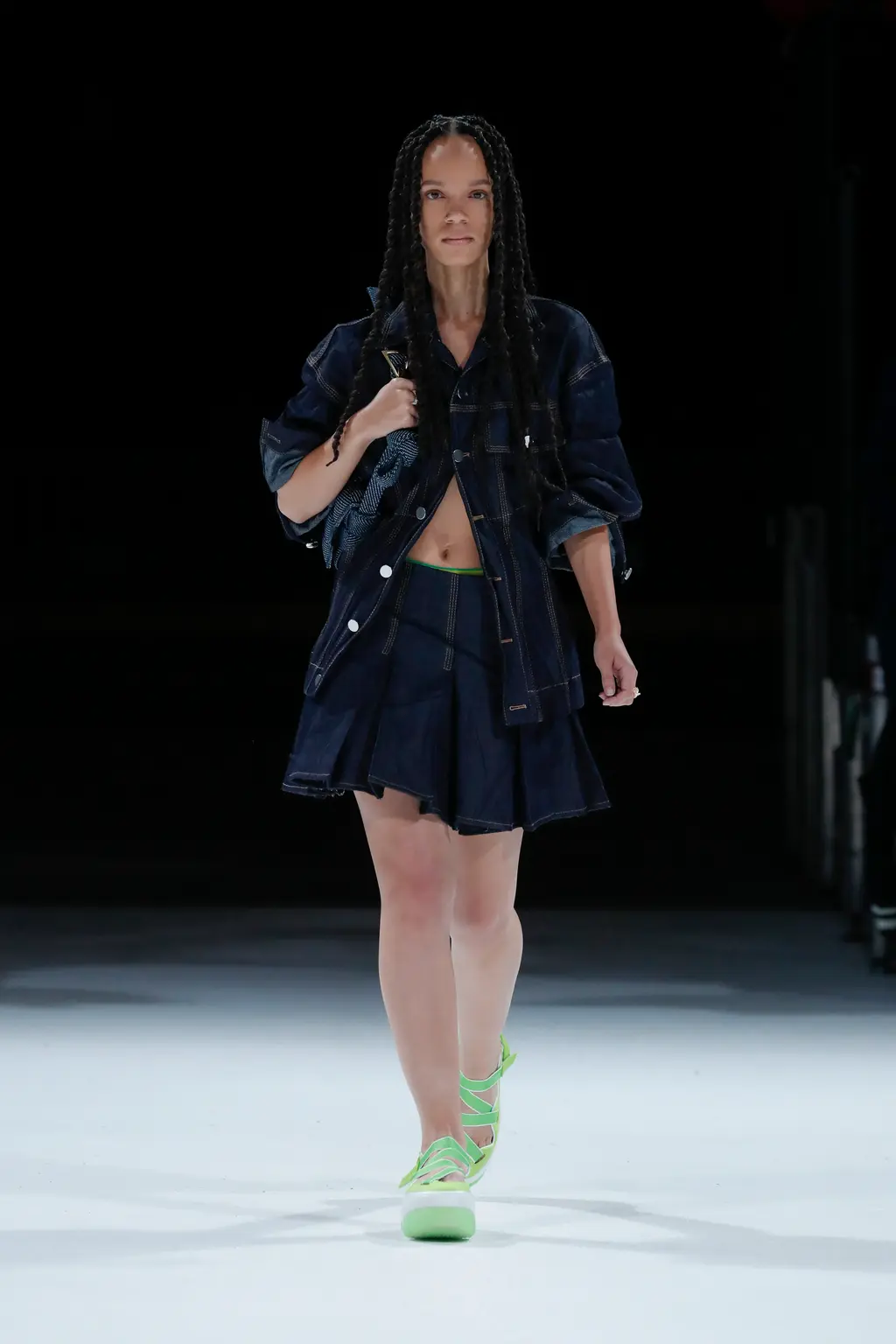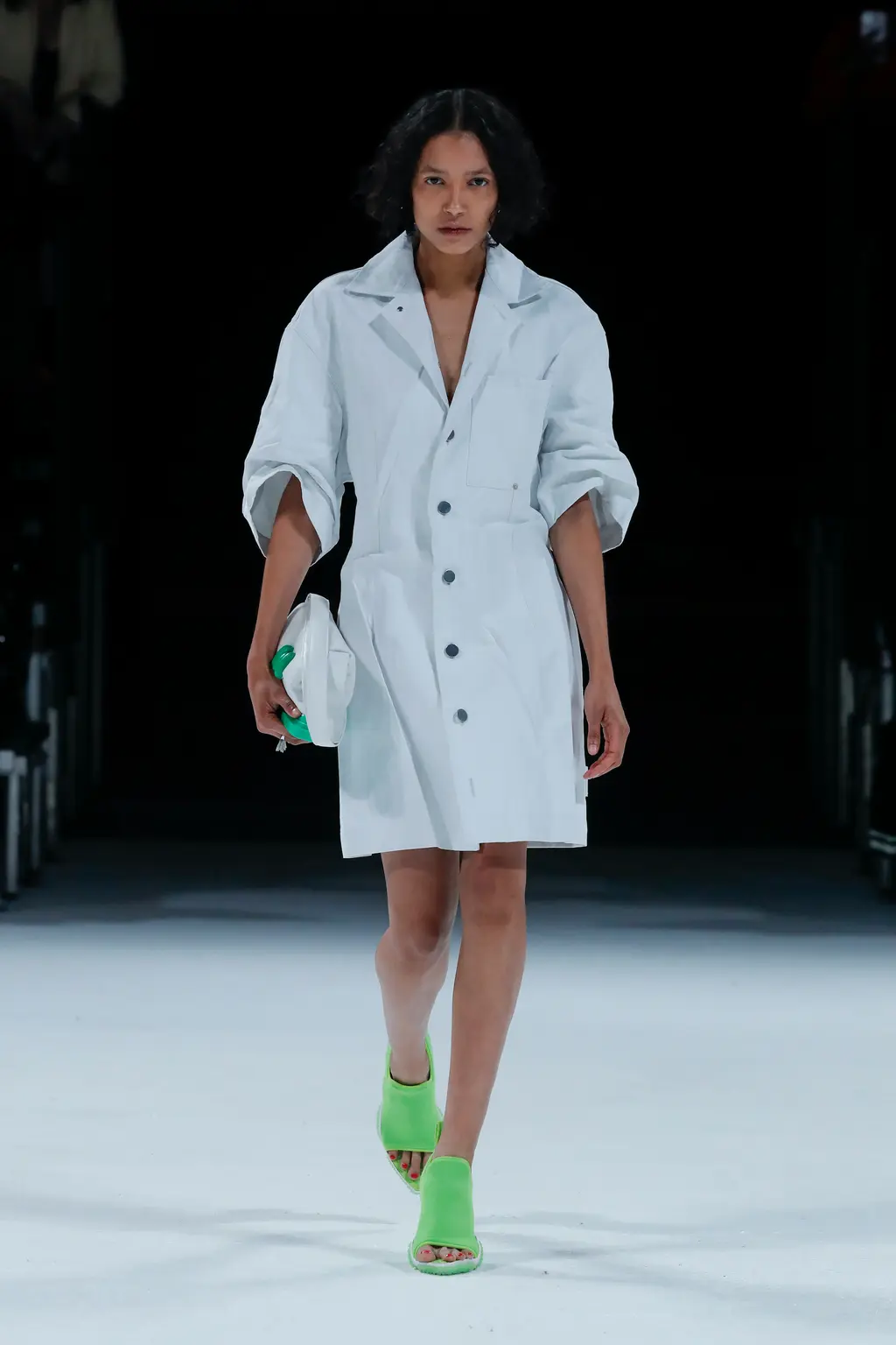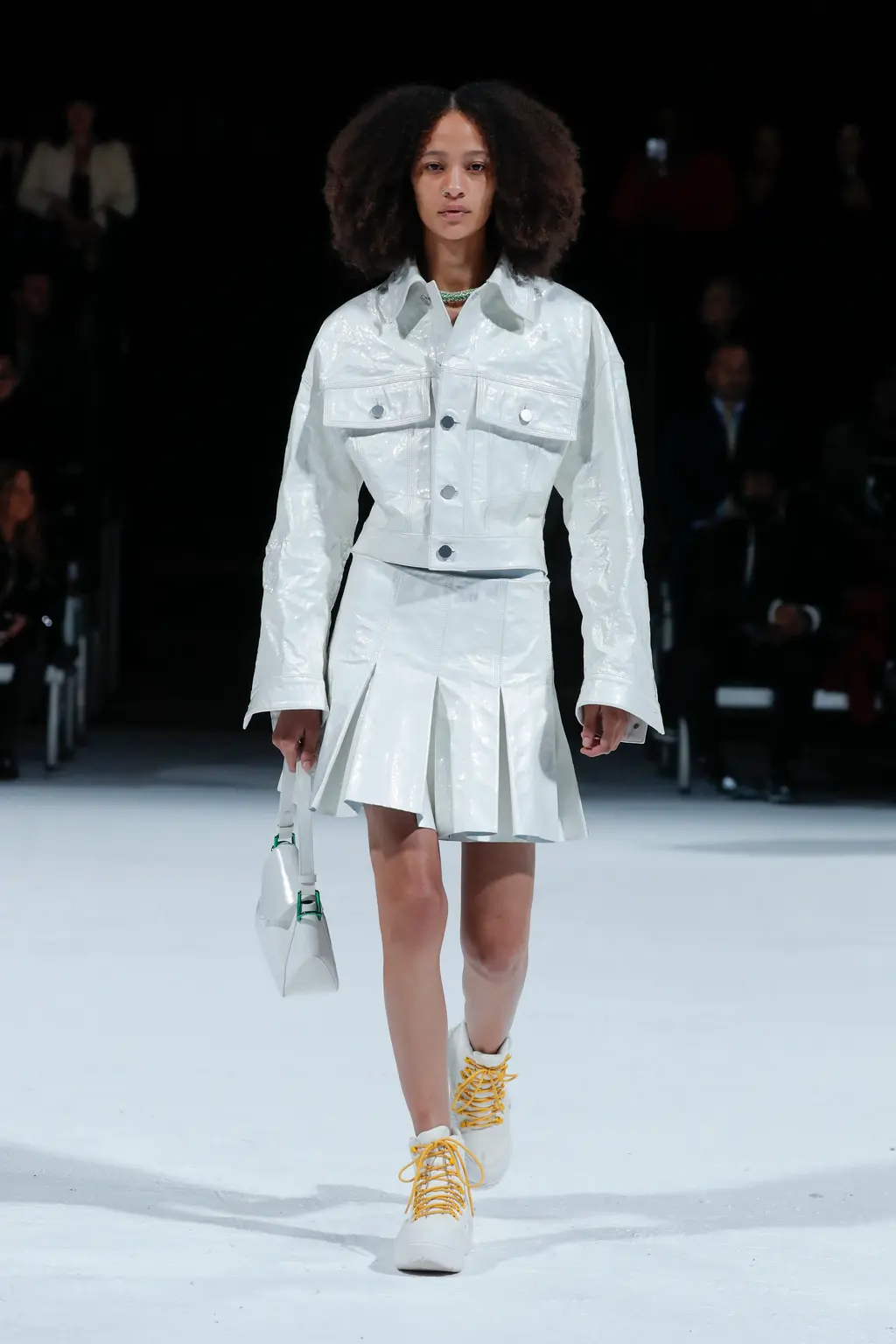 Accessories came in bright block colours, with bags ranging from woven clutches to vinyl shoppers, and footwear spanning puddle boots, clogs, chunky-heeled sandals and sneakers.