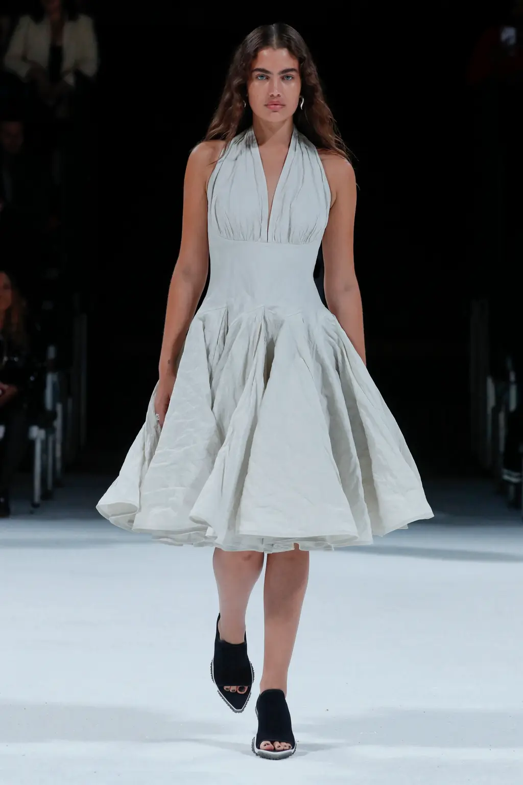 A muted palette of white, tan, black and navy was interrupted by moments of ballroom sheen: from chainmail and sequins (used for mini dresses in citrusy yellows and greens) through to a plethora of tactile, wet-look and metallic fabrics.