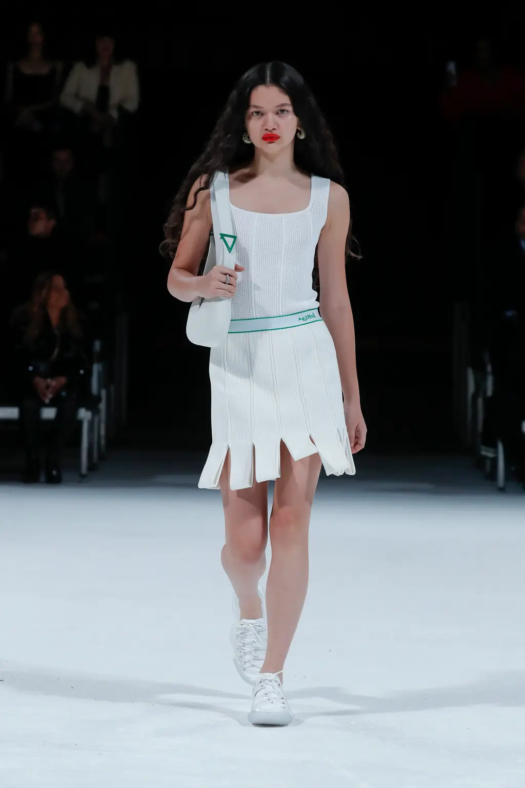 SS22 was a more restrained affair than Lee’s previous offering, with its abundance of feathers and strawberry-shaped fringed shearling coats, but it wasn’t without flair. The show opened with a number of slick, ivory-hued workwear ensembles (a matching jacket and trouser combo that would appear in various colours and fabrics throughout the show), interspersed with whimsical white dresses with flouncy skater skirts.