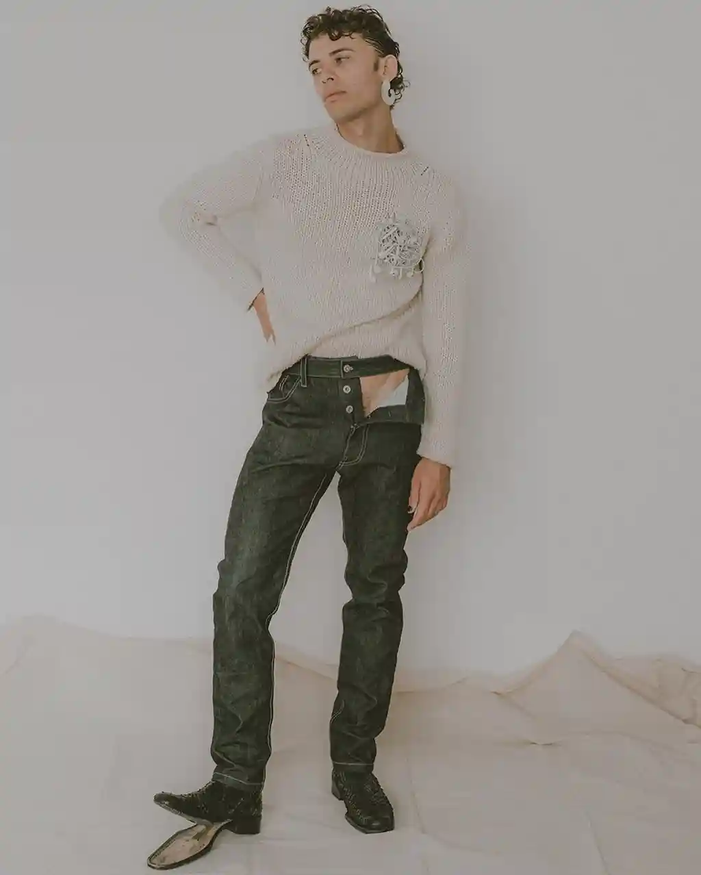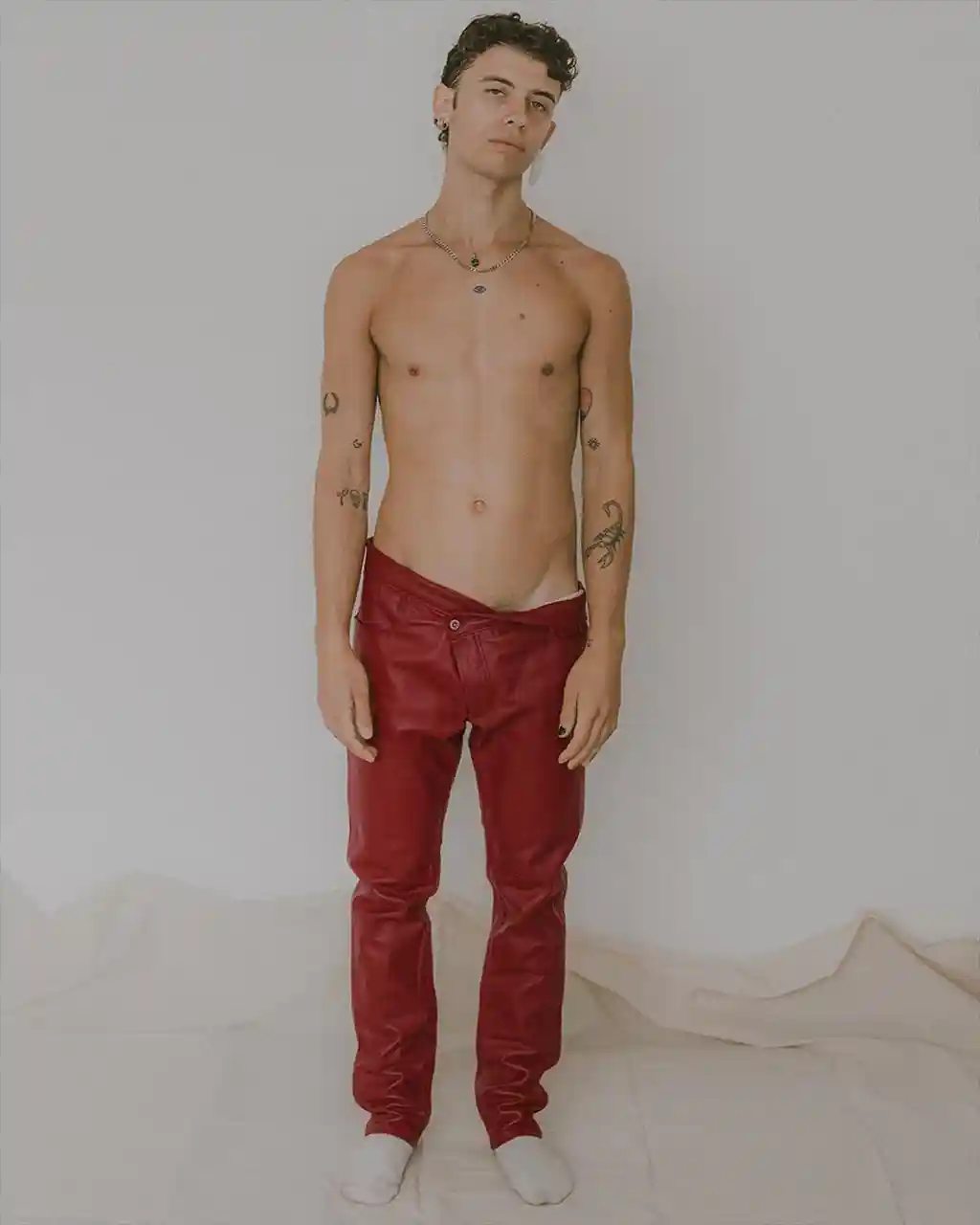 “My work references my own struggles and turns them into something beautiful,” he adds. So Esh’s menswear is ultra-sexy, with ’90s-style leather trousers, structural cream jackets, overdyed jeans and long-sleeved mesh tops, all worn with matted hair wax and the stench of the night before. “Some people make clothes to get you laid,” says Esh with a grin. “I think mine are more inspired by the next day when you regret it.