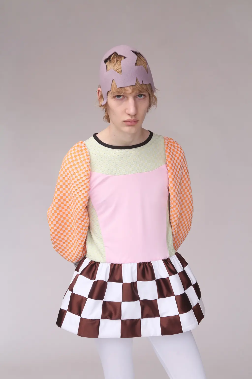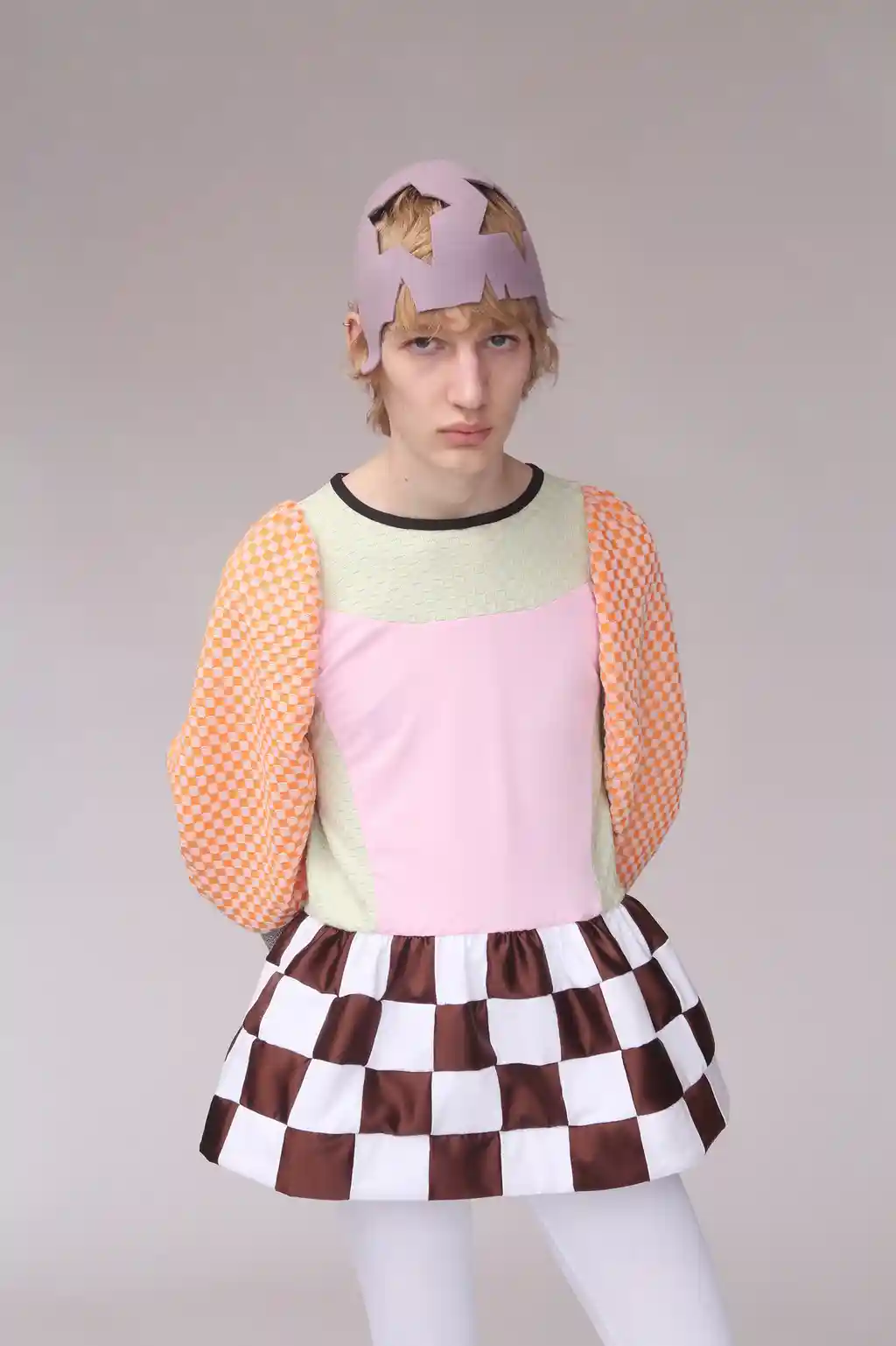 “I tried to design menswear that isn’t scared of colour, humour or tenderness, ’cause there’s nothing to be scared of,” he states. In his final collection, the 27-year-old featured a dreamscape of surreal patterns, feminine shapes, vibrancy and rah-rah skirts, worn by angelic, blonde-haired boys. His work explores “the concept of identity and alter-ego,” and, through purple tights, maximalist sleeves and star-shaped motifs, Gronau’s ethos encourages men to reveal who they are or who they want to be.