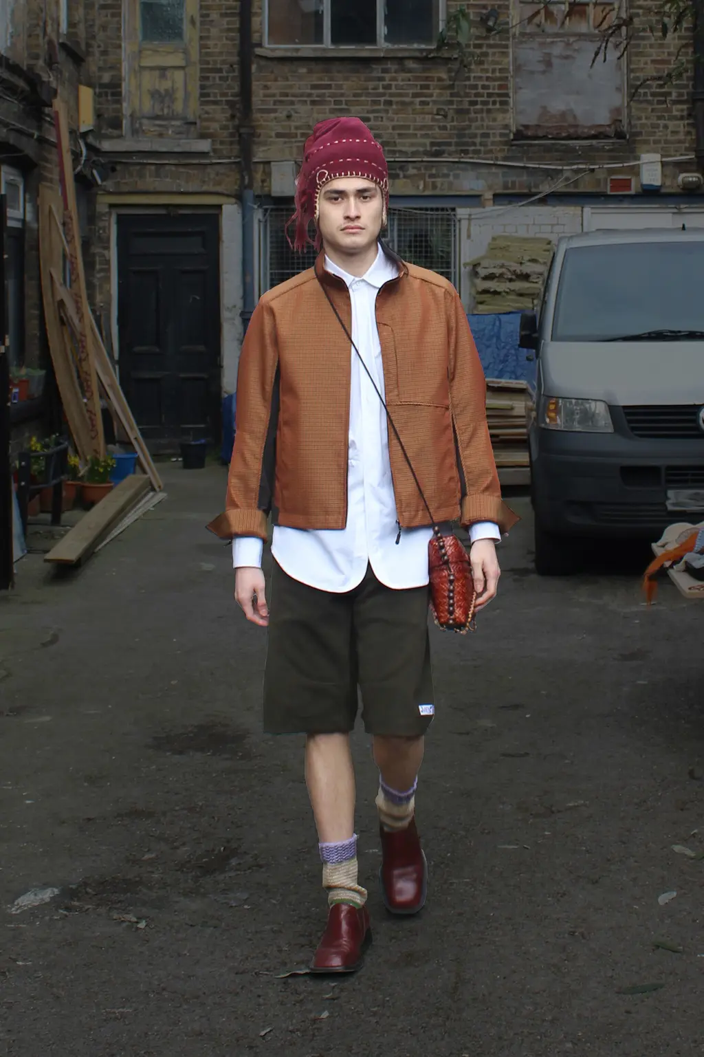 “My work explores why men struggle to talk about climate change, since it requires care,” he explains. Through references to the great outdoors, soft finishings, practical windbreakers and micro shorts, Howe takes inspiration from the very men he grew up around. This meant that his collection “became deeply British. [It’s about] that British stiff upper lip that tells us ‘everything’s fine’ when actually, we’re in turmoil.”