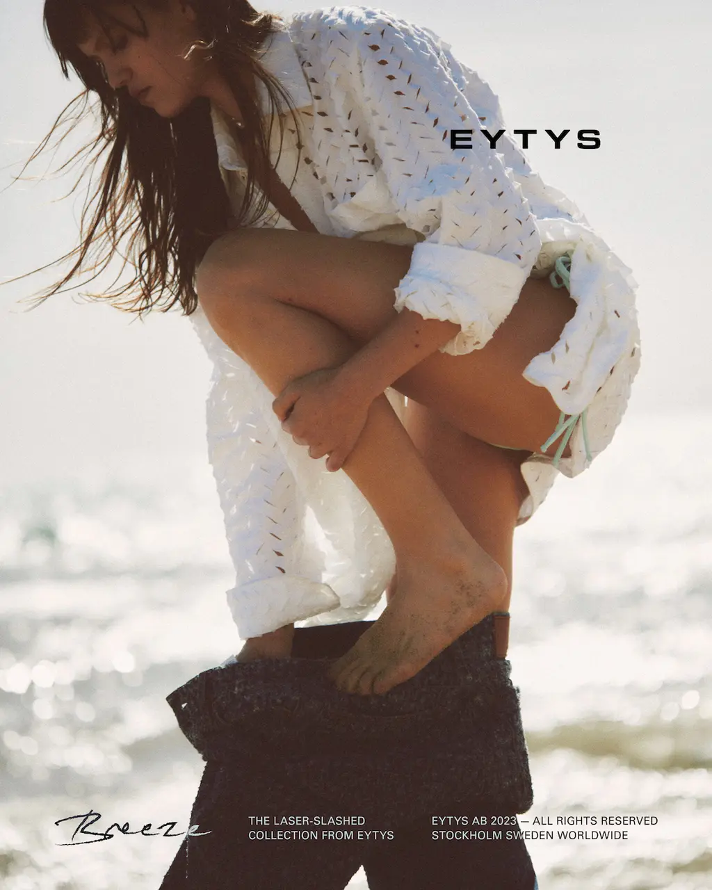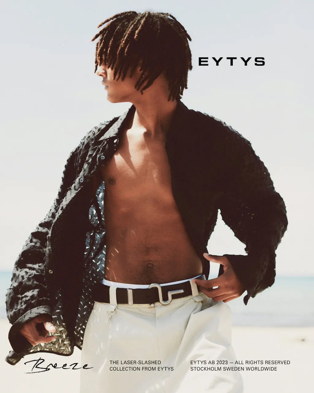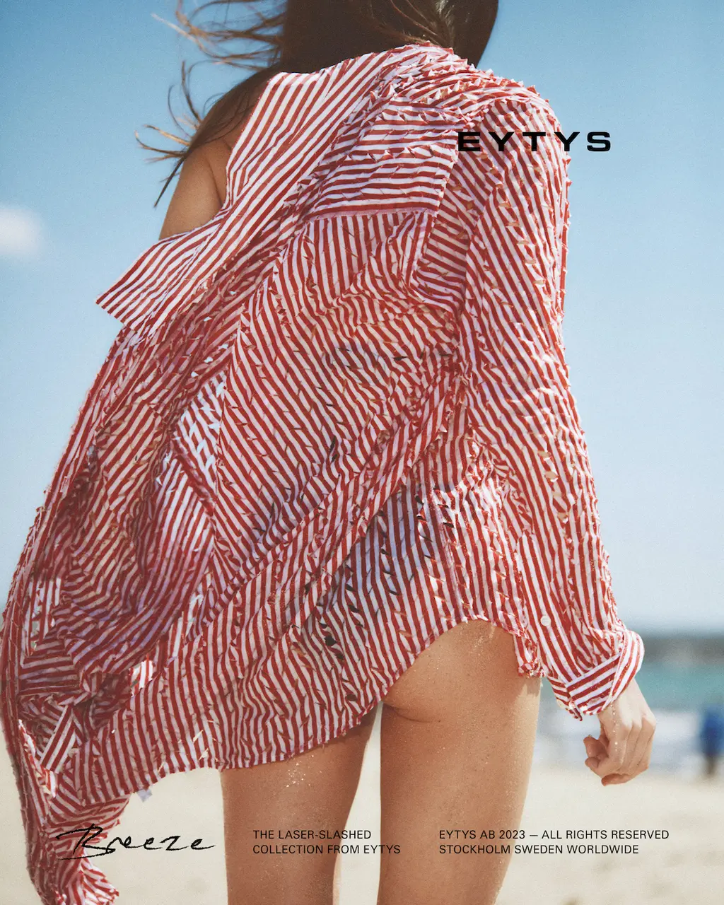 While we’re on the topic of summer, Eytys has launched its Breeze collection, a light and fresh mix of unisex silky poplin shirts, laser-slashed tops that cheekily play with transparency and a new take on the Stockholm brand’s signature Benz jeans. This season, they come in indigo denim and feature a laser torn surface that mimics soft bouclé in a psychedelic bleached tie-dye pattern.