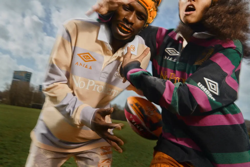 As part of the second instalment of Aries and Umbro’s collaboration, the duo delved into the scrum and got inspired by the blood, sweat and tears of rugby. Featuring Aries’ much-loved dying techniques, the capsule collection includes two classic rugby shirts, cotton drill track pants and shorts, as well as neon and deep navy rugby socks. A beyond stellar campaign ties it all together, shot by legendary photographer and THE FACE contributor Elaine Constantine.