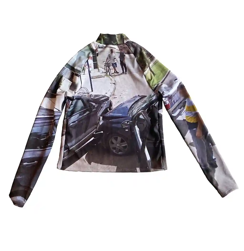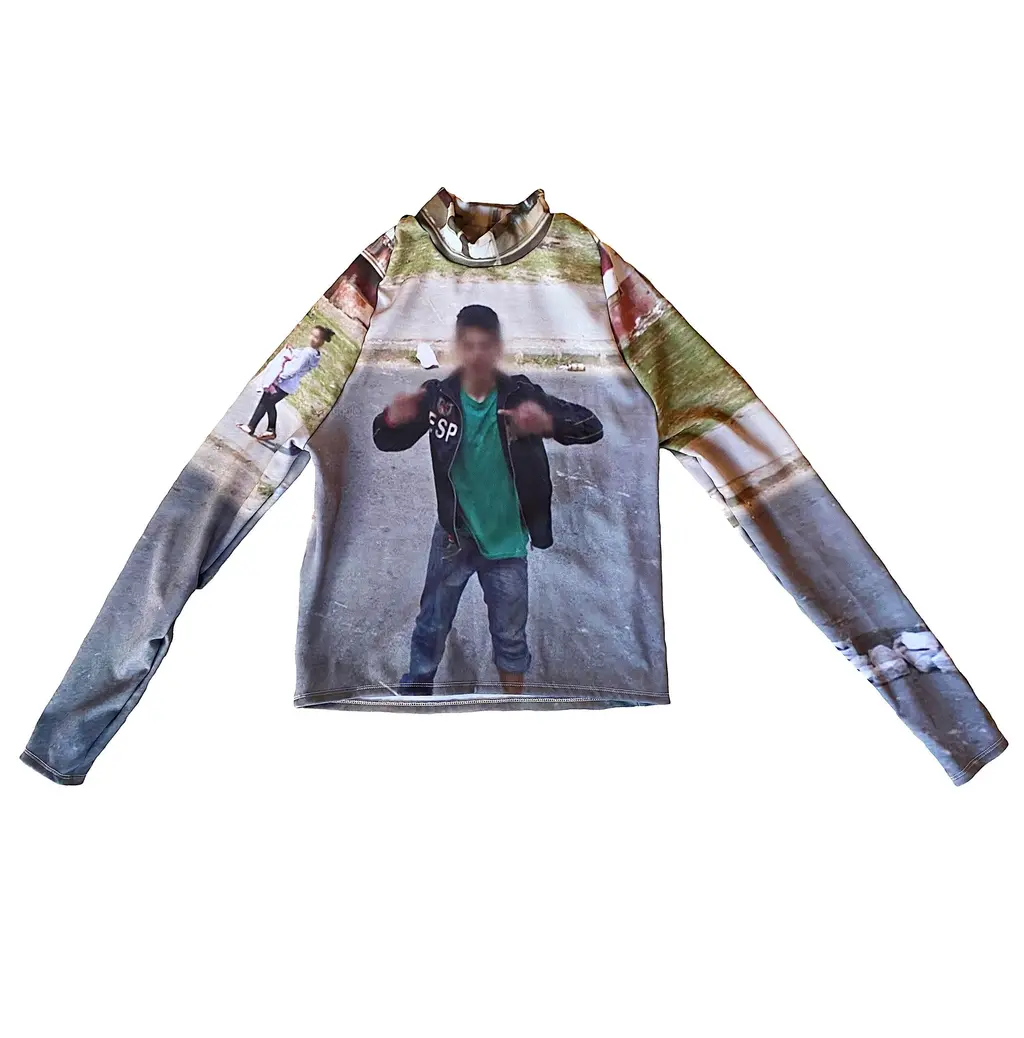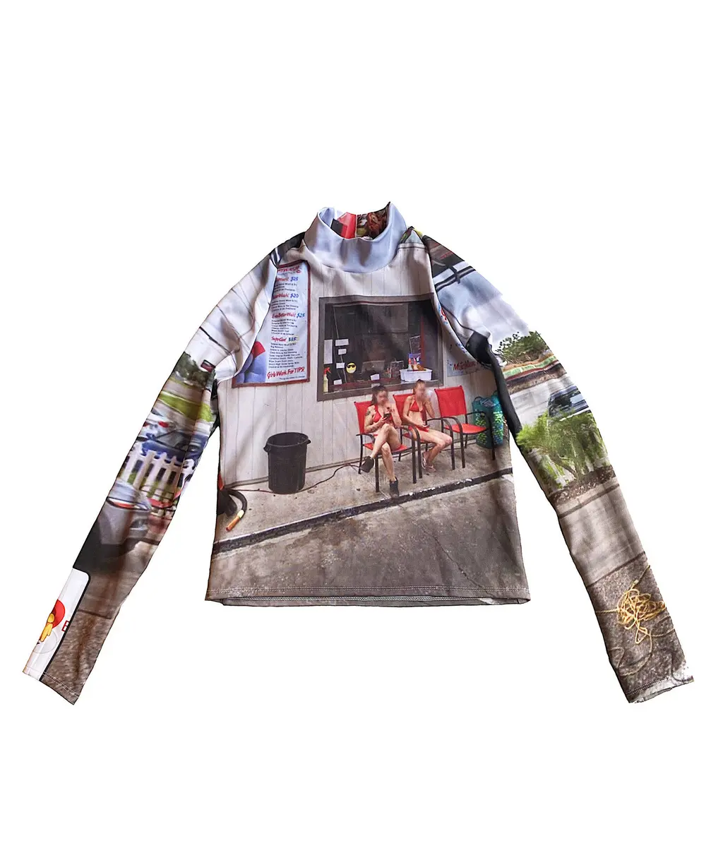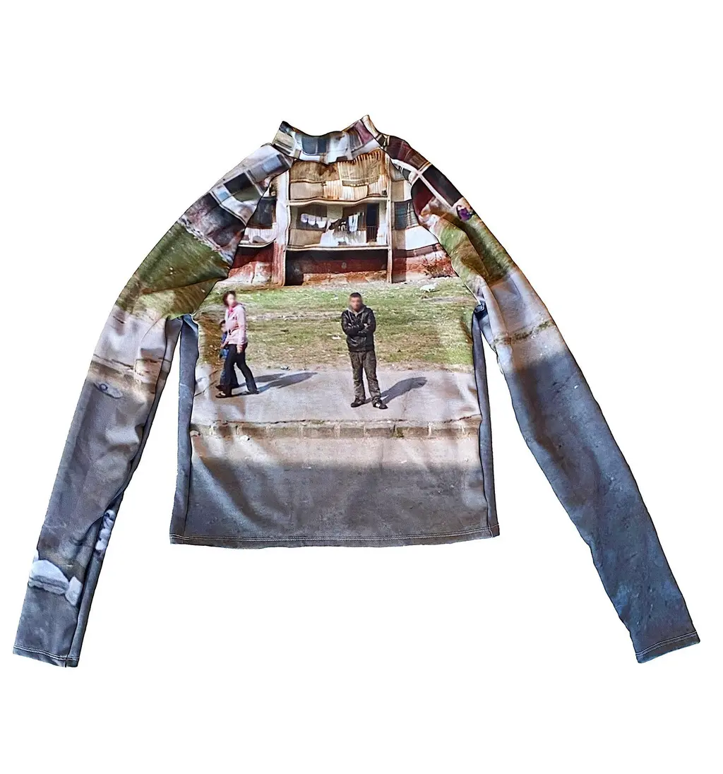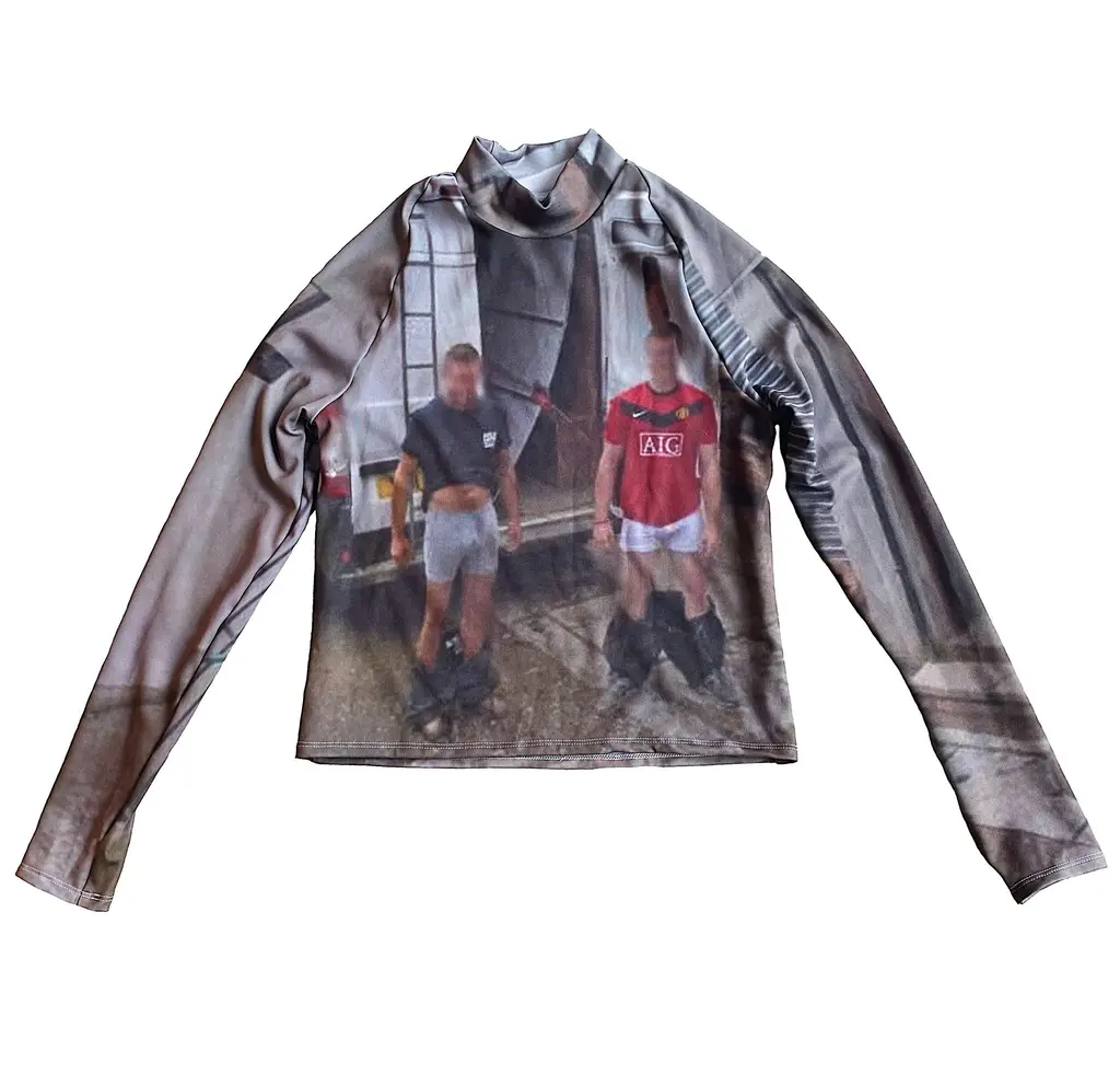 “Honestly, the concept came to me when I was sat in bed, super hungover, just looking through weird stuff to try and cheer myself up,” explains Yates, who after getting herself into a strange internet hole one night in 2019, decided to make two Lycra tops emblazoned with a lad she found flipping off the Google Maps camera as it drove past him.