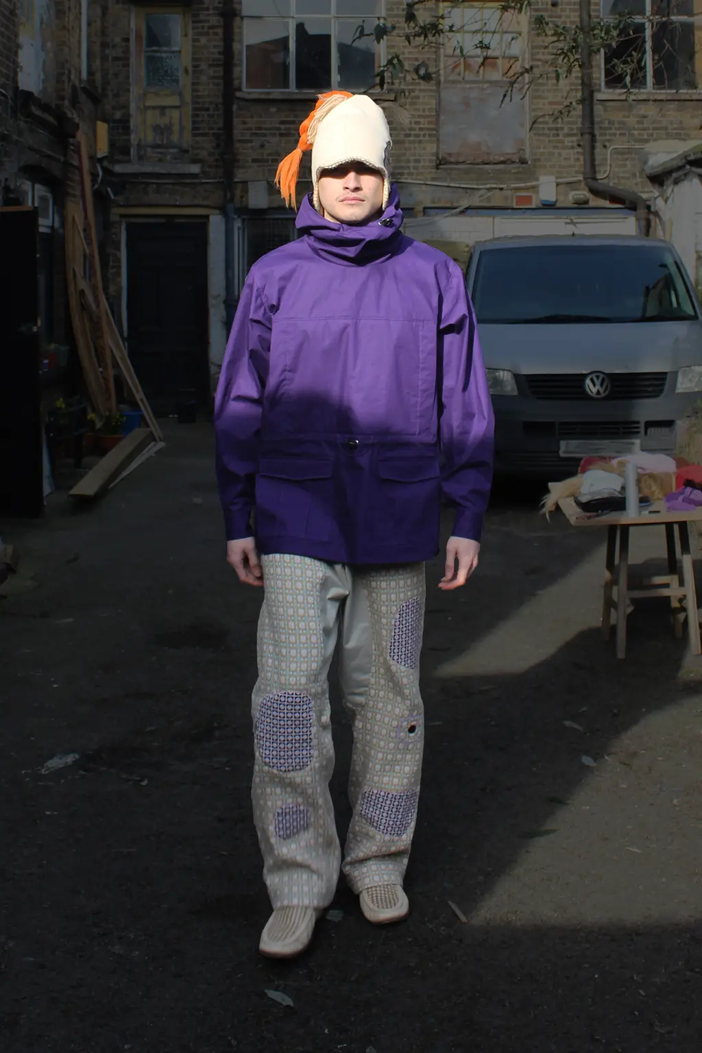 Jimmy Howe, who graduated from Central Saint Martins’ MA Menswear course last year, takes his “Men Who Care” label statement as a literal reflection of his customers’ caring for the world around us. Back in April, he told THE FACE, “My work explores why men struggle to talk about climate change, since it requires care.” His materials are sustainably sourced and carry his love for the outdoors into the garments. Often, he’ll photograph boys wearing his practical windbreakers, pullovers and waterproof trousers while trekking up Ben Nevis or mountains in Iceland. Howe’s designs are functional but, when interspersed with floral prints on fleeces, micro shorts and block-coloured cycling shorts, they become progressive, challenging masculine lines and classic styles like tailored trousers and clean white shirts. Somehow, functionality becomes as cool as a tracksuit.