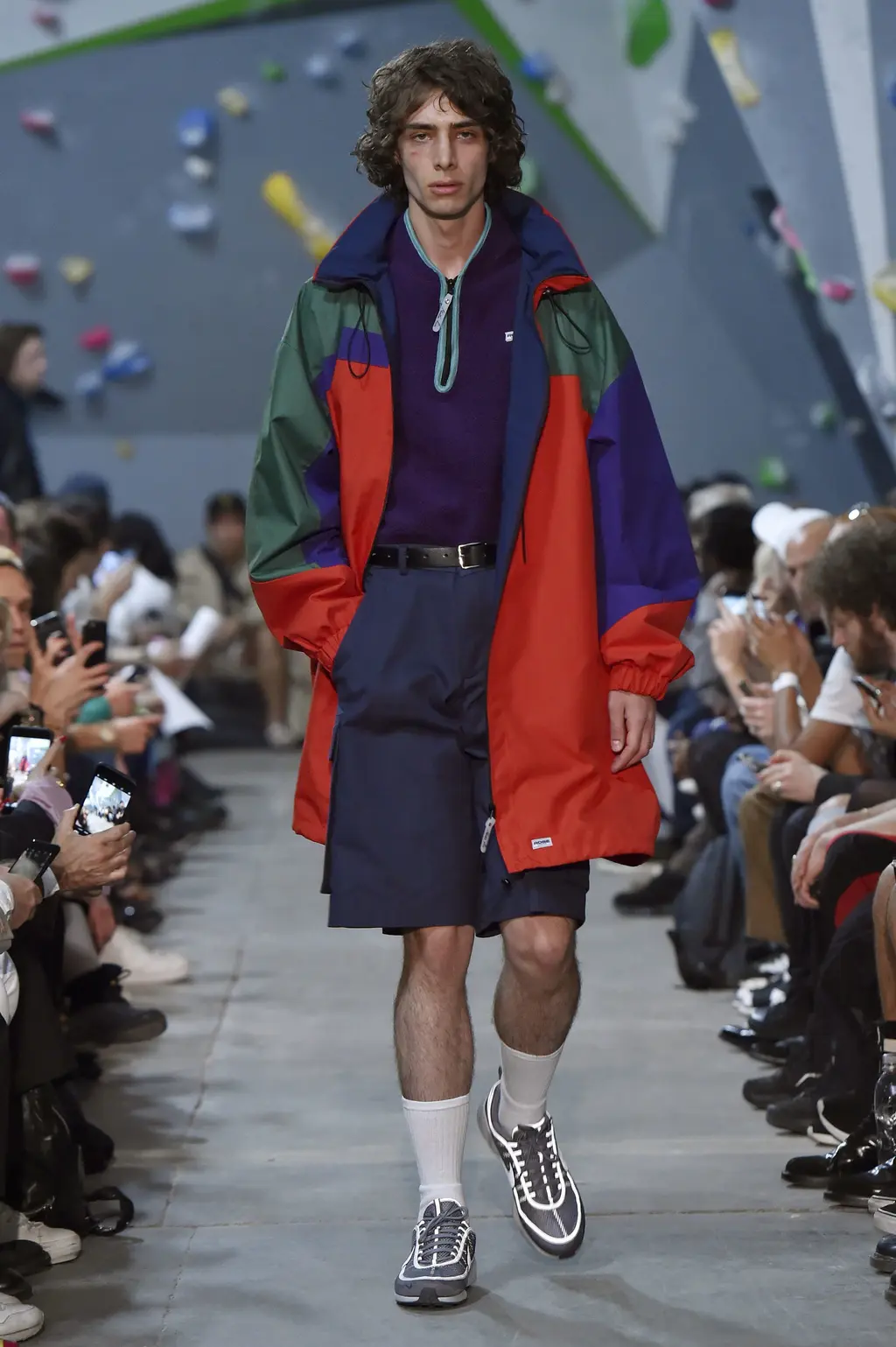 A season later, Martine Rose took us on a school trip to a rock climbing arena for SS18. In a show lauded for its painfully subversive take on classic dressing – like oversized tuxedo jackets paired with cycling shorts and python loafers – camp-wear became cooler. Knee-length cargo shorts and high socks, casual waterproof jackets hung over shoulders, and hair centre-parted and slicked down as though sodden, Rose’s boys looked cool – really cool – and gave way to a legion of art-school kids donning knee-length Columbia parkas found in charity shops for under a tenner.